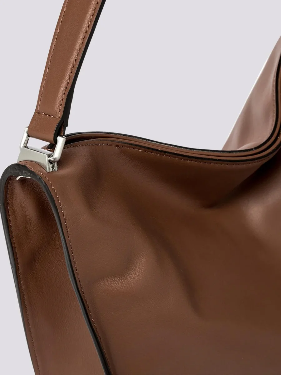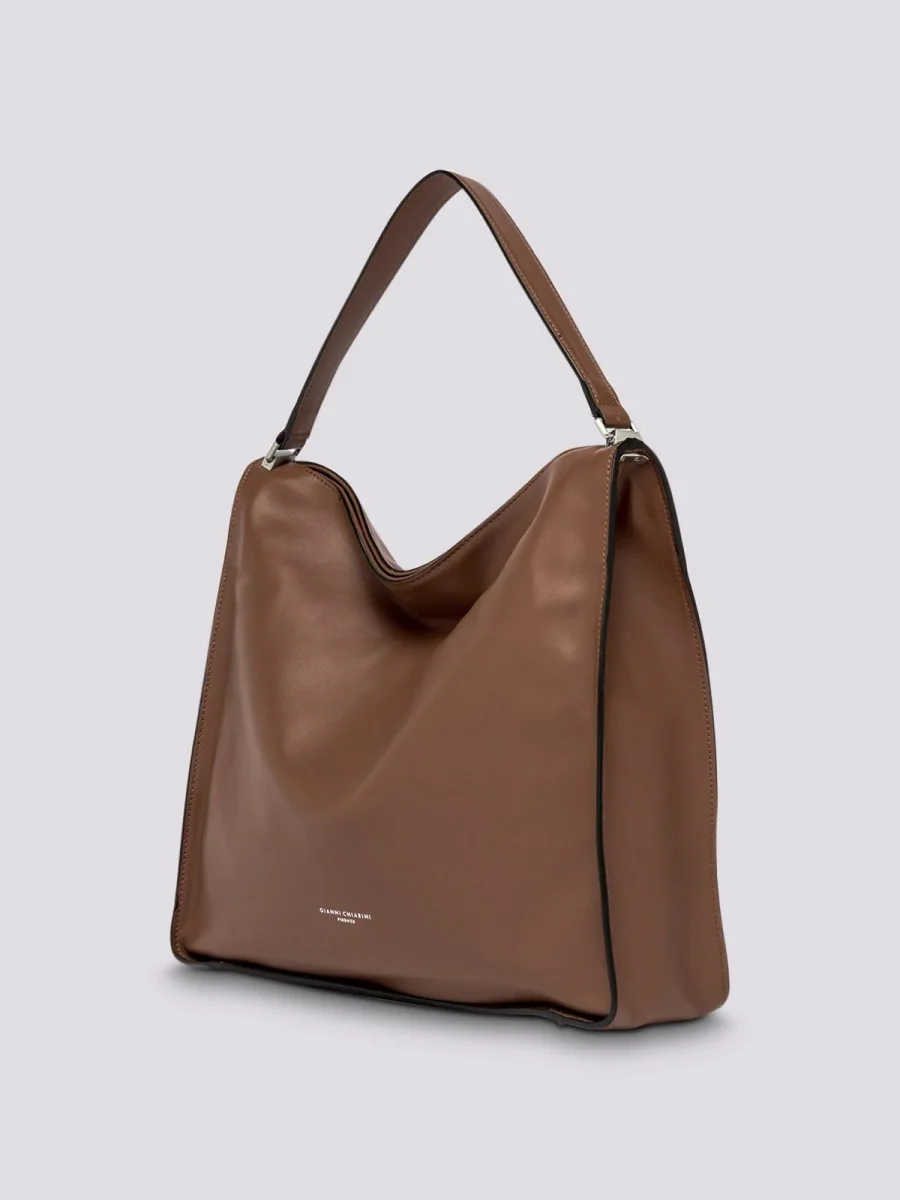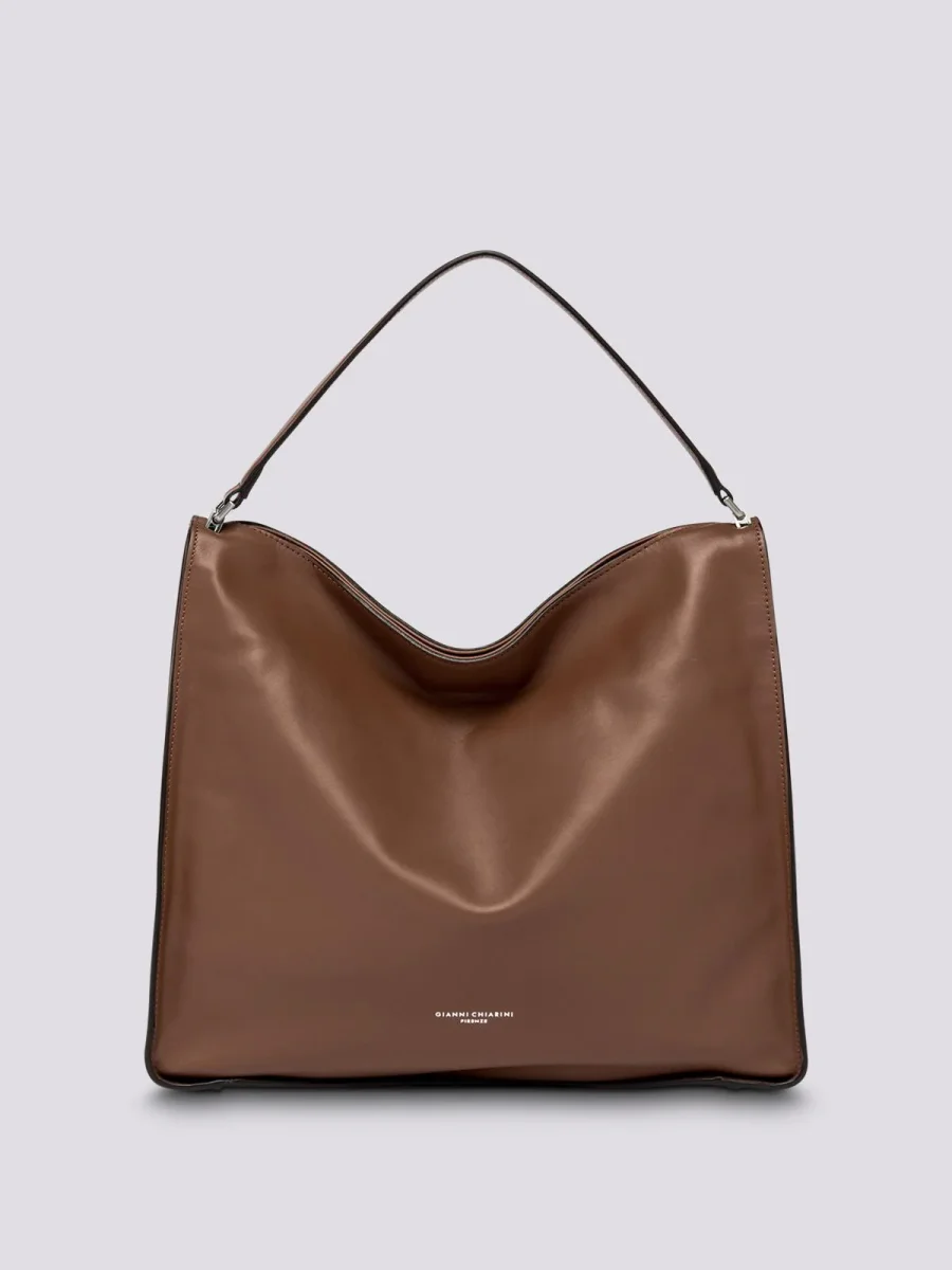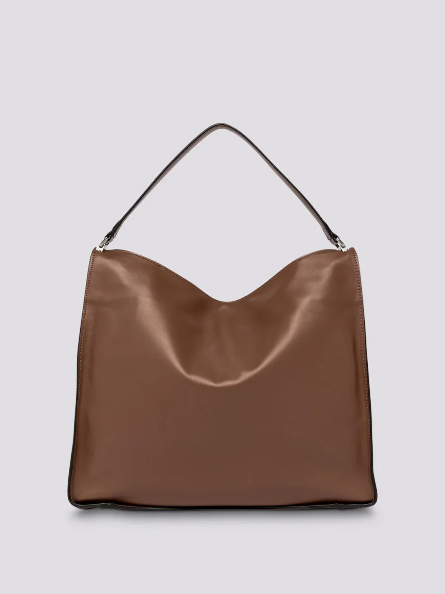 Borsa a spalla Renè large in morbida nappa, borsa a spalla con manico in sugherite rivestito in pelle. All’interno tasca con zip e tasca piatta, fodera in tessuto, chiusura con calamita a scomparsa. Dimensioni: 39x31x10 cm.