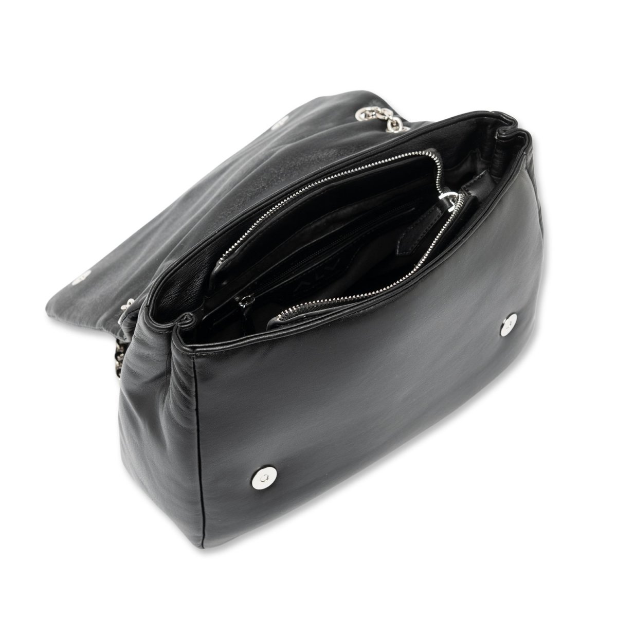 Dotata di catena con spallaccio in coordinato, chiusura a patta con bottone magnetico e interni foderati con scomparti e tasca zip, offre comfort e praticità senza rinunciare all’eleganza.