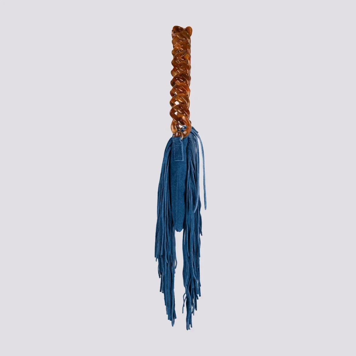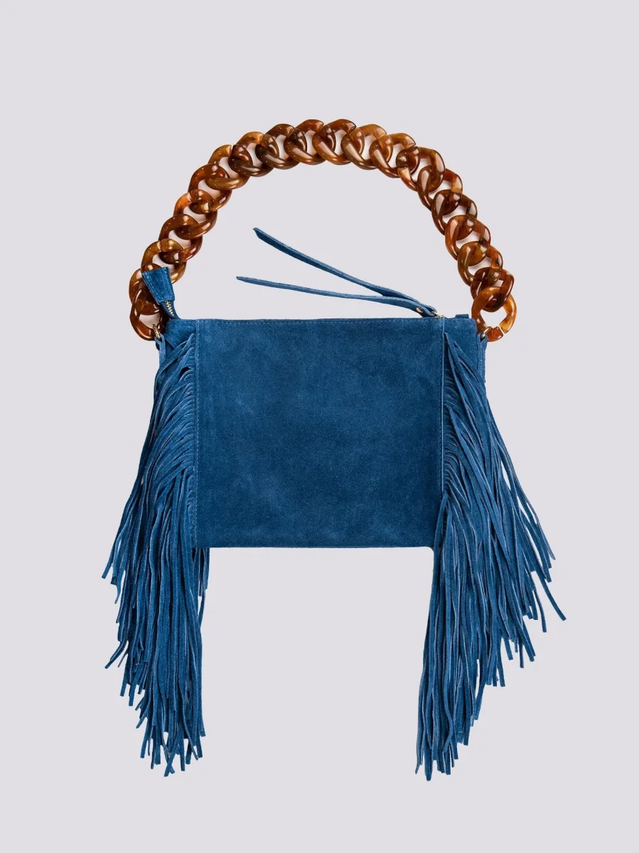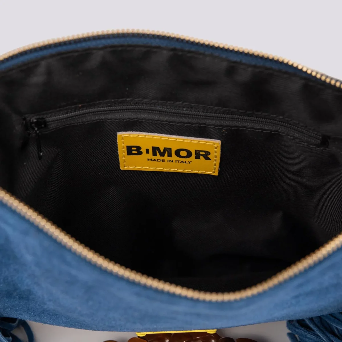 Borsa a tracolla in camoscio blu jeans con frange “Flappy”. Un nuovo modello firmato BiMOR dedicato a tutte le amanti delle frange. Tracolla in acetato ad anelli marrone. Dettaglio frange su entrambi i profili del corpo borsa. Chiusura zip in metallo. Taschino interno porta cellulare. Placchetta gialla lucida in metallo con logo a contrasto. Fodera interna in tessuto nera.