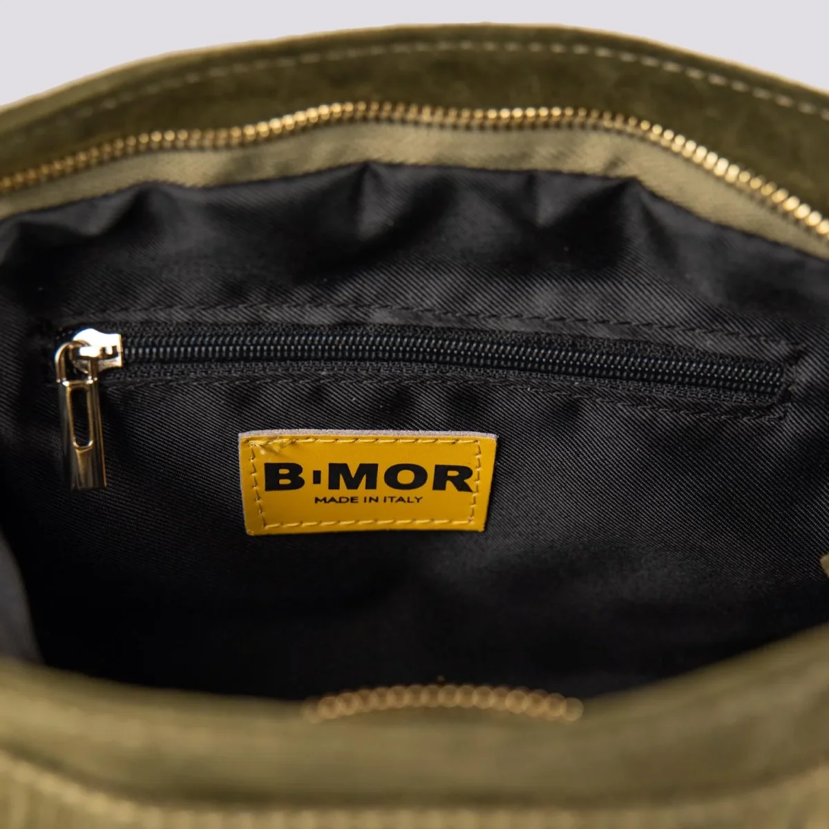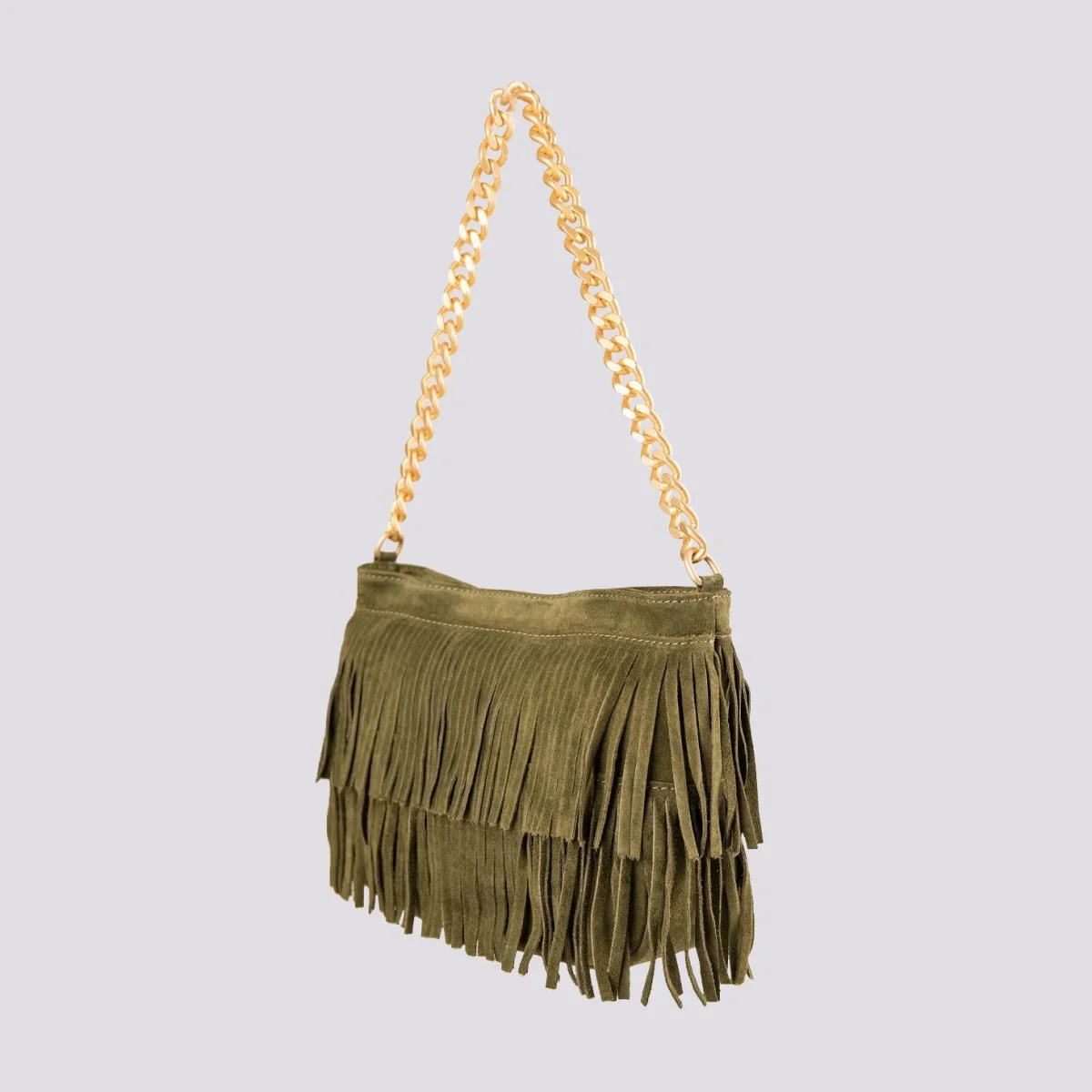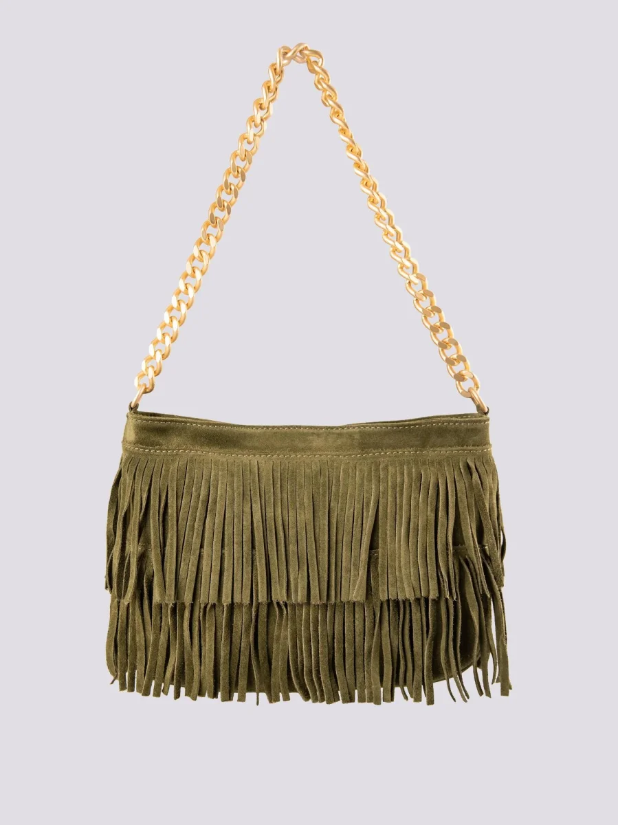 La borsa a tracolla con frange più apprezzata di BiMOR torna disponibile per la stagioneAutunno Inverno 2023-24. Disponibile in più varianti colore, questa borsa in camoscio color verde militare può essere indossata a spalla con l’apposito manicotto in catena o a tracolla grazie alla pratica tracolla in cotone rigenerato con logo stampato in tonalità. Tasca interna con chiusura a zip in metallo. Fodera interna nera. Logo interno stampato su inserto in pelle.