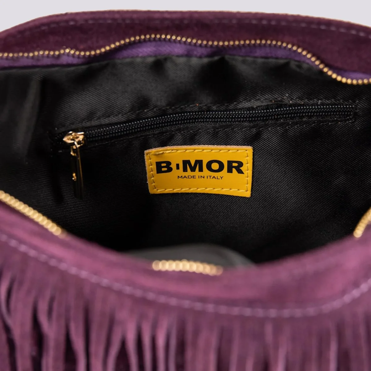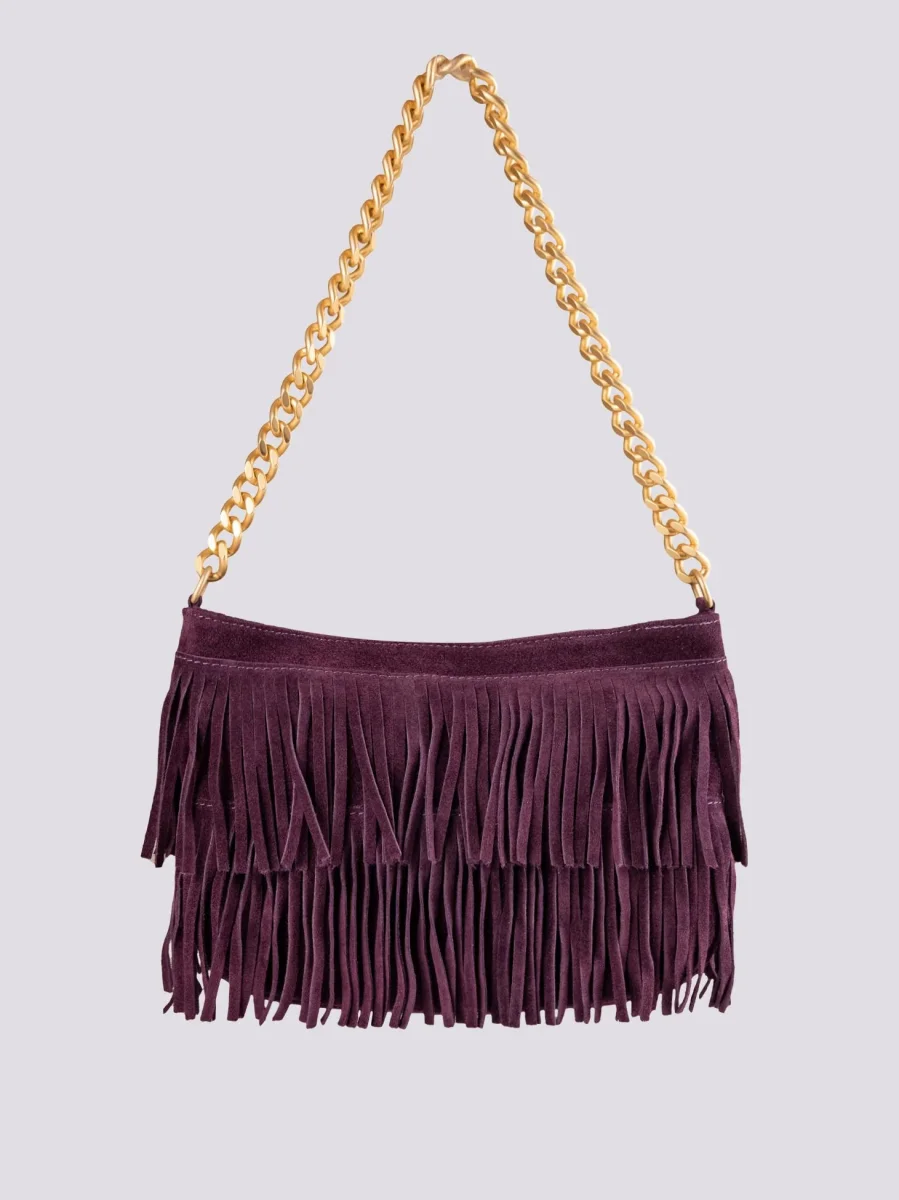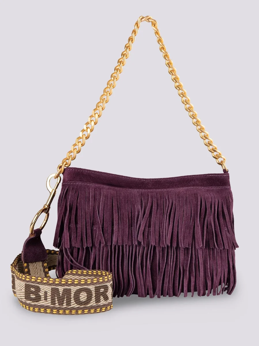 La borsa a tracolla con frange più apprezzata di BiMOR torna disponibile per la stagione Autunno Inverno 2023-24. Disponibile in più varianti colore, questa borsa in camoscio color viola può essere indossata a spalla con l’apposito manicotto in catena o a tracolla grazie alla pratica tracolla in cotone rigenerato con logo stampato in tonalità. Tasca interna con chiusura a zip in metallo. Fodera interna nera. Logo interno stampato su inserto in pelle.