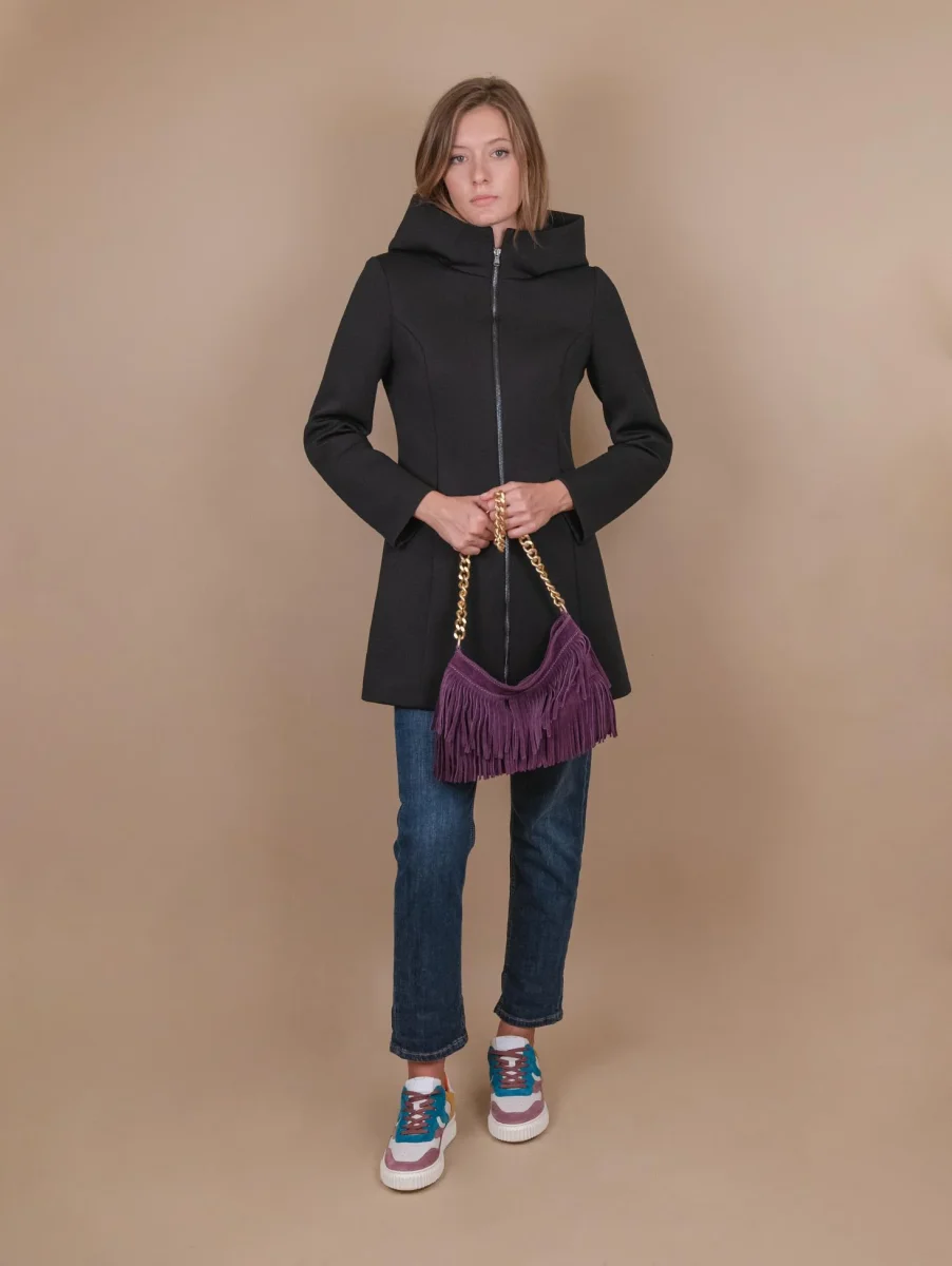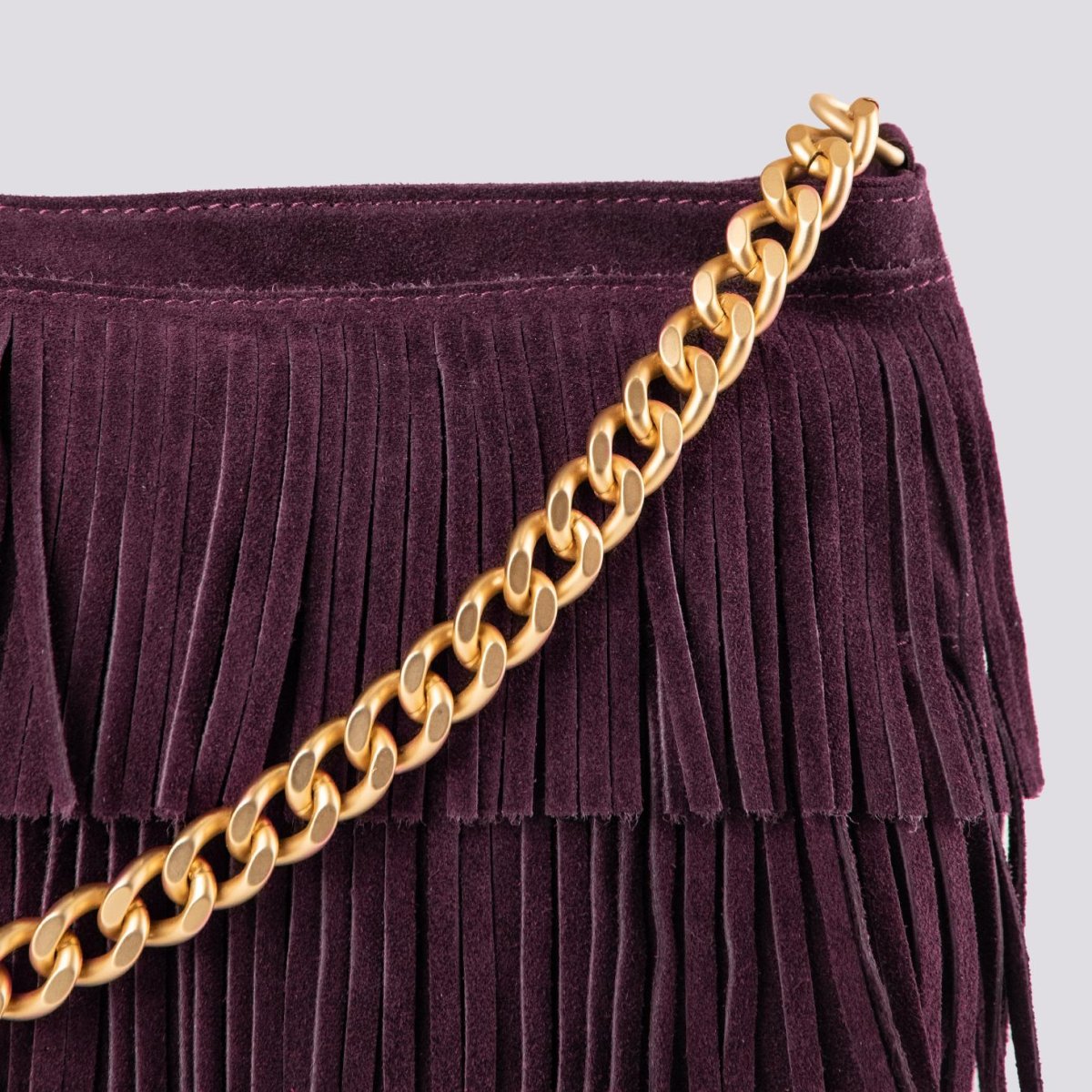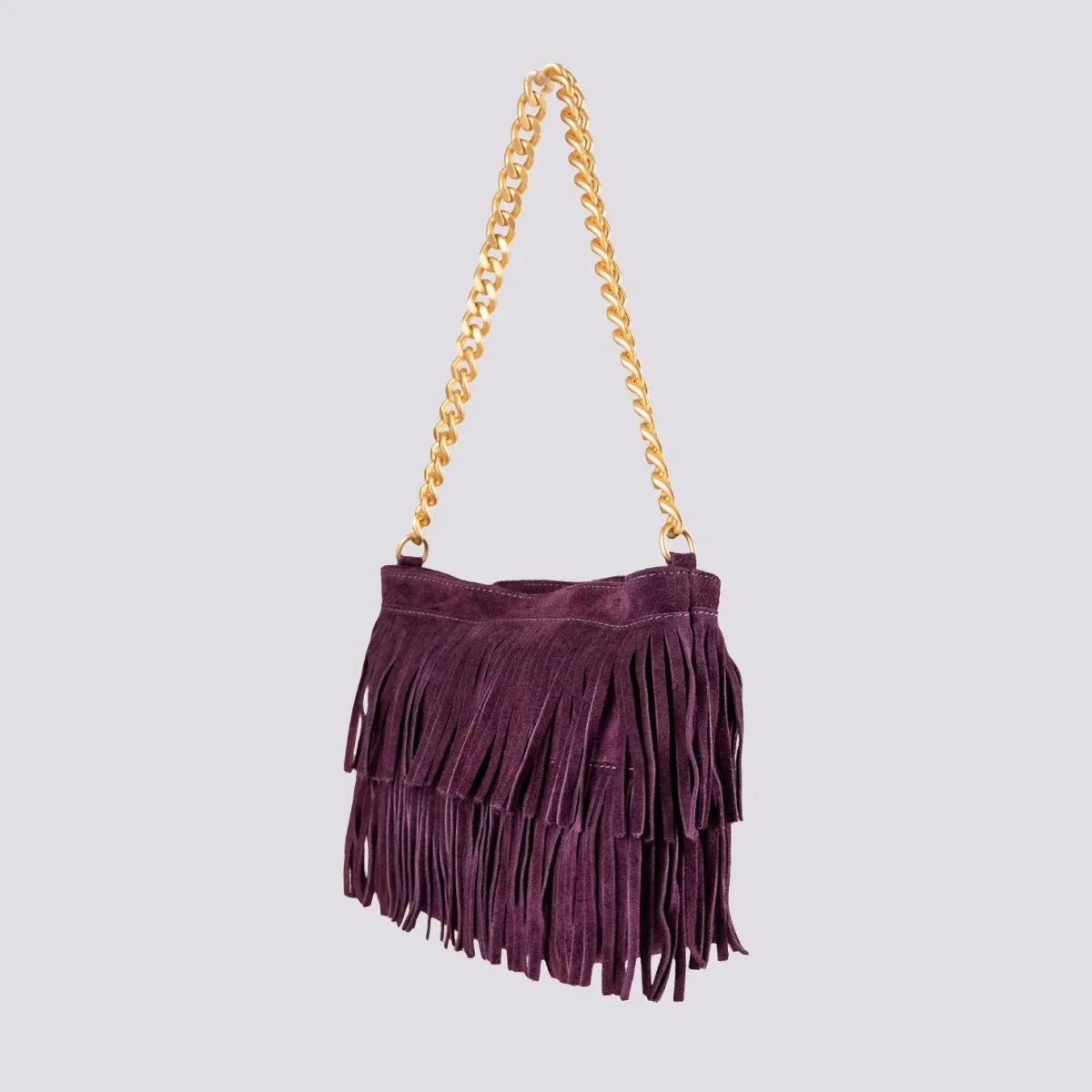 La borsa a tracolla con frange più apprezzata di BiMOR torna disponibile per la stagione Autunno Inverno 2023-24. Disponibile in più varianti colore, questa borsa in camoscio color viola può essere indossata a spalla con l’apposito manicotto in catena o a tracolla grazie alla pratica tracolla in cotone rigenerato con logo stampato in tonalità. Tasca interna con chiusura a zip in metallo. Fodera interna nera. Logo interno stampato su inserto in pelle.