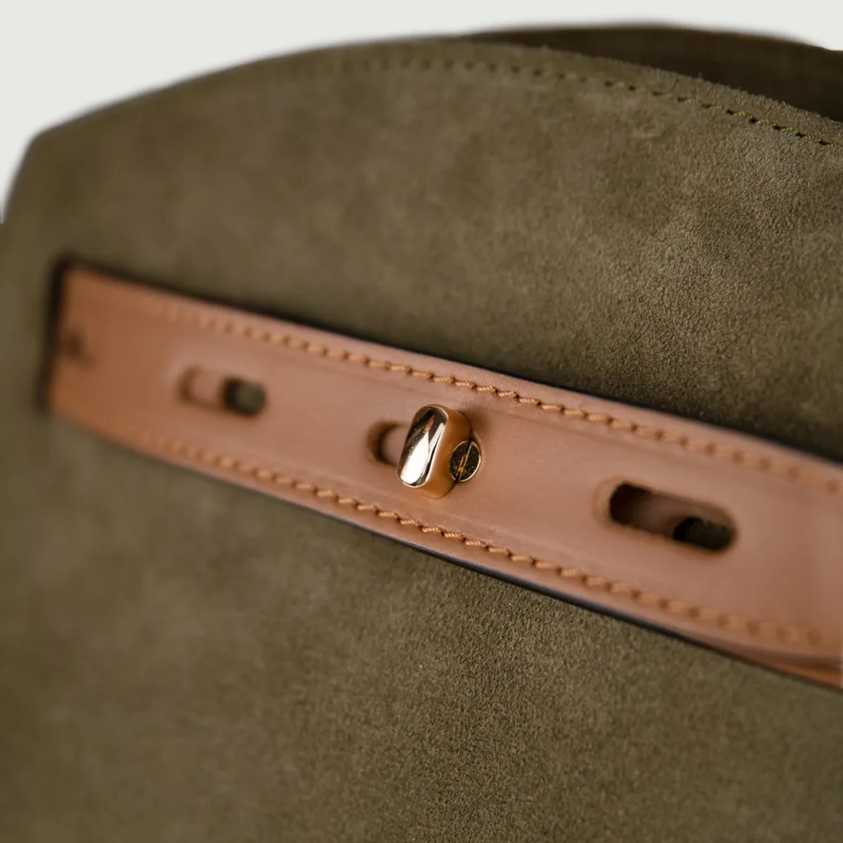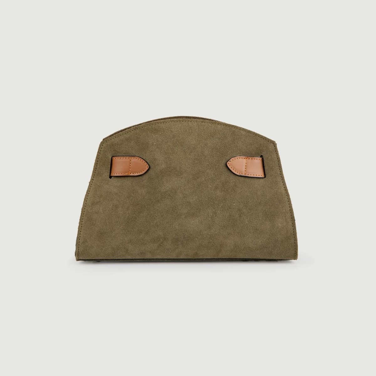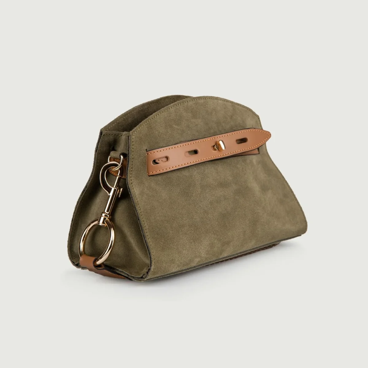 Borsa a tracolla in camoscio verde militare con inserti in pelle a contrasto “Soph”