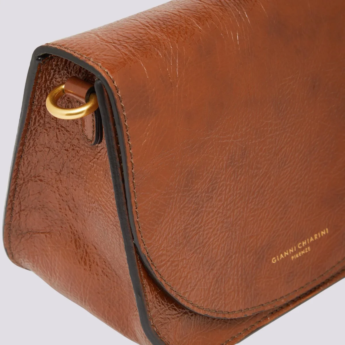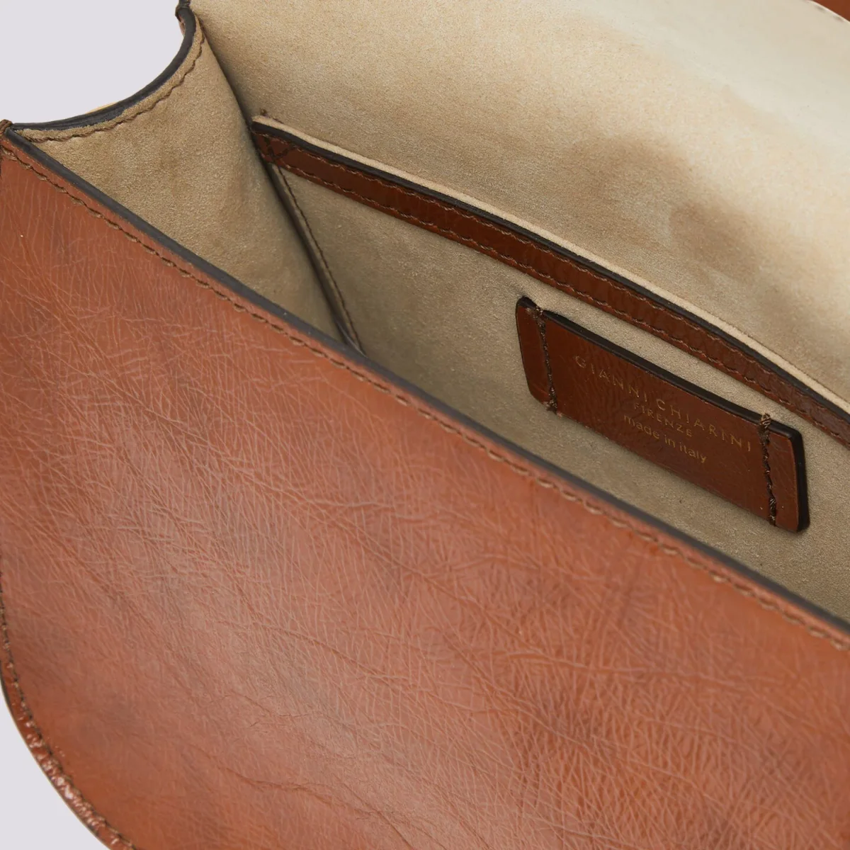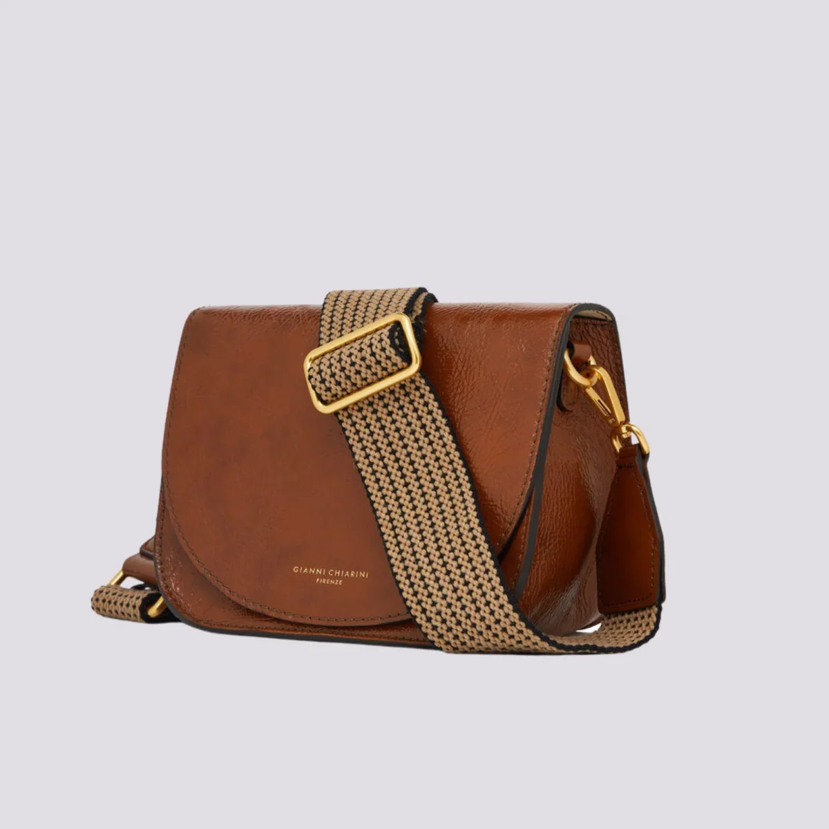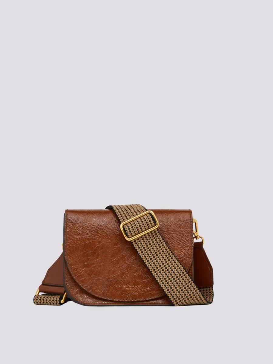 Tara in naplak color cognac. Crossbody. All’interno tasca piatta, foderata in camoscio. Tracolla regolabile e removibile in tessuto a spiga.