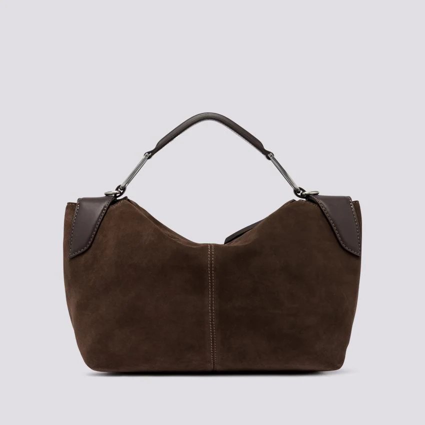 Borsa a spalla Alicudi in suede light color cioccolato e dettagli in pelle, con manico in sugherite rivestito e anelli metallici logati. Zip on top per la chiusura. Accessoriata di tracolla regolabile per triplice portabilità: a mano, a spalla o crossbody. Dimensioni: 36x25x14 cm.