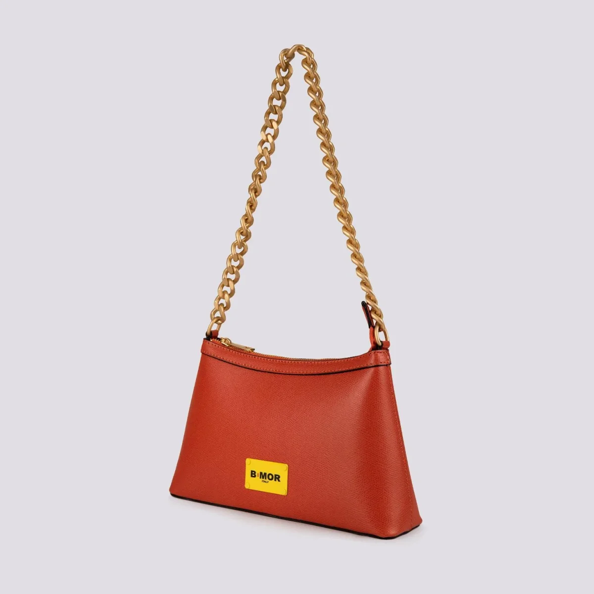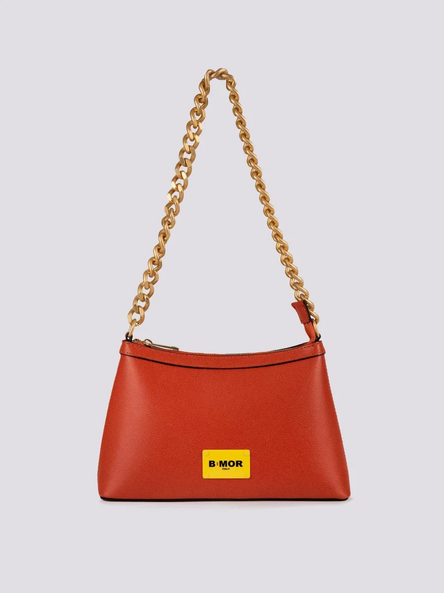 Borsa in pelle saffiano color mattone a forma trapezioidale con catena oro opaca. Chisura zip in metallo dorata. Tiretto in tessuto con linguetta in pelle per facilitare la chiusura della borsa. Taschina interna porta cellulare. Tracolla regolabile di servizio in tonalità. Fodera interna in tessuto nero. Logo applicato su placchetta gialla lucida in metallo.