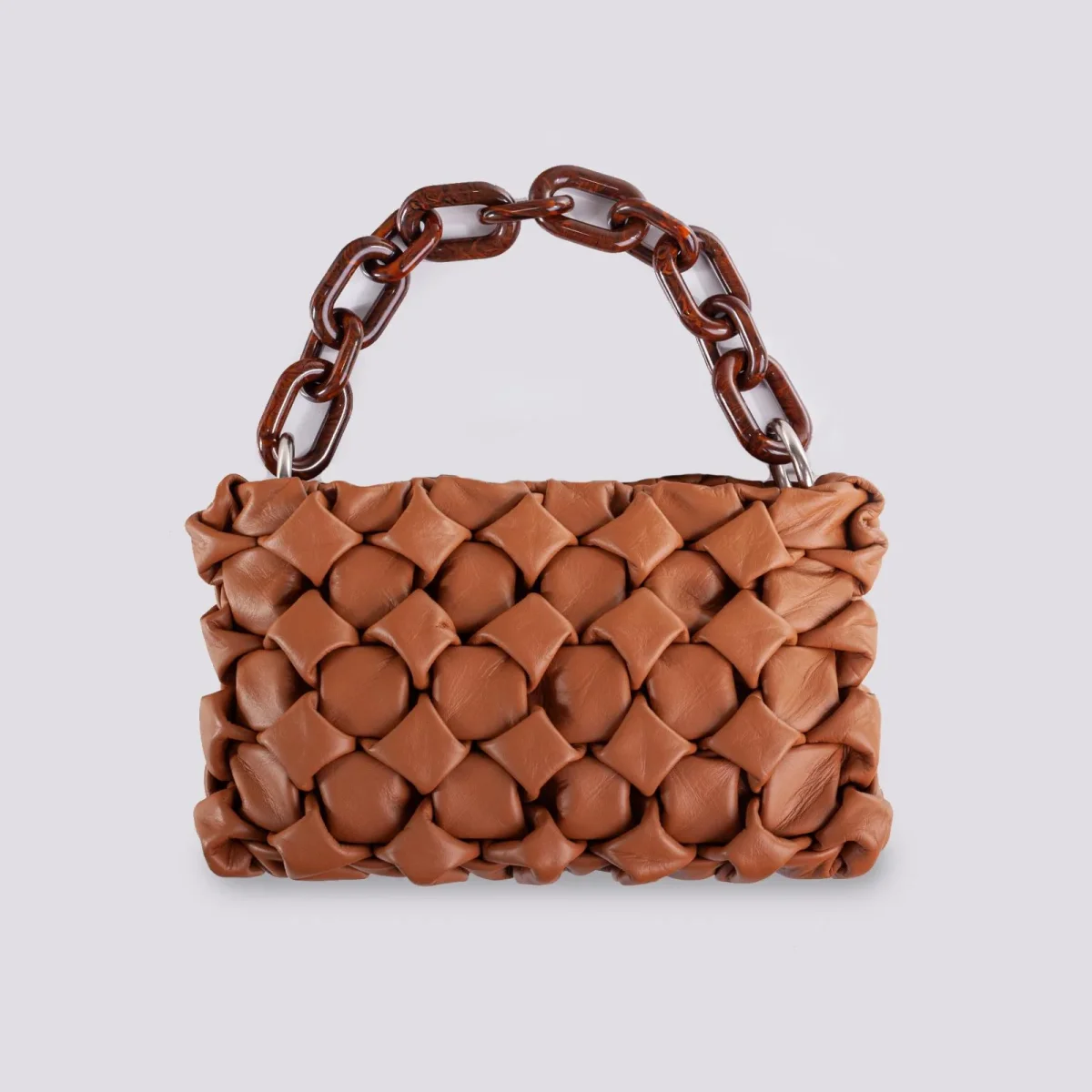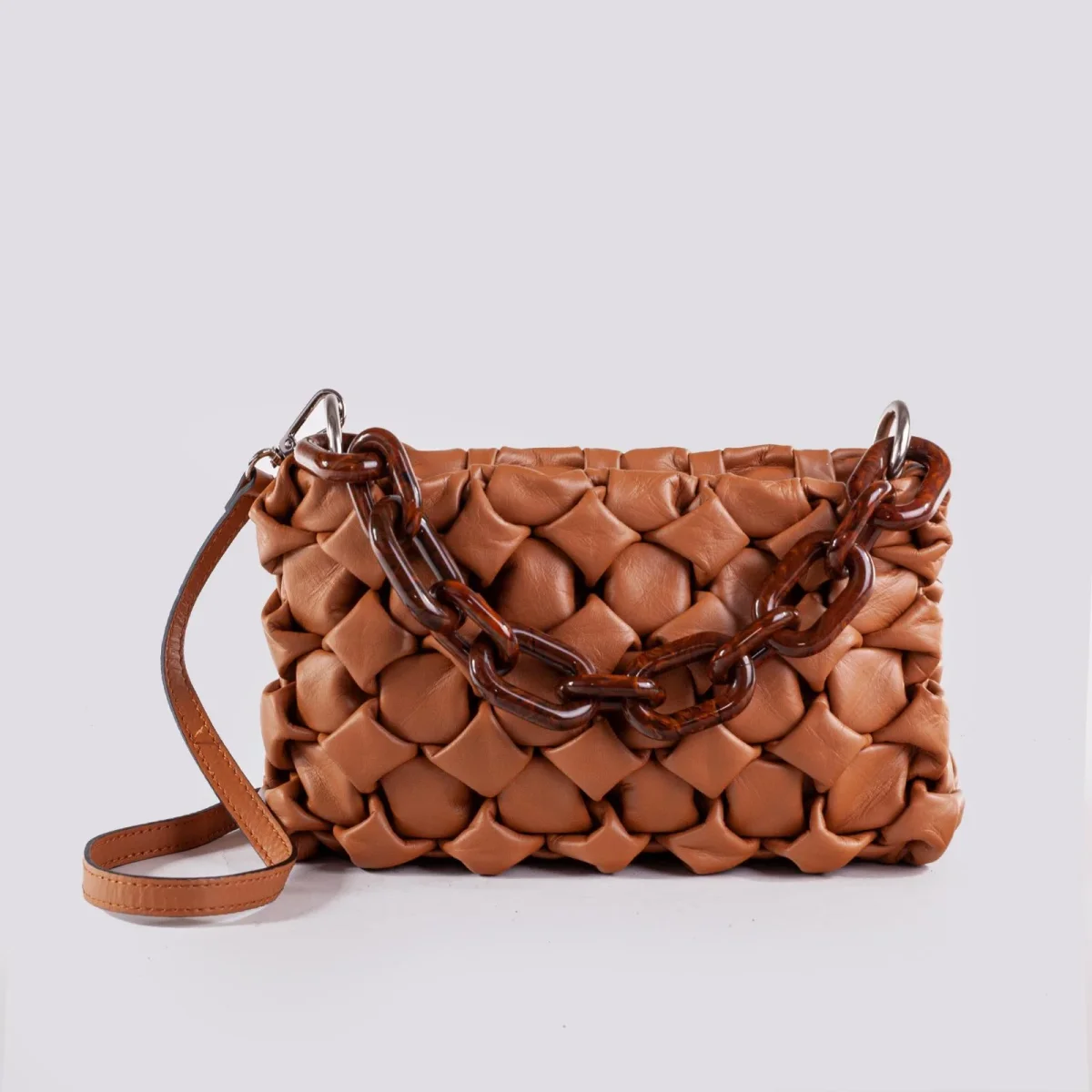 Borsa in morbida pelle sauvage intrecciata color cuoio con manicotto ad anelli in osso tartaruga Curly. Un modello iconico firmato BiMOR ITALY. Tracolla di servizio regolabile in pelle in tonalità. Piccola quanto basta, questa carinissima borsa in pelle trasmette stile e ricercatezza, la tecnica dell’intreccio impiegata per la realizzazione produce un effetto unico nel suo genere.