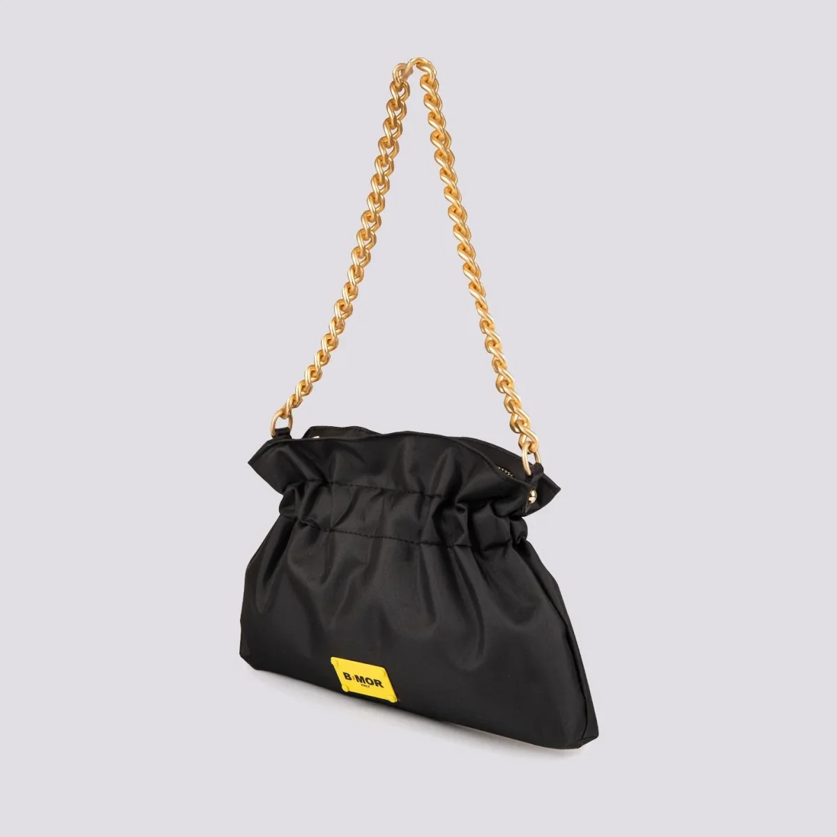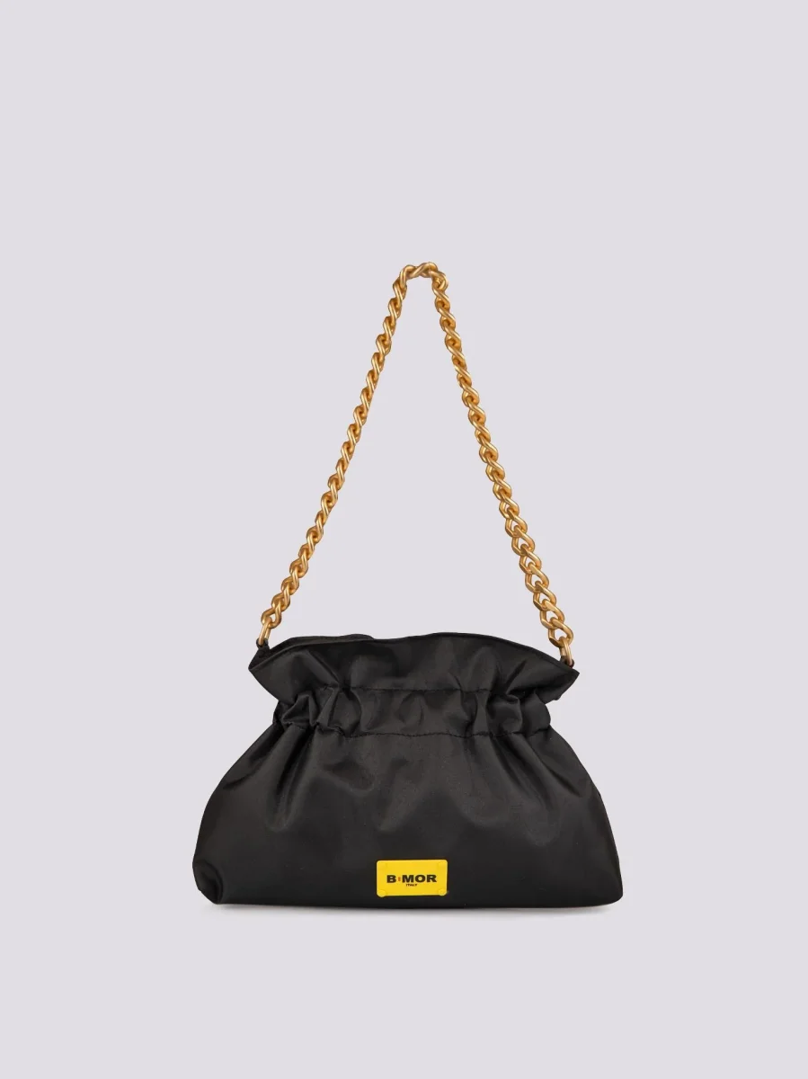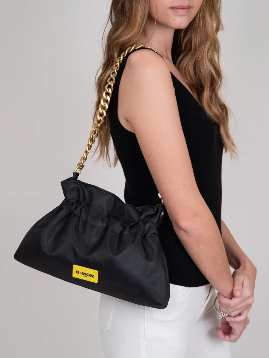 Borsa in nylon nera con chiusura a caramella “Mini Swag”. Leggera, pratica e trendy. Tracolla catena oro opaco. Chiusura a zip in metallo. Tasca interna porta cellulare. Fodera interna in tessuto nero. Logo applicato su placchetta gialla lucida in metallo.
