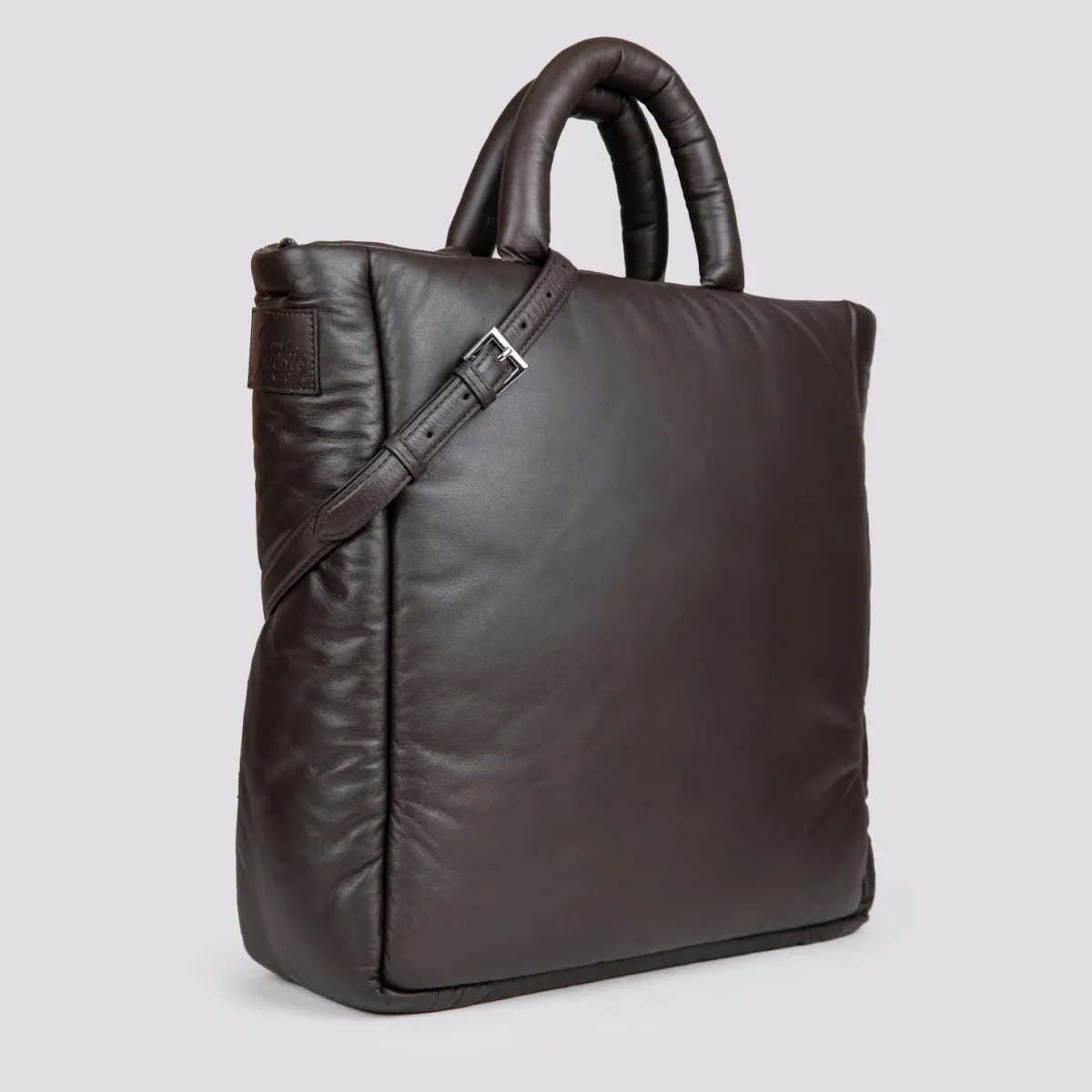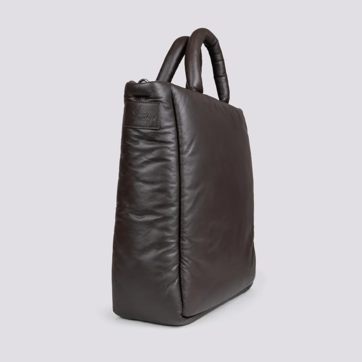 Borsa in pelle imbottita marrone. Imbottutira interna in ecopiuma. Manico imbottito per portare la borsa comodamente a mano. Possibilità di aggiunta di tracolla in pelle in tonalità Chiusura zip in metallo. Doppia taschina interna porta cellulare e tasca con chiusura zip in metallo frontale. Fodera interna nera. Peso leggero. Capienza abbondante. Tirazip in pelle imbottita.
