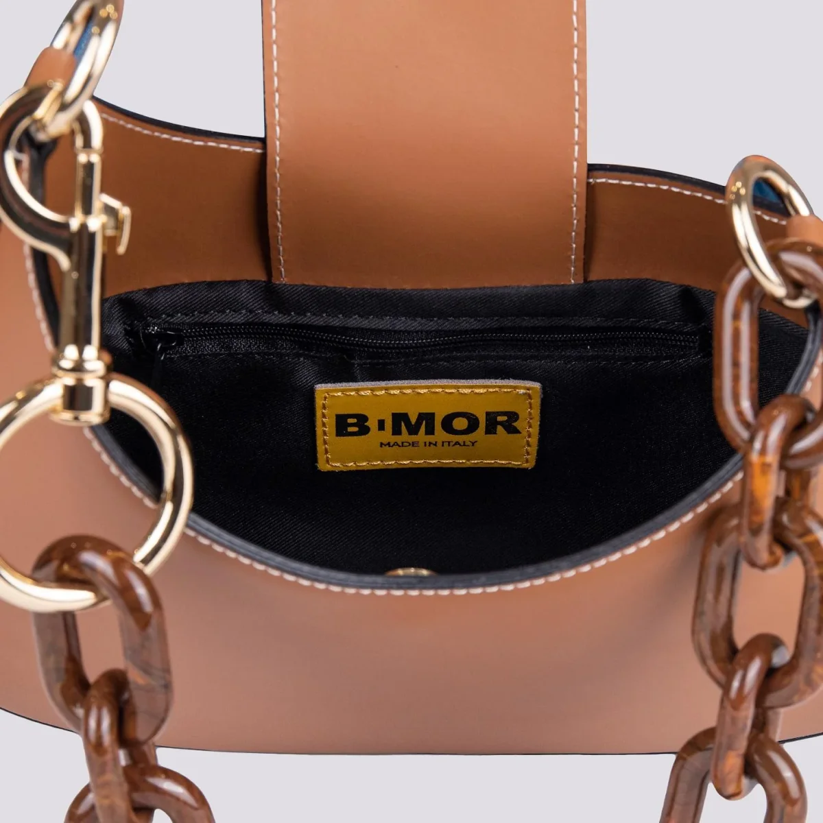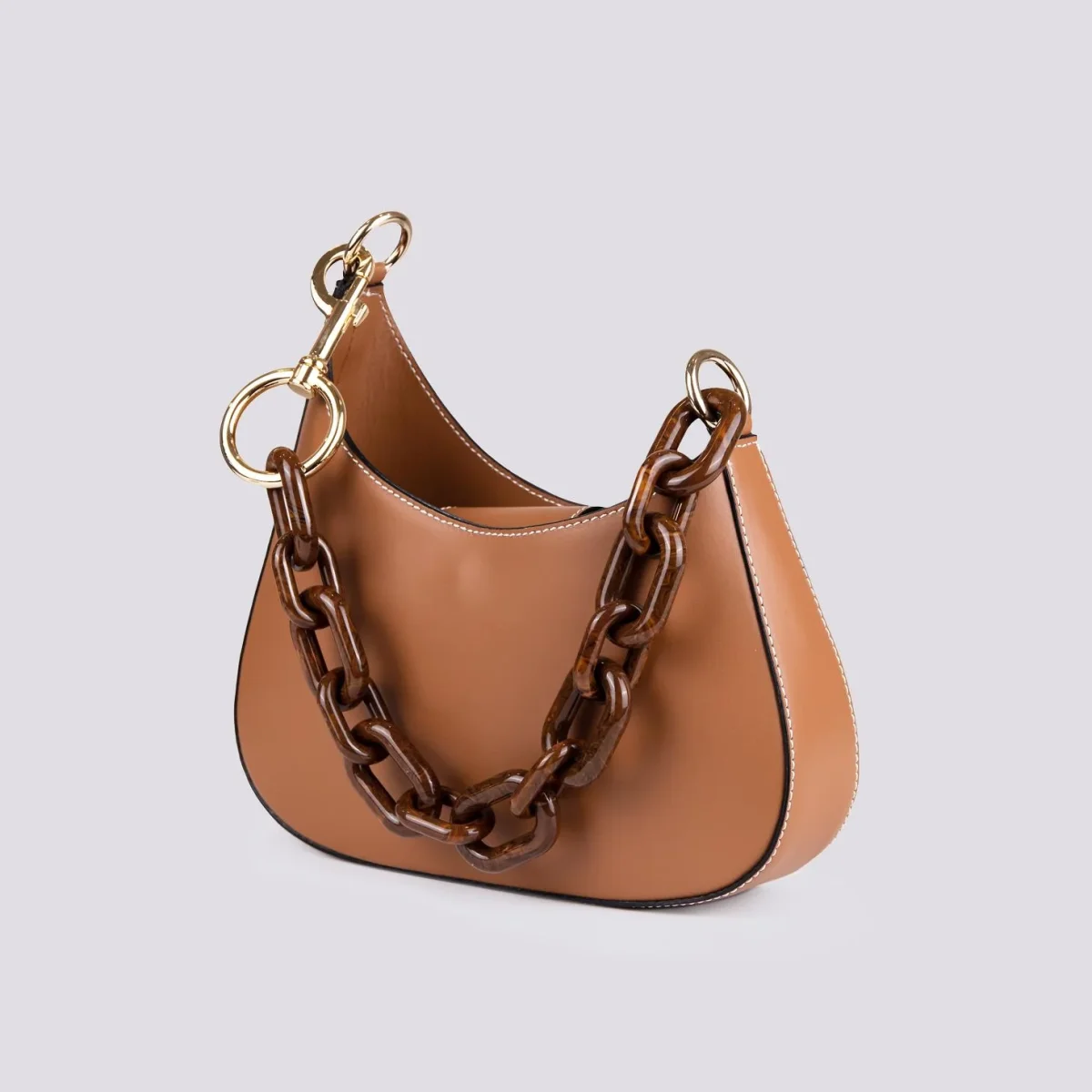 Borsa in pelle di vitello color cuoio con manicotto ad anelli in osso tartaruga e moschettone oro, caratterizzata da una forma asimmetrica unica nel suo genere. Dettaglio impunture grezze a contrasto. La chiusura della borsa è regolata da una patta in pelle in tonalità con calamita. Taschino interno porta cellulare. Logo applicato su targhetta gialla lucida in metallo. Tracolla di servizio in pelle in tonalità. Profili neri a contrasto.