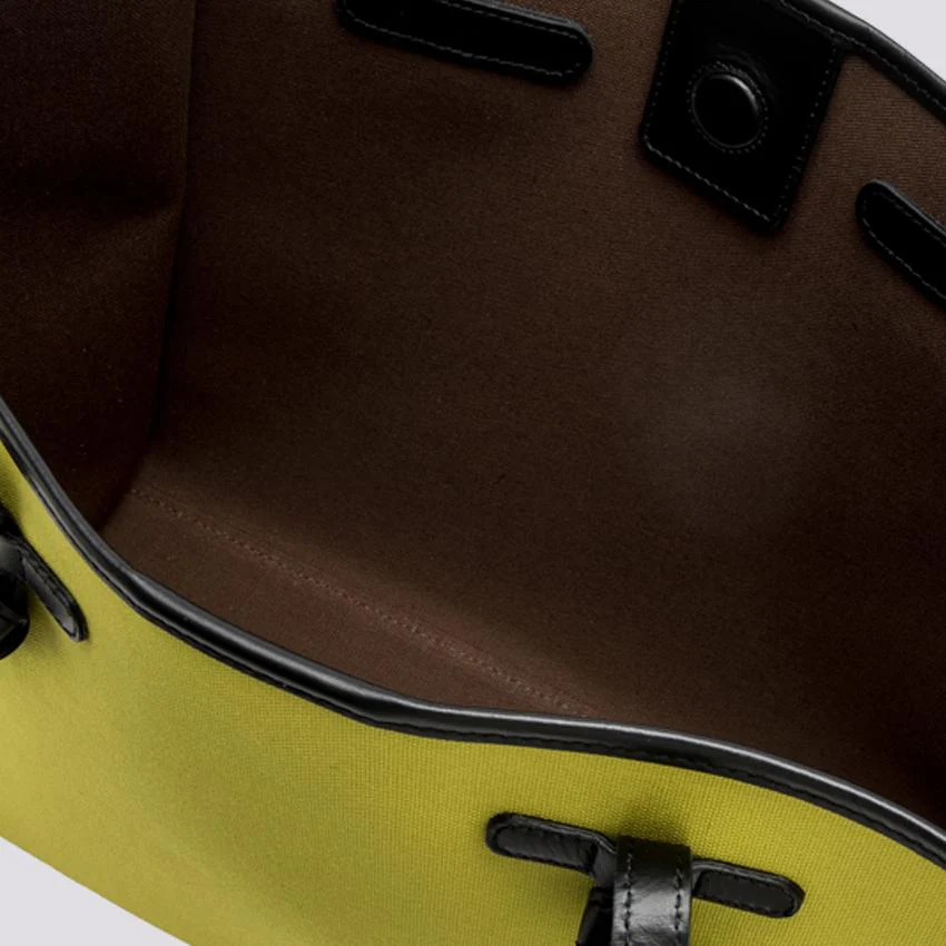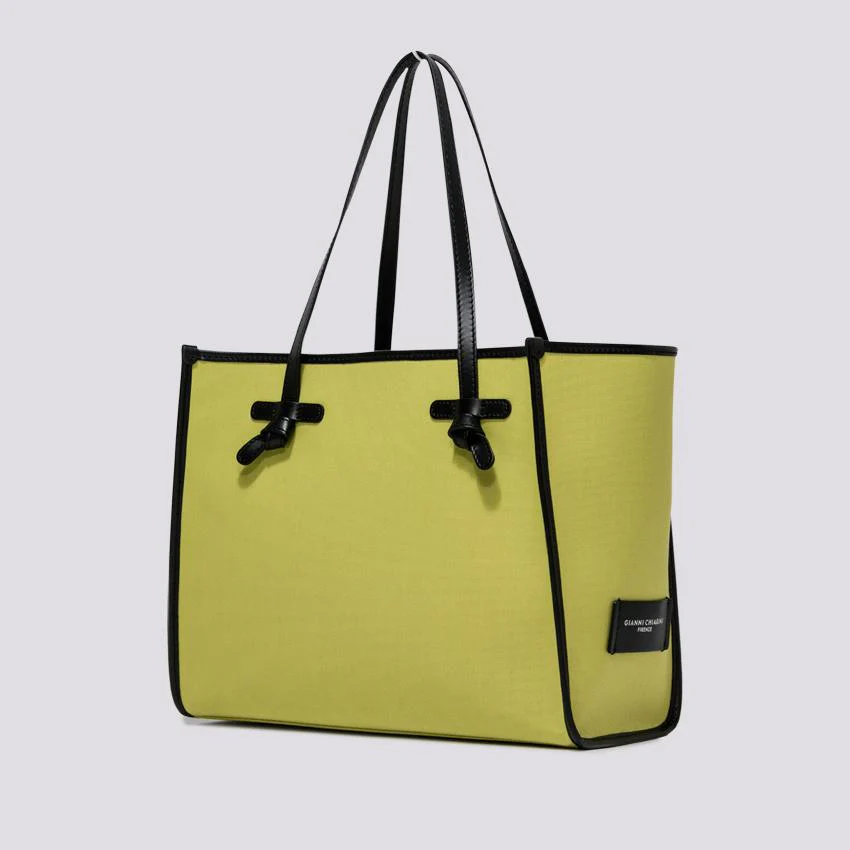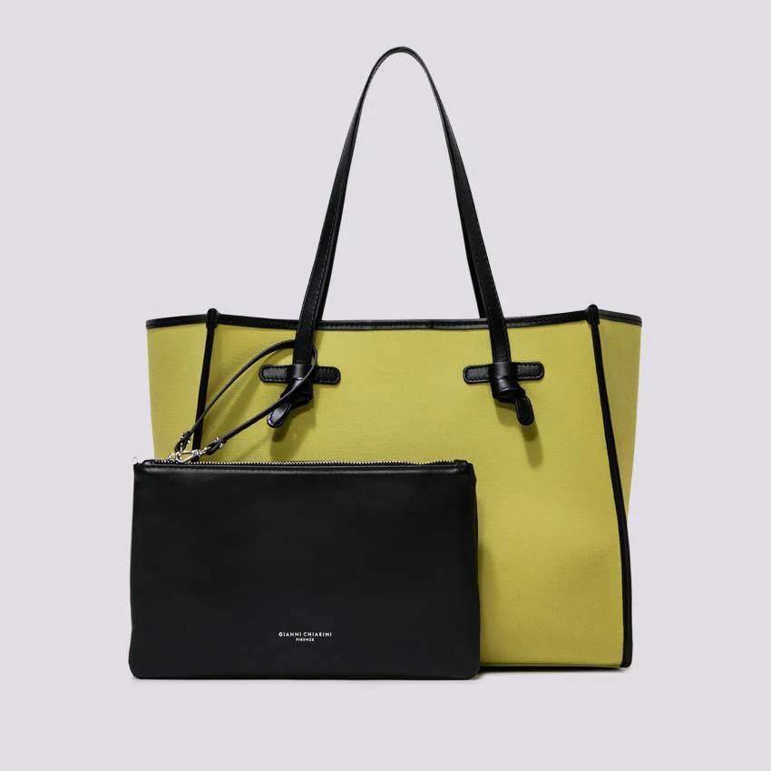 La shopping Marcella Gianni Chiarini è realizzata in tessuto canvas color verde sulfureo. Il design minimal è arricchito da profili in pelle in contrasto. Dotata di manici in pelle e di una comoda chiusura tramite magnete è perfetta per la vita di tutti i giorni. La fodera interna in contrasto e la pochette in pelle dello stesso colore delle rifiniture la rendono unica nel suo genere.