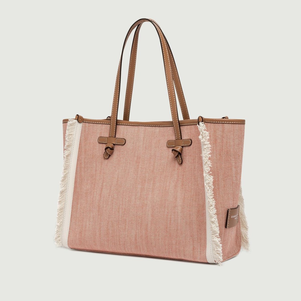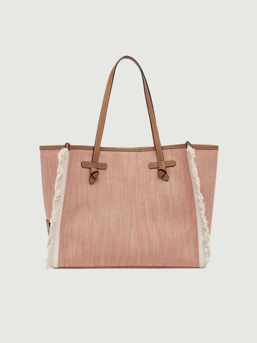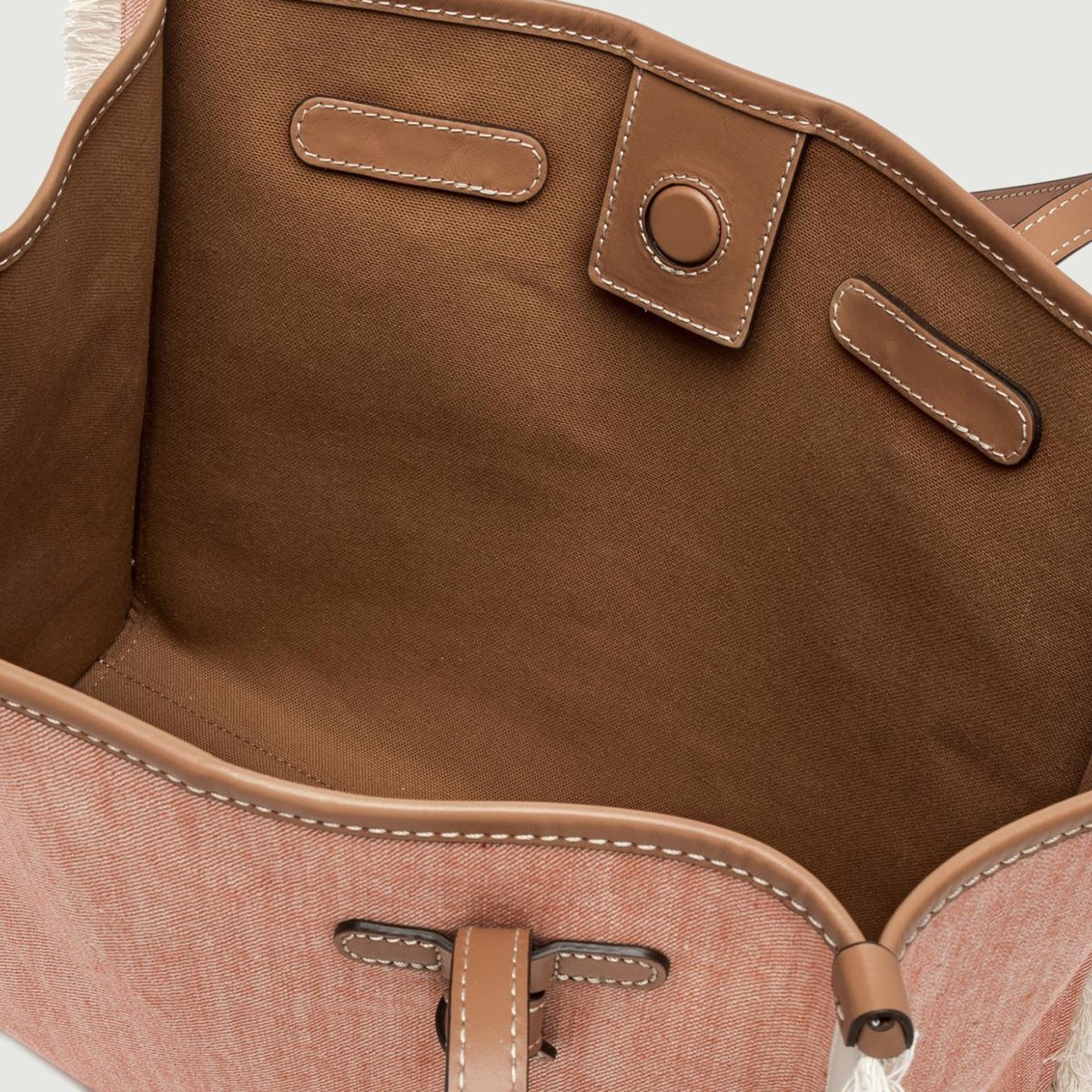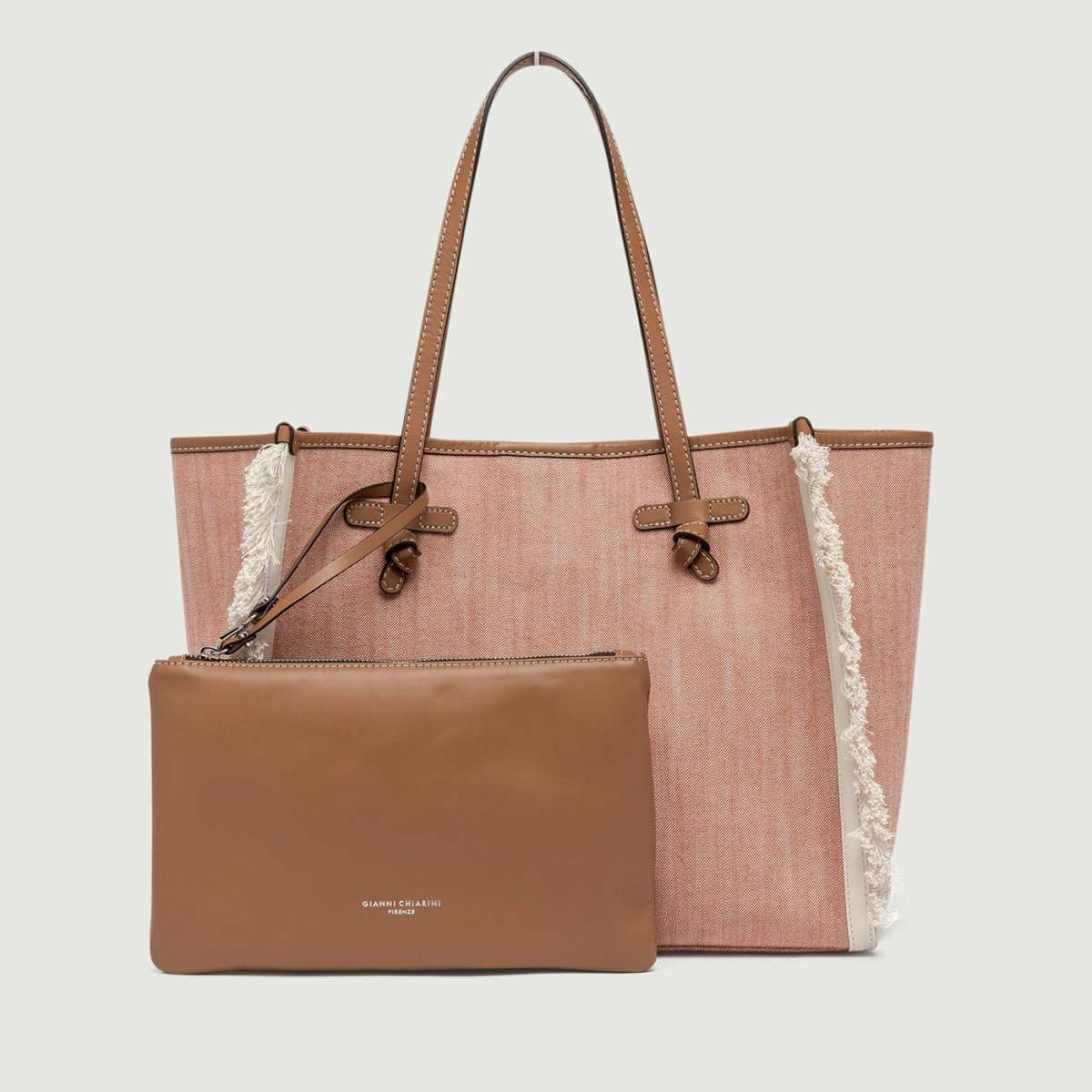 La shopping Marcella by Gianni Chiarini in tessuto effetto jeans, leggero eppure resistente, è il modello ideale per vivere con spensieratezza le giornate estive in città e in vacanza. Il design minimal è arricchito da profili sfrangiati e dai profili superiori in pelle. Dotata di manici in pelle e di una comoda chiusura tramite magnete è perfetta per la vita di tutti i giorni. La fodera interna in contrasto e la pochette integrata in pelle la rendono protagonista indiscussa per look glamour ed eleganti. Dimensioni: 38x31x16 cm