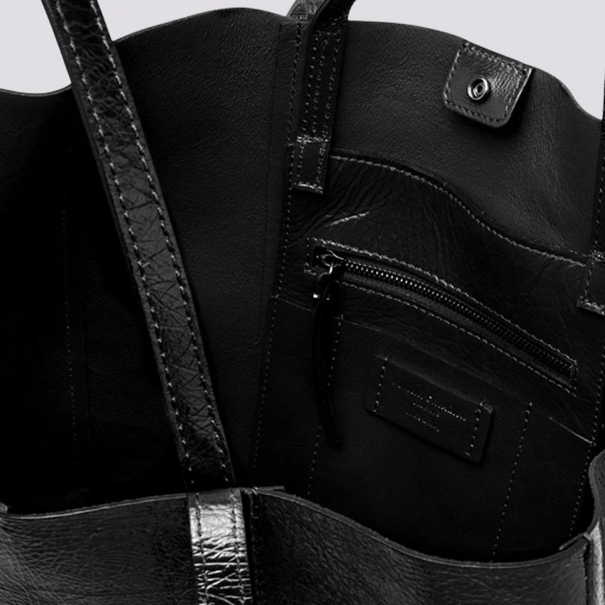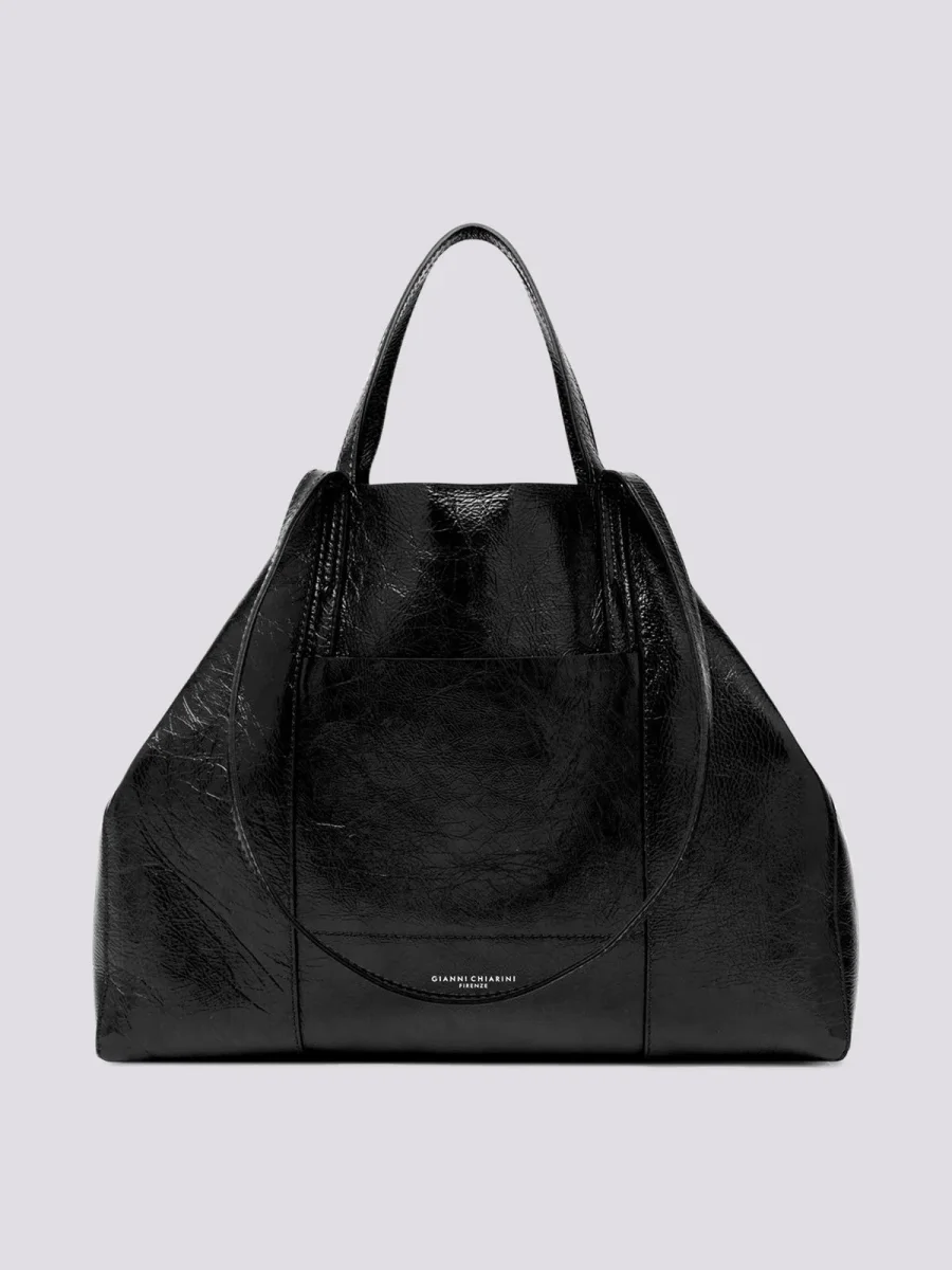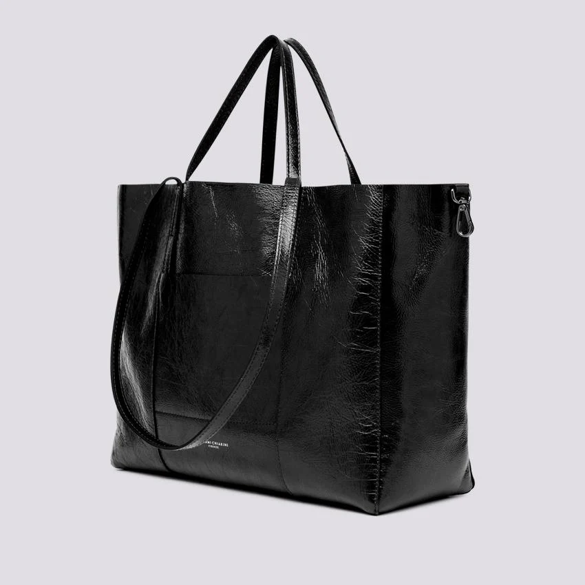 Borsa Super Light large size in naplack nero, tote con tagli geometrici e tasche. Caratterizzata da doppi manici per la funzione a spalla o a mano.