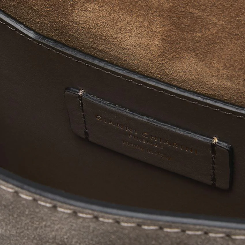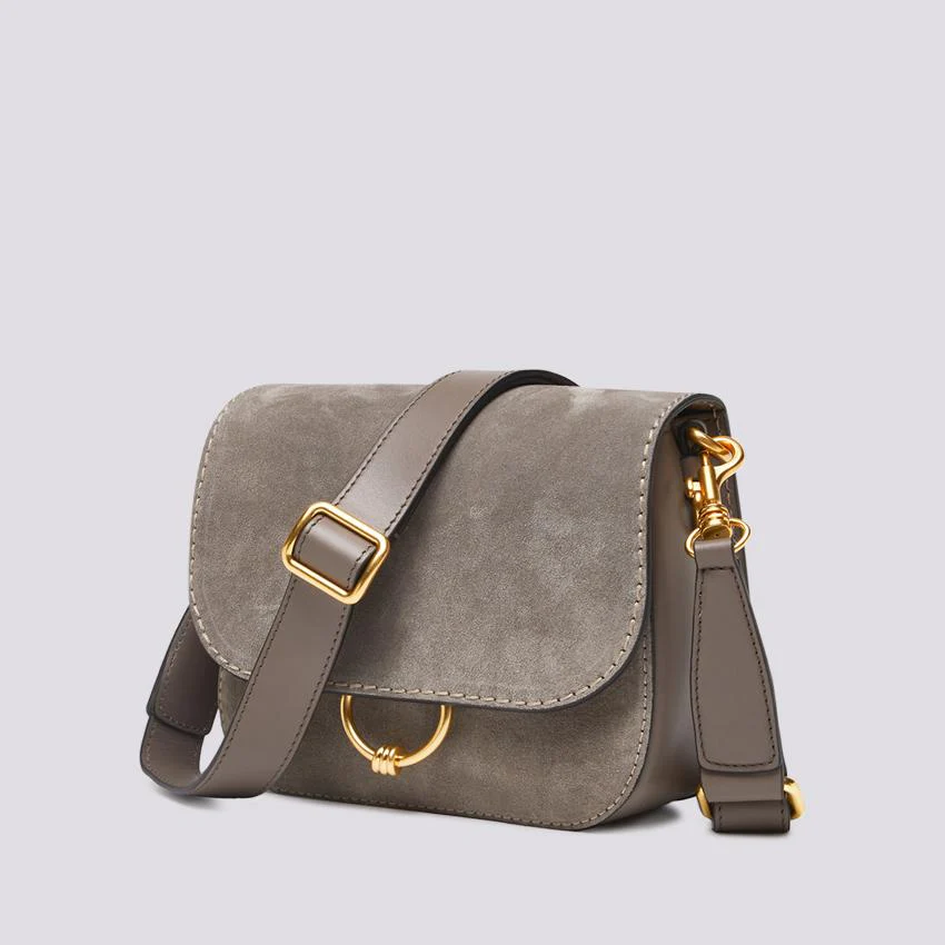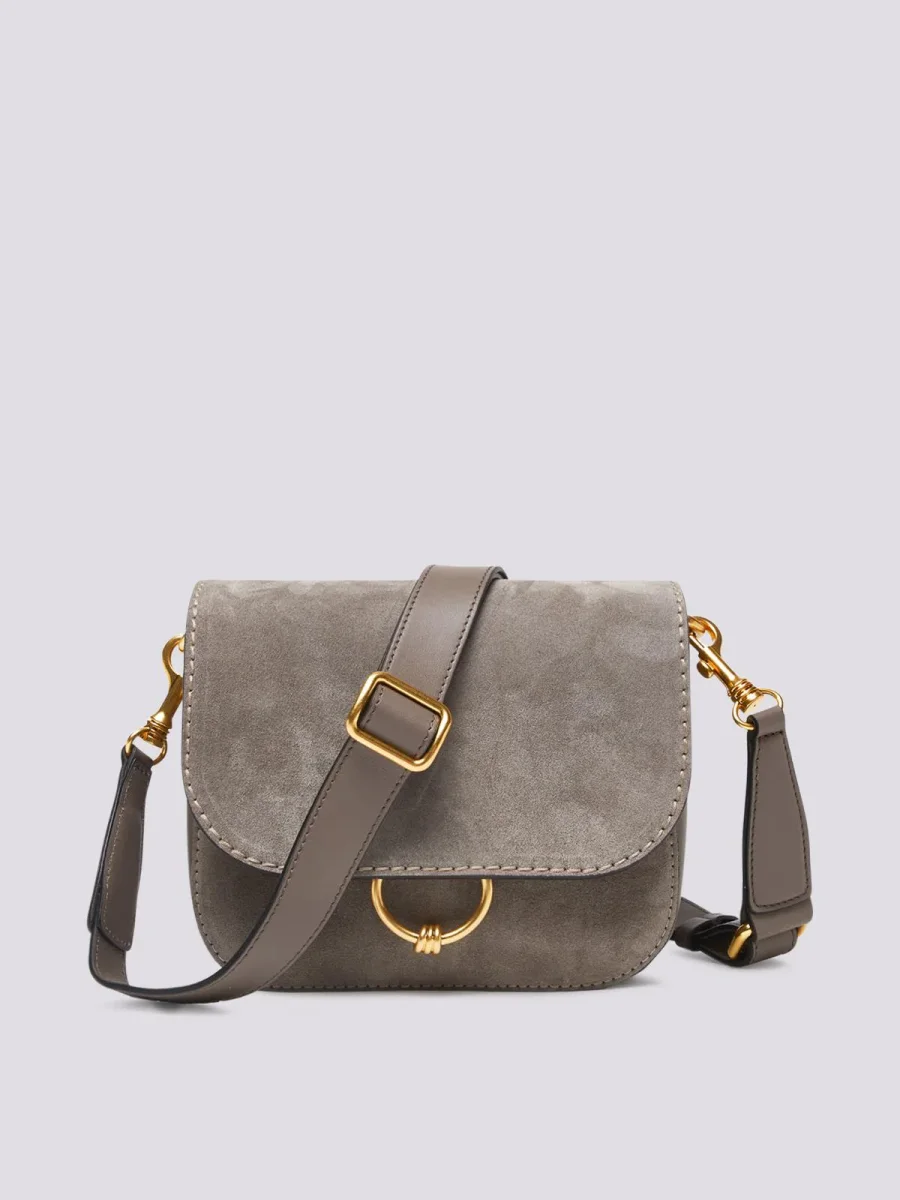 Borsa a tracolla Meg in light suede color grigio, crossbody caratterizzata dalle cuciture in contrasto e dal charm in metallo per la chiusura con magnete. Interno in pelle scamosciata con tasca piatta multiuso. Tracolla e fianco in pelle.