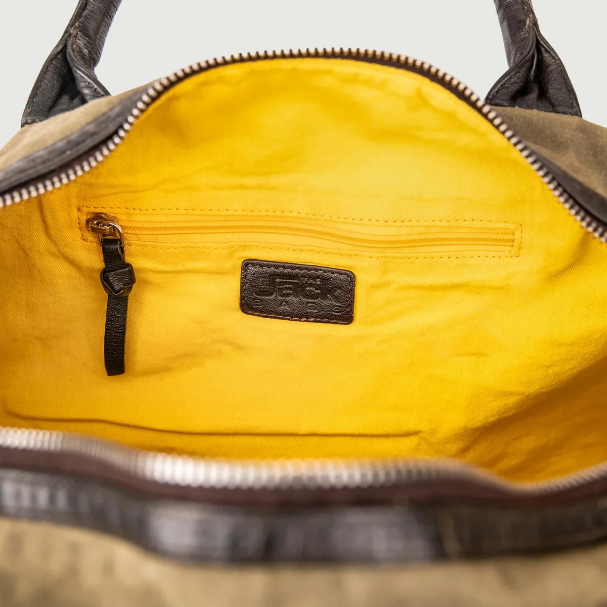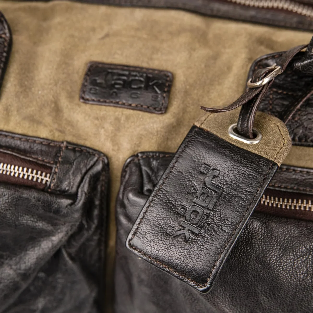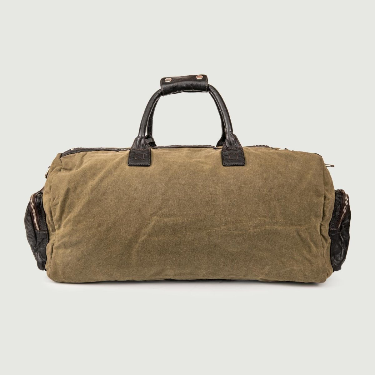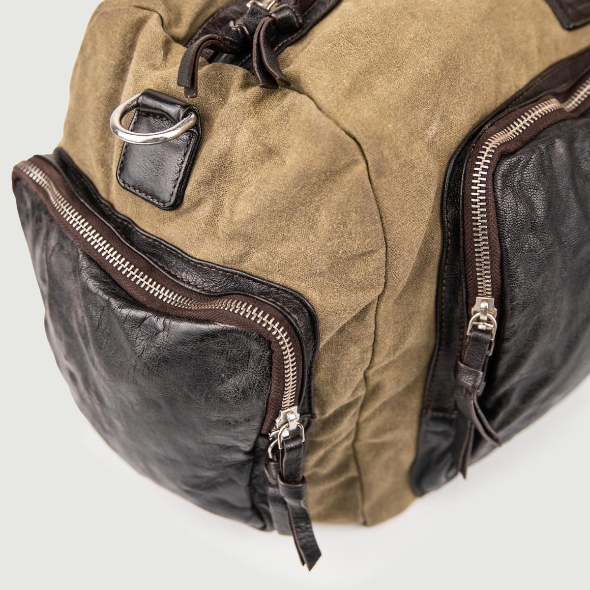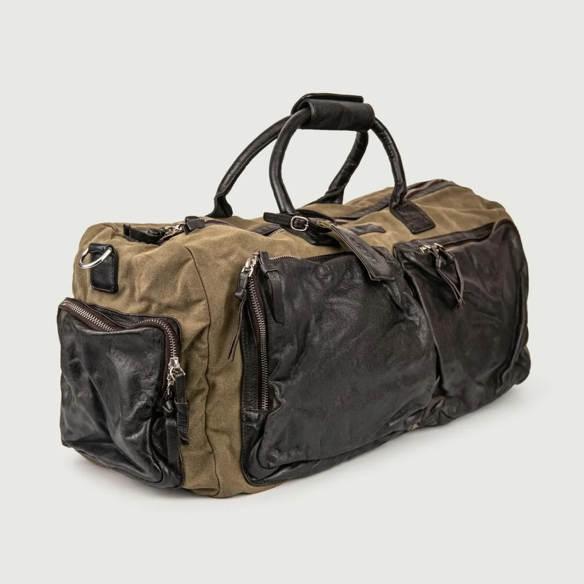 Borsone da viaggio con maniglie e tasconi in pelle effetto used.