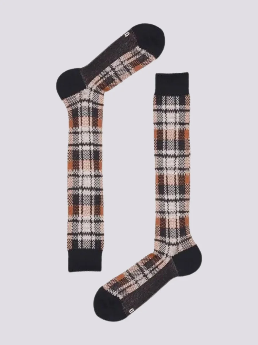 Calza lunga da uomo ispirata alle lavorazioni degli archivi storici, in cotone biologico. Calza jacquard con un intramontabile disegno tartan.