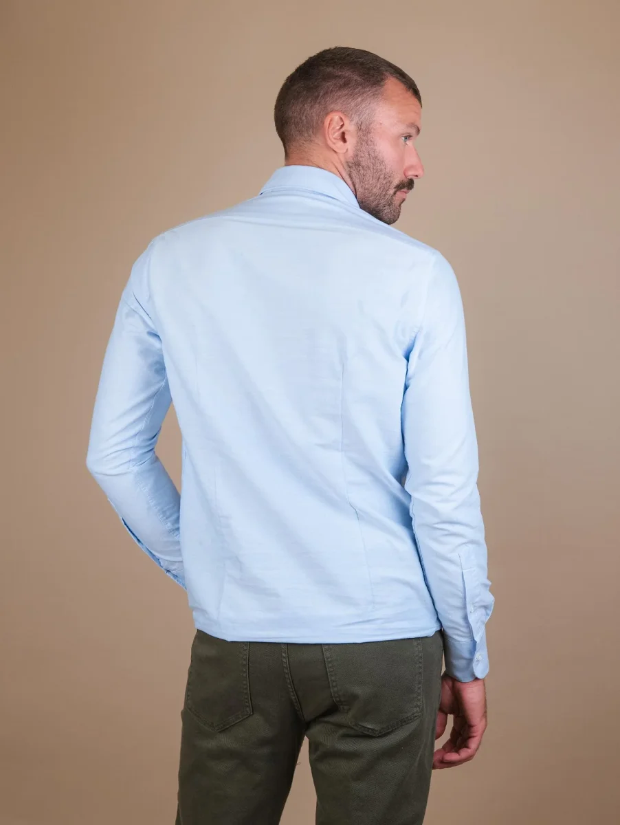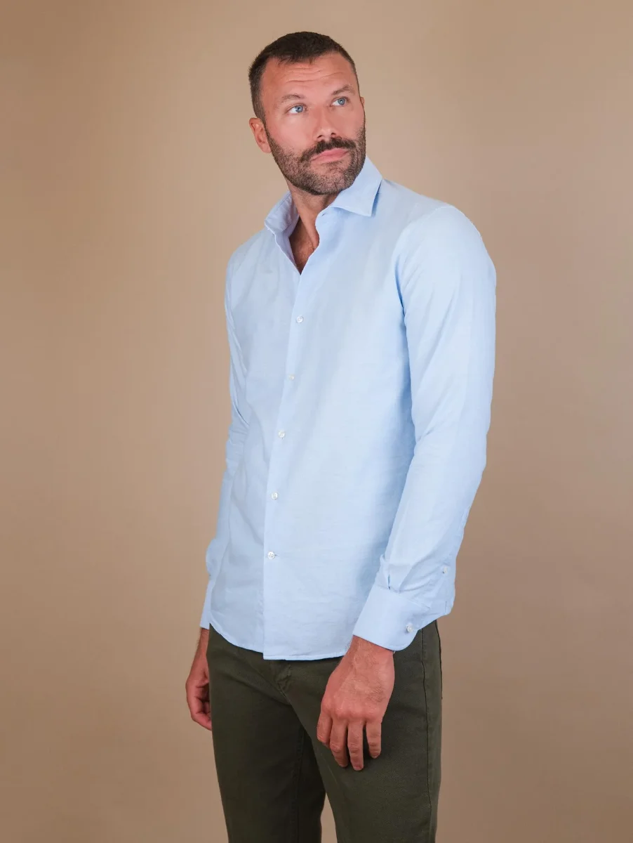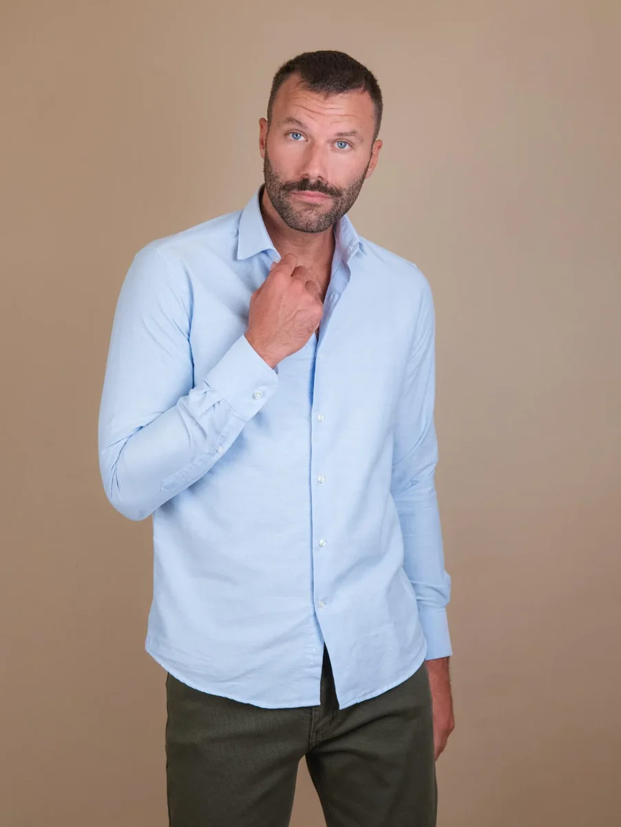 Camicia Aaron, realizzata con collo alla francese, cotone a trama oxford, bottoni in color madreperla e polsini regolabili.