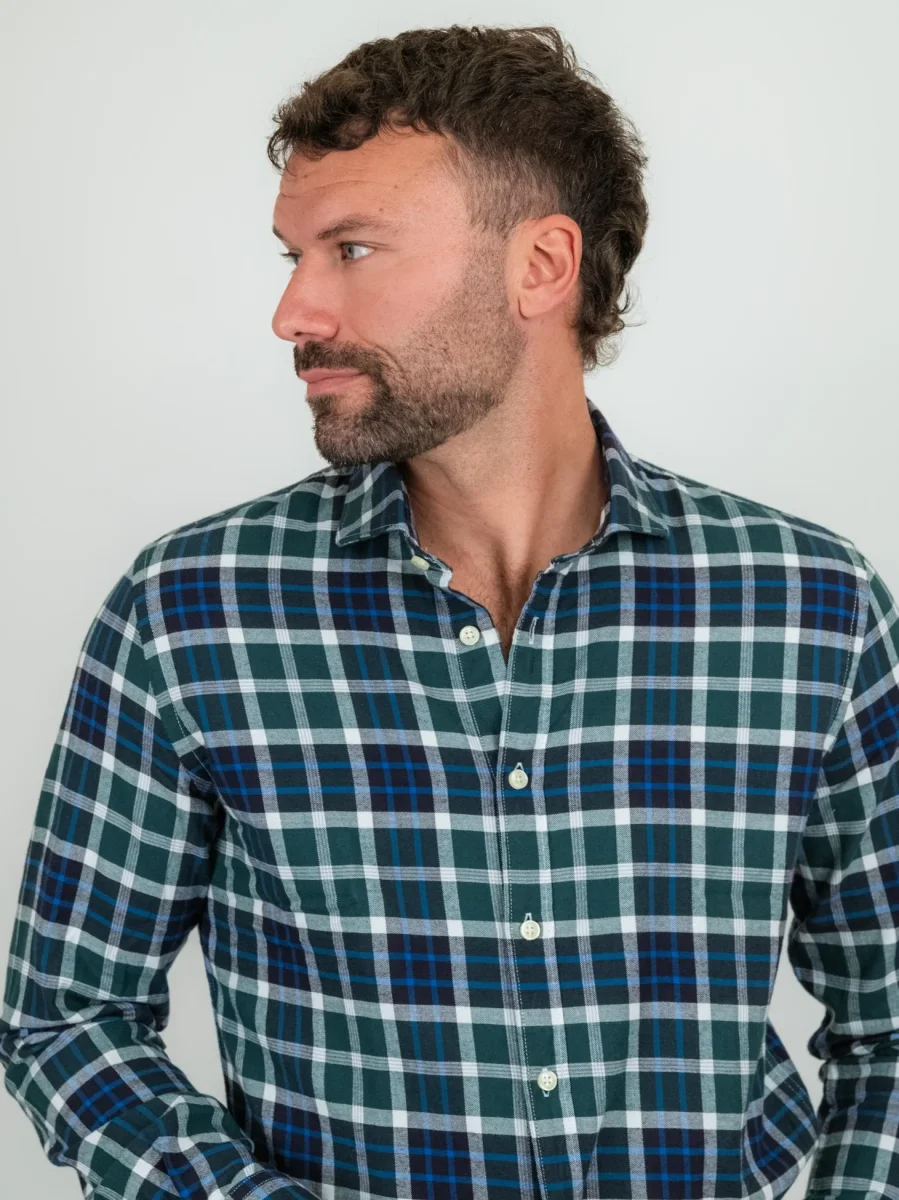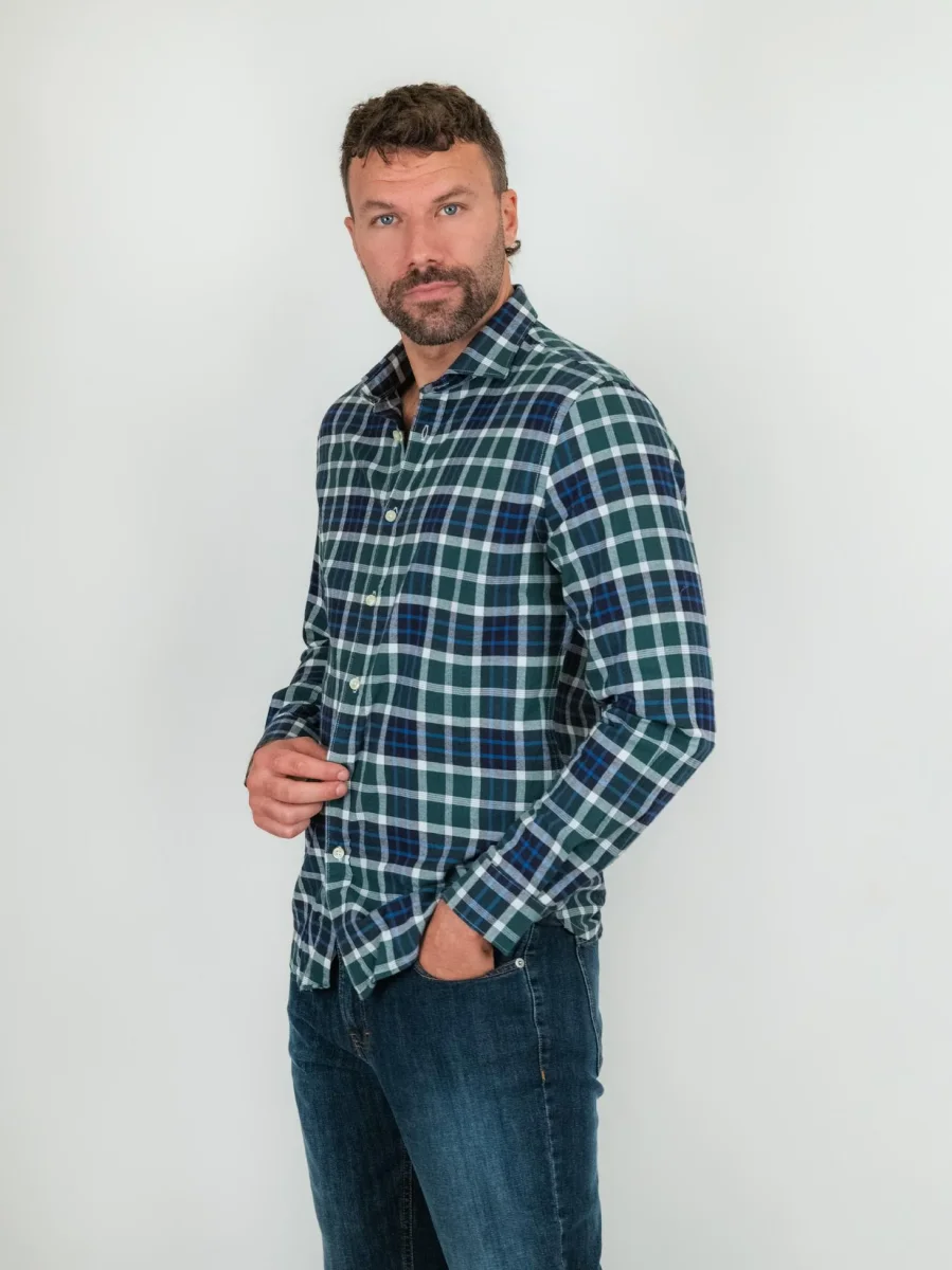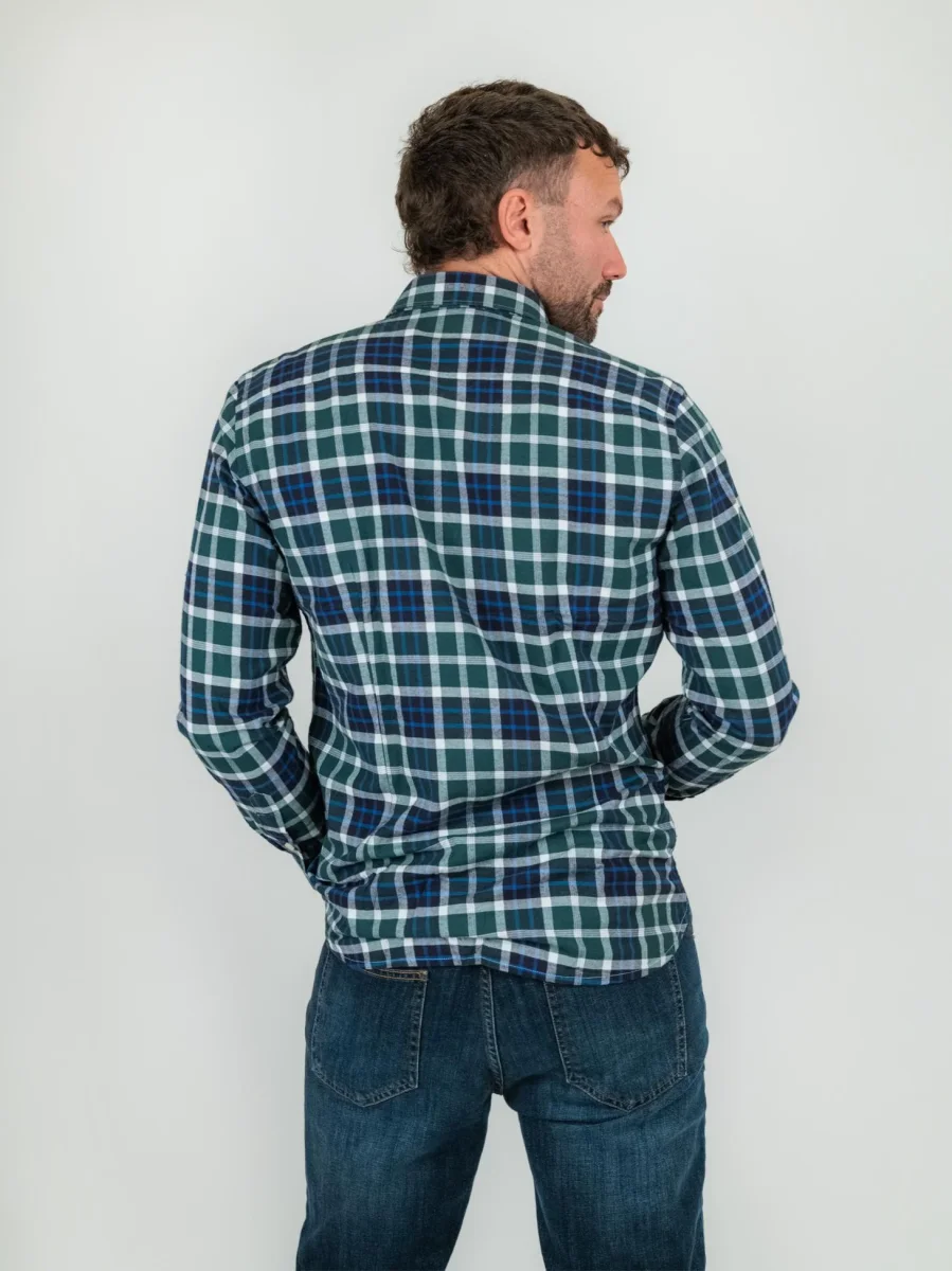 Camicia in flanella di cotone a quadri con base verde e inserti di colore.