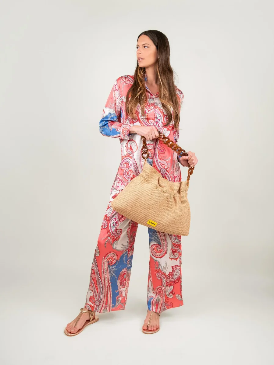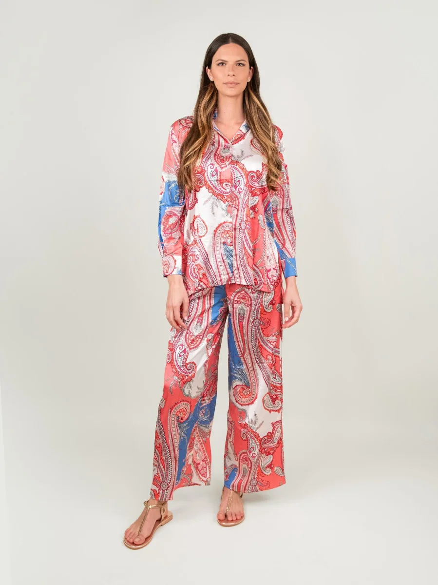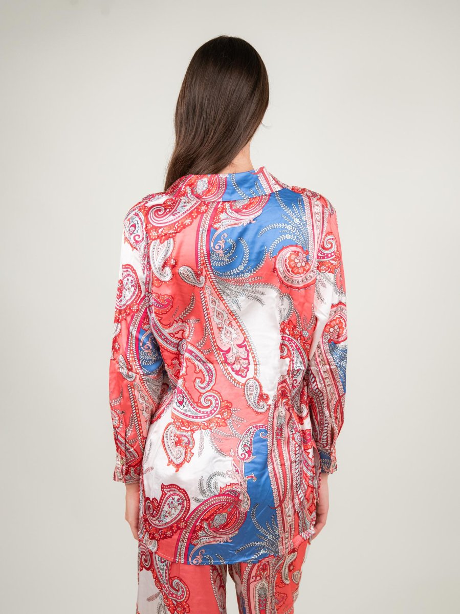 Camicia effetto caftano fantasia salmone e bluette su base bianca.