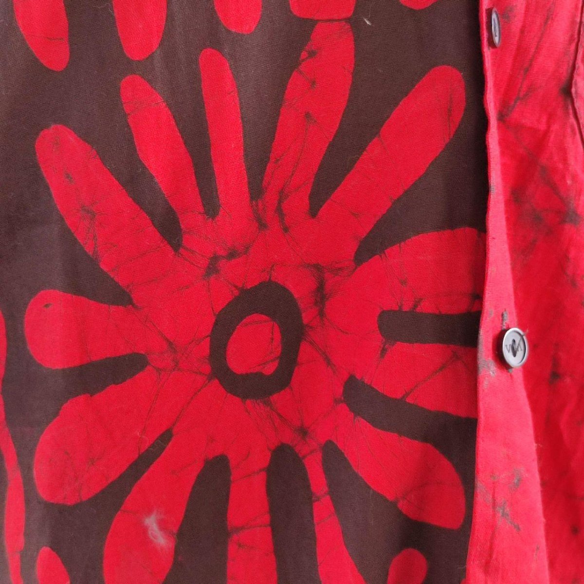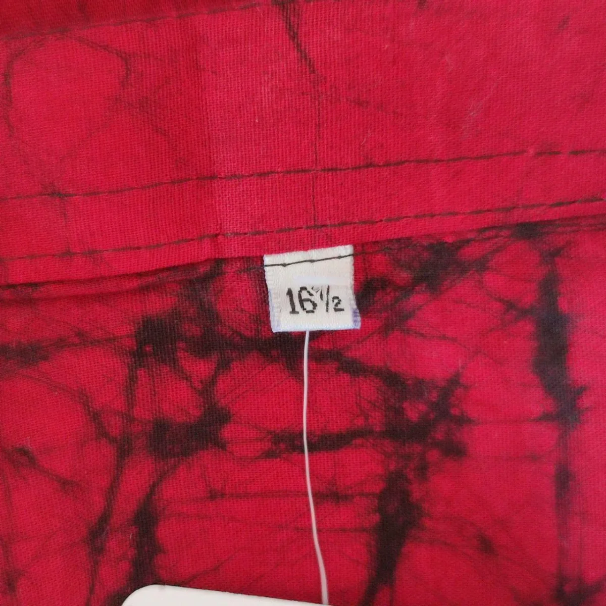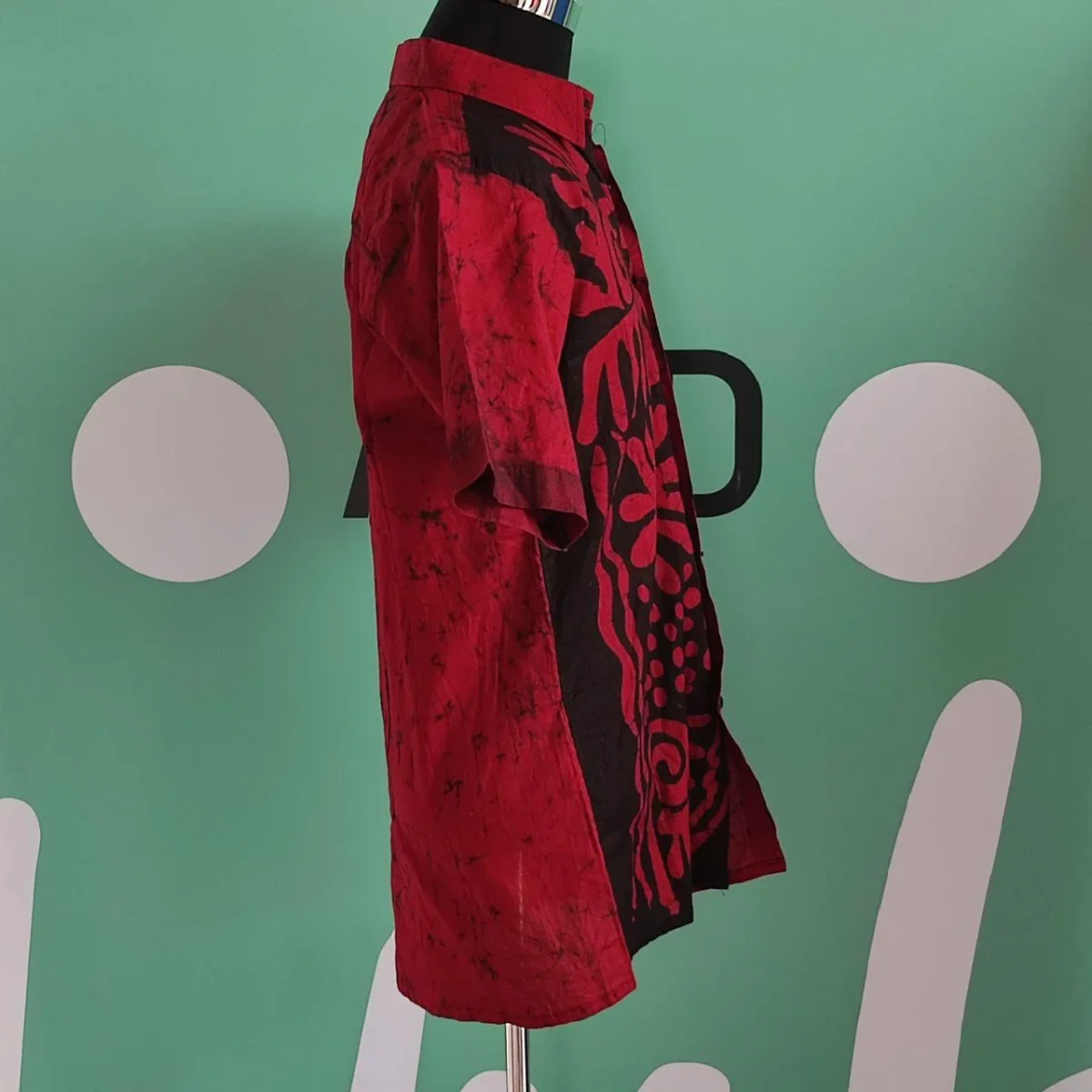 Camicia in ottime condizioni, senza nessun particolare difetto. Si presenta di colore rosso, con una grafica tribale sulla parte sinistra. La composizione del tessuto non è presente, ma si direbbe cotone o al massimo un misto cotone e poliestere. Taglia XL, il nome del brand non è presente.