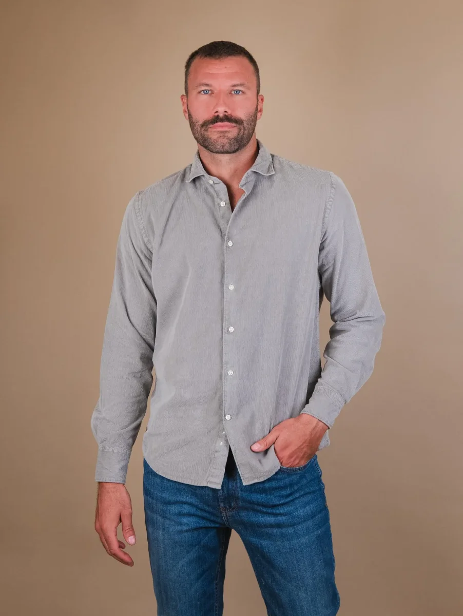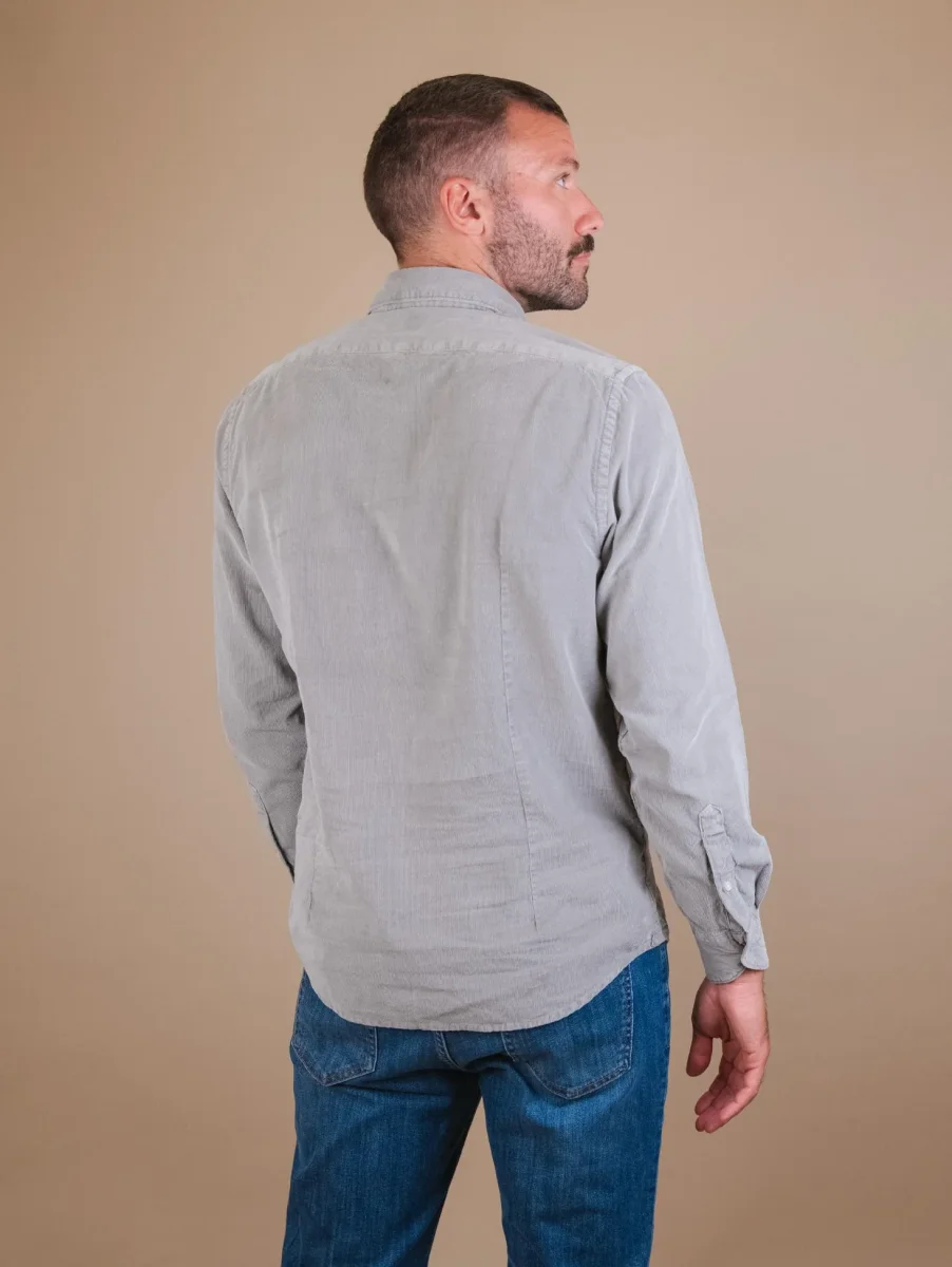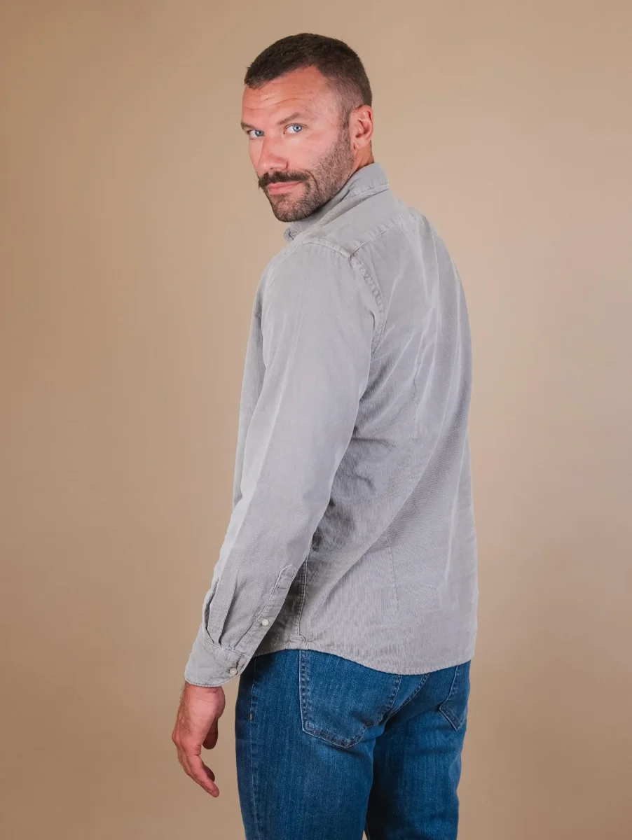 Camicia “Jenson” in velluto a costine tortora. L’aspetto vissuto e il colore non omogeneo del capo non sono da considerarsi difetti ma una caratteristica peculiare del trattamento al quale è stato sottoposto questo capo. Dettaglio bottone su entrambi i polsi. Vestibilità morbida. Peso medio. Composizione: 100% cotone. Il modello è alto 1.87 e indossa una L.