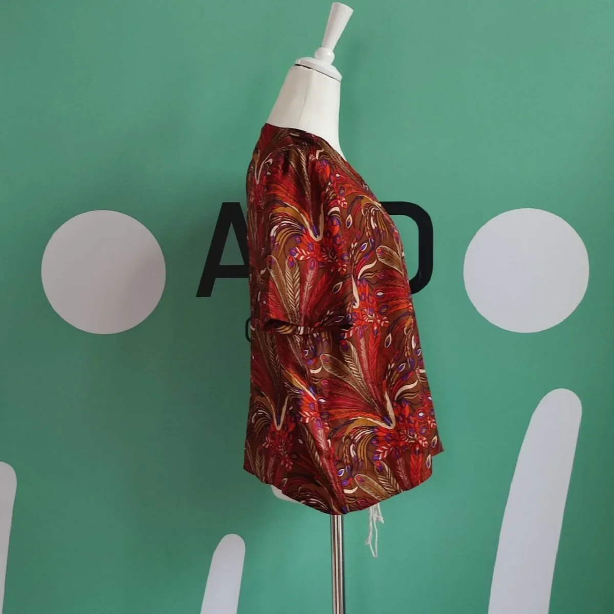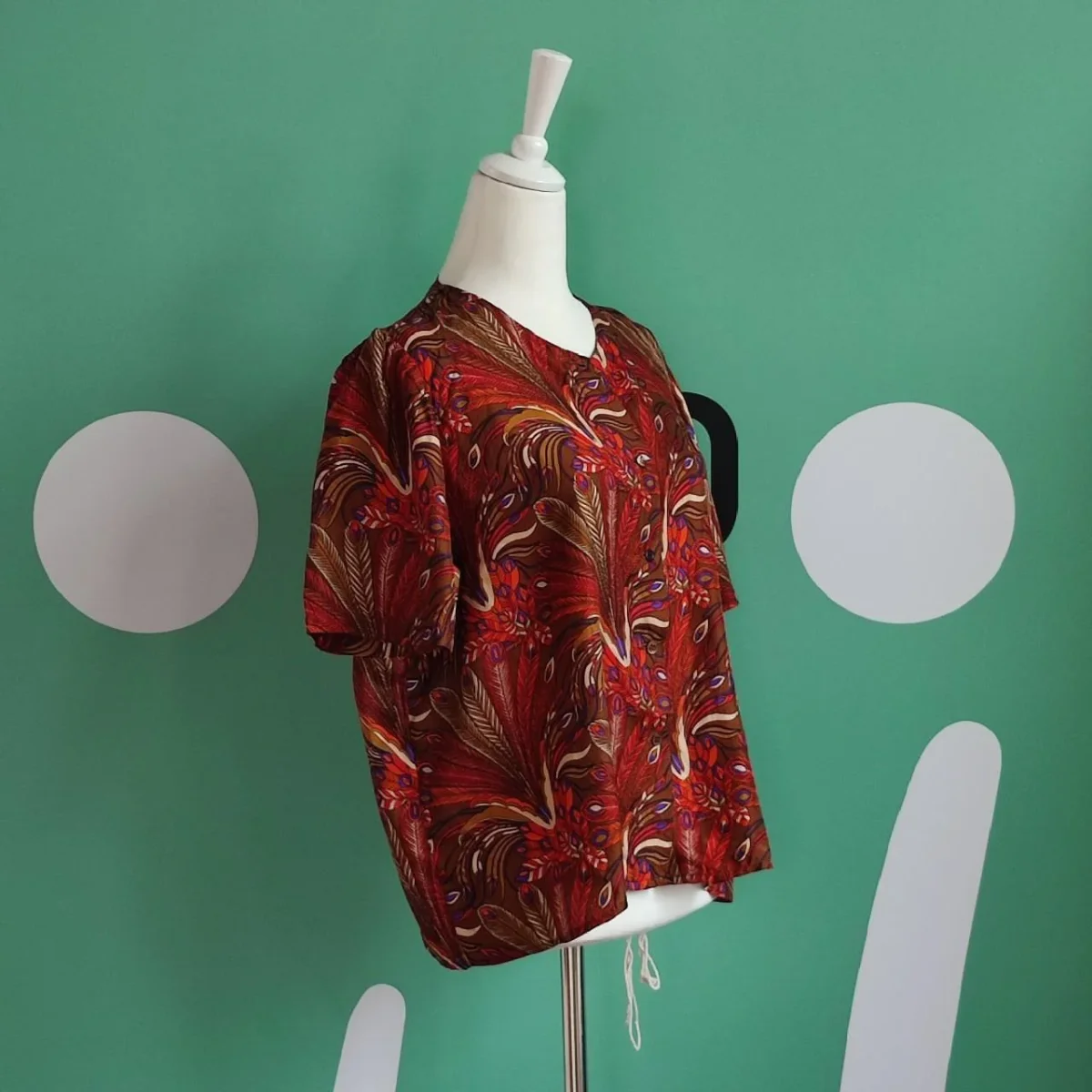 Camicia a maniche corte, larghe e a tre quarti. Le maniche, sono leggermente arricciate in alto. È una camicia con cinque bottoncini marroni sul davanti. La taglia a vista pare una M, sfortunatamente il cartellino non è presente. Il colletto risulta circolare e alto. Le cucitere sono in buone condizioni. Il capo risulta leggermente piu lungo sul retro che sul davanti.Il tessuto, pare in viscosa e polistiere, composizione non presente. Buone condizioni, capo adatto alla stagione primaverile.