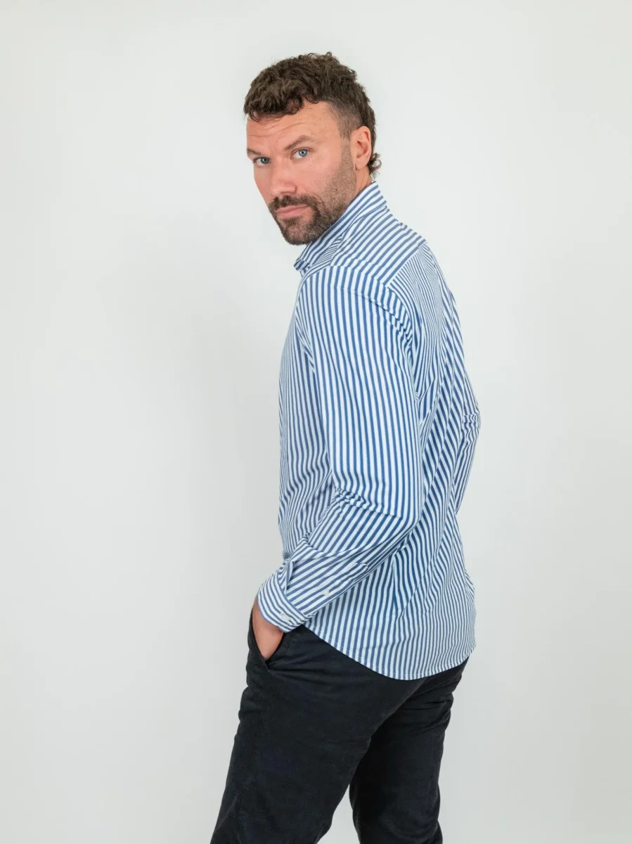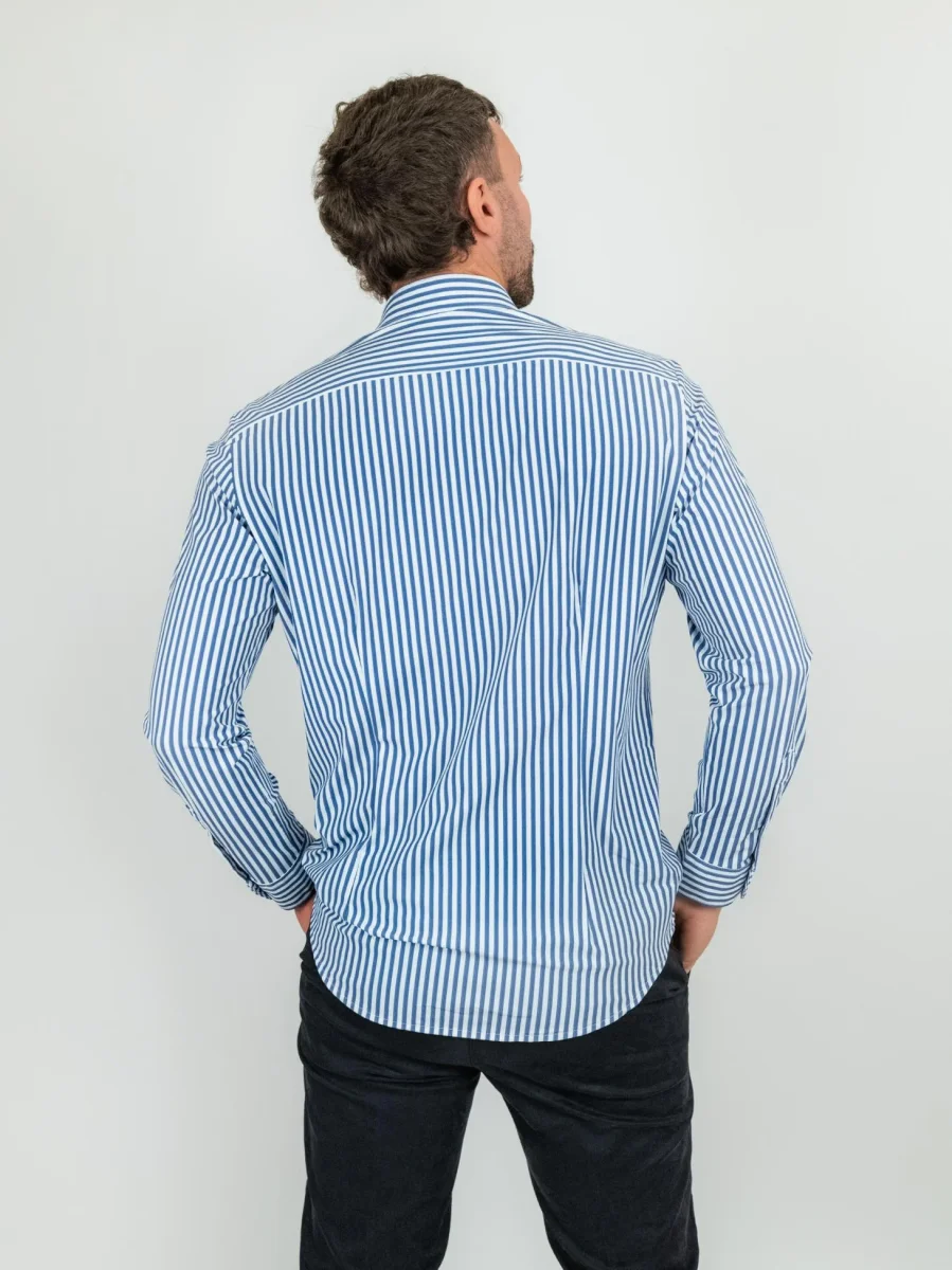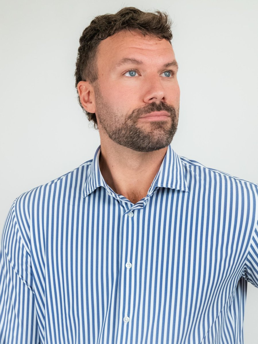 Camicia realizzata in tessuto tecnico, nylon ed elastante, pensata per risolvere il problema dello stiro.
