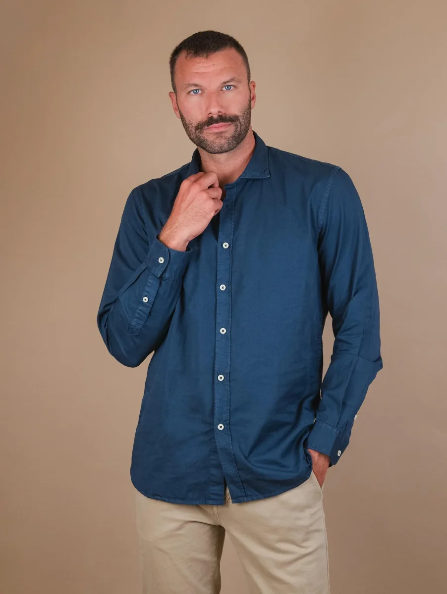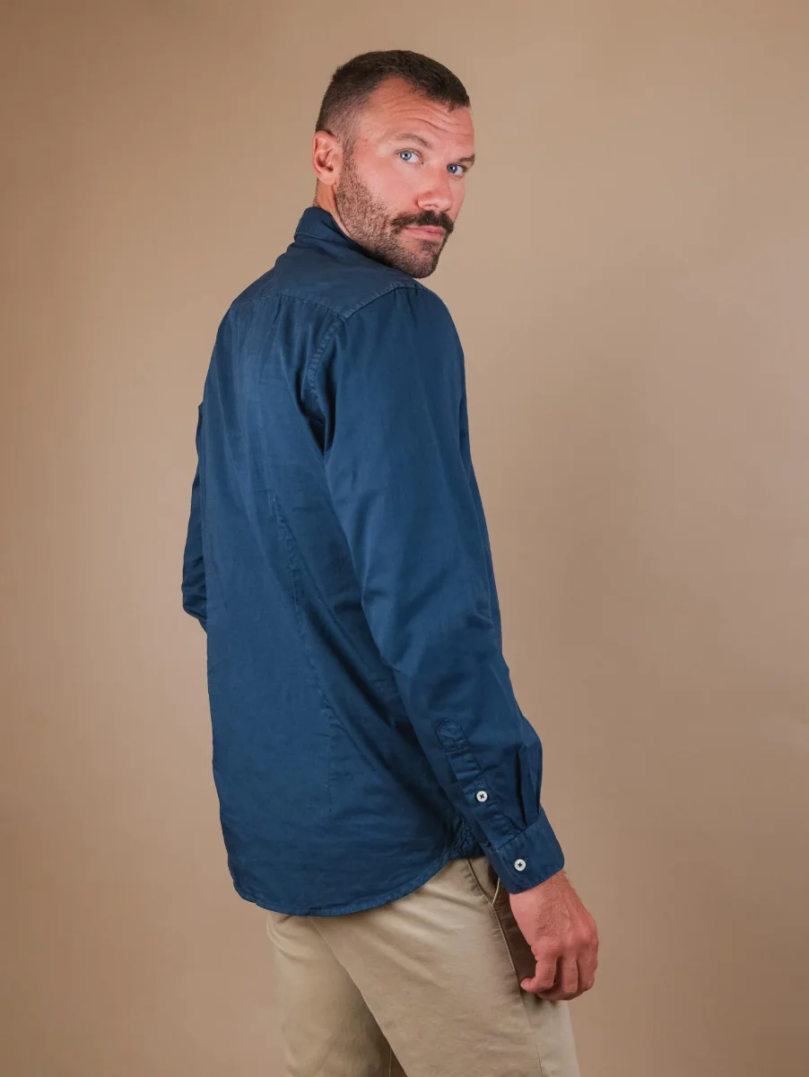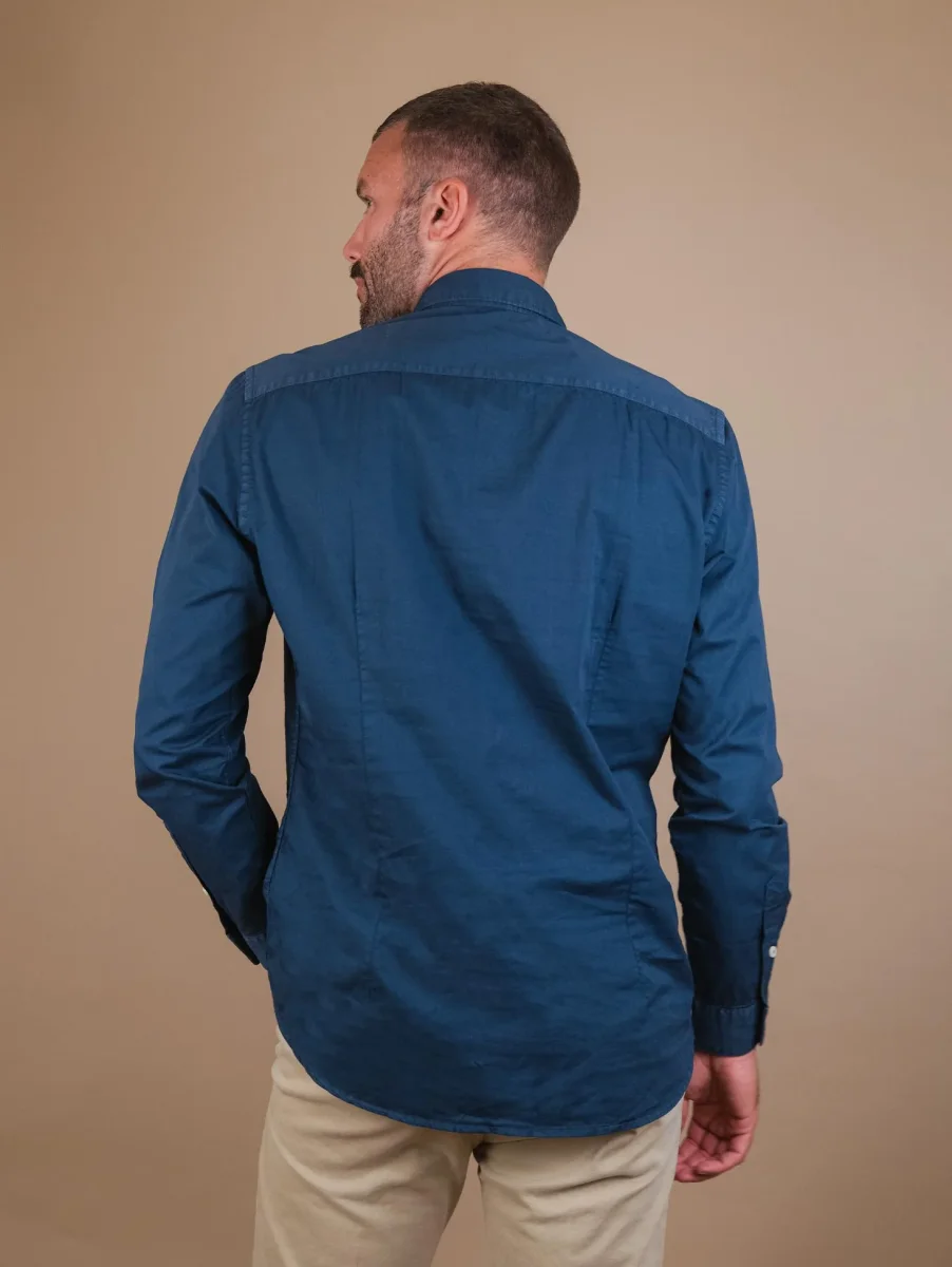 Camicia regular in cotone blu. Chiusura a bottoni in madreperla. Dettaglio doppio bottone su entrambi i polsi. Vestibilità regolare. Peso medio. Il modello è alto 1.87 e indossa una L.