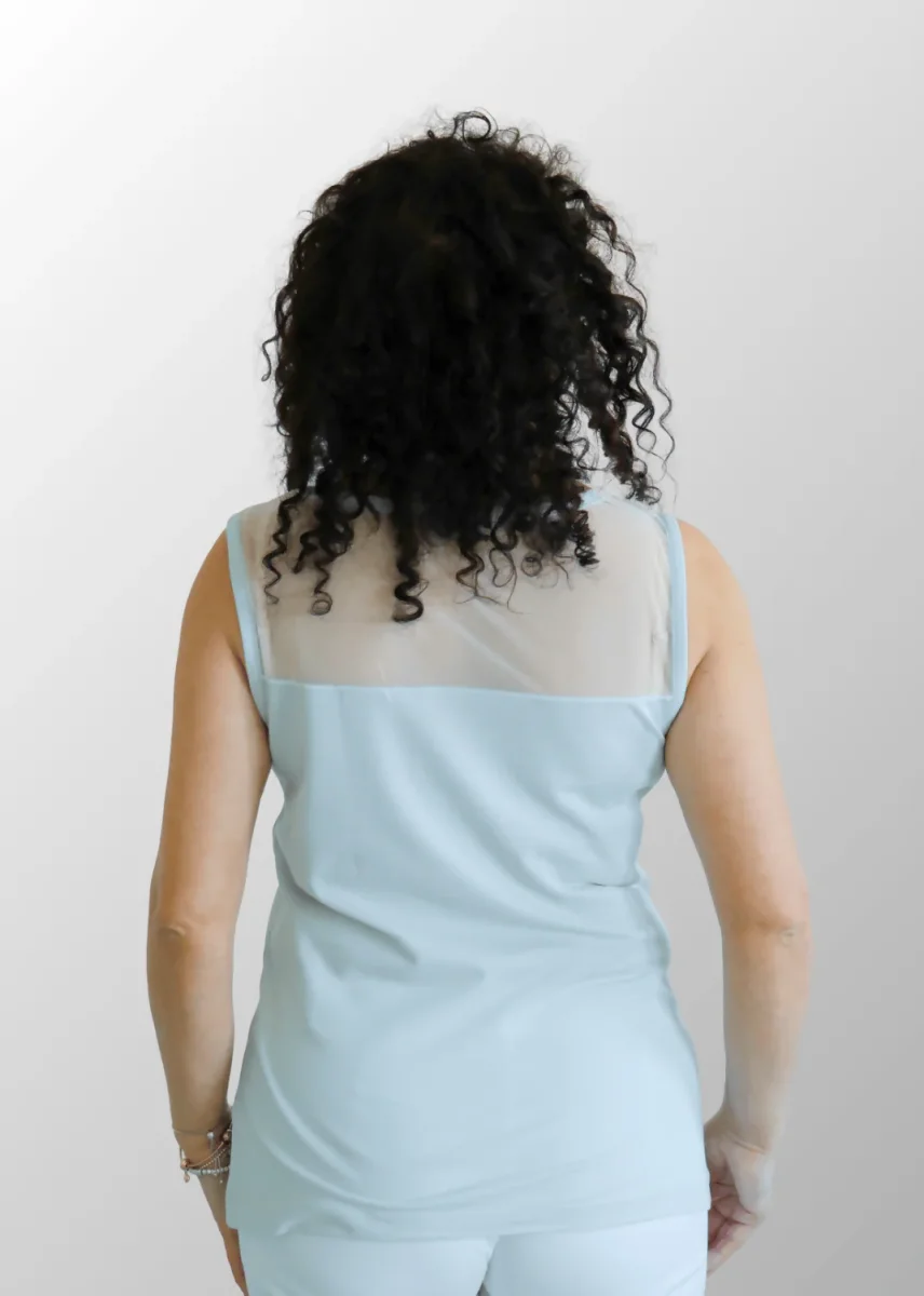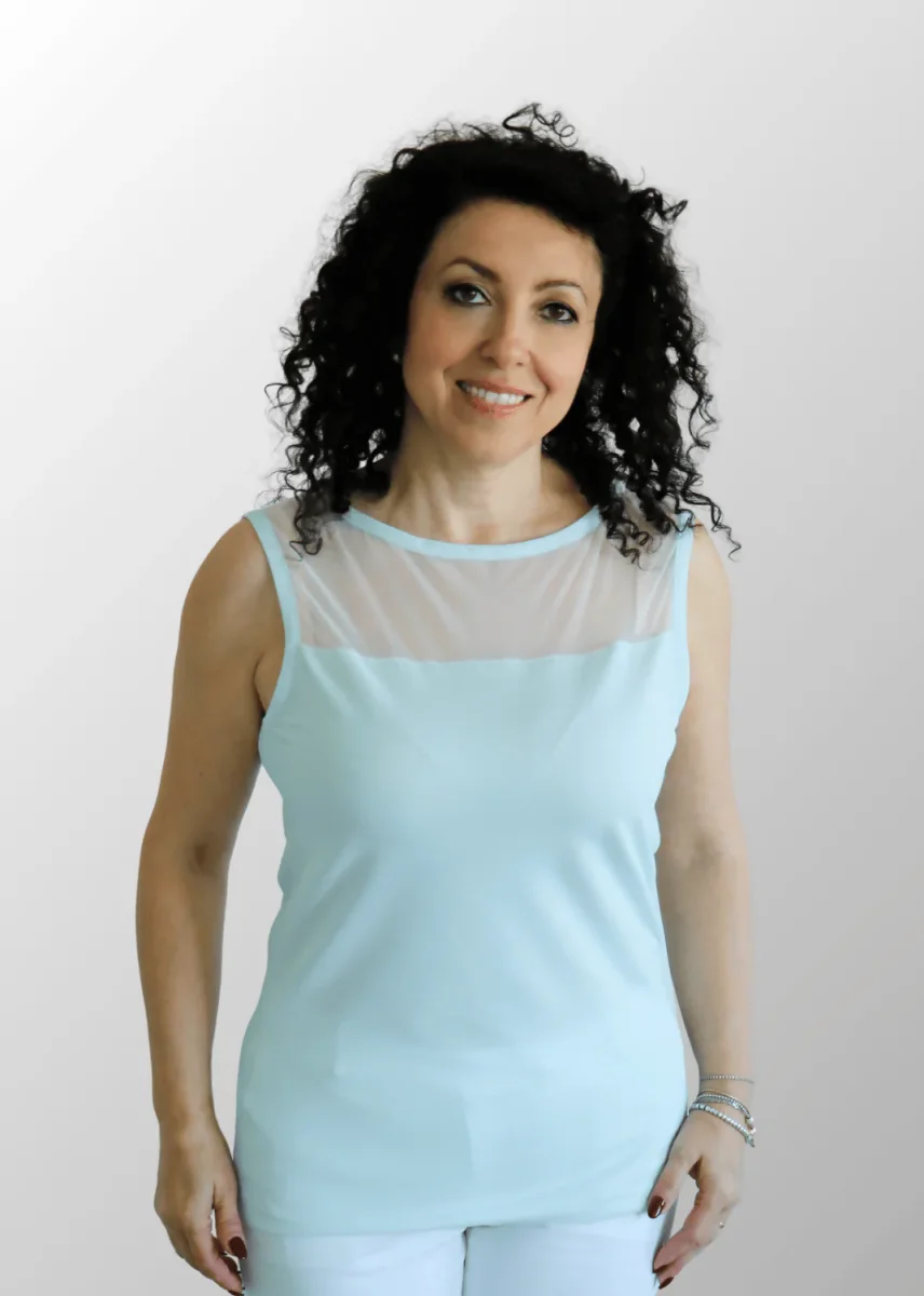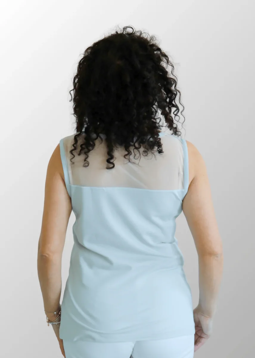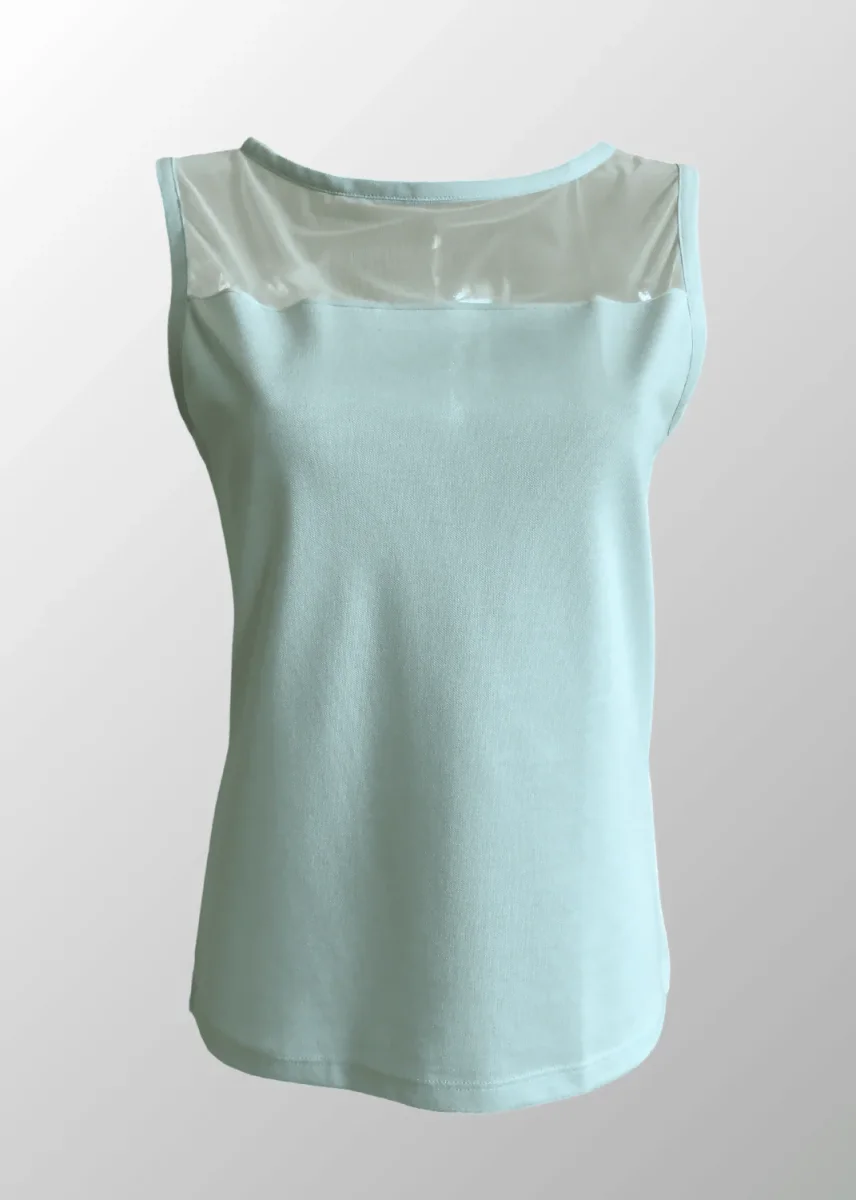 Canotta esternabile da donna in Cotone Seta, con tulle sul busto, sulle spalle e sulla schiena, un elemento che dona eleganza e maggior freschezza al capo. Il tessuto è realizzato in piquet, una particolare trama a “nido d’ape” nota per la sua resistenza e traspirabilità. Si tratta di un capo molto indicato per la stagione estiva che mantiene inalterate forma e lucentezza anche dopo numerosi lavaggi. Look sia casual che elegante per ogni occasione. Perfetto anche come sottogiacca.
