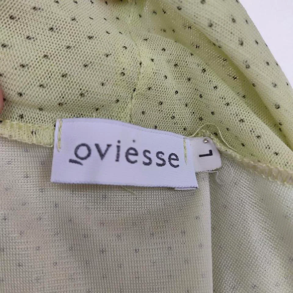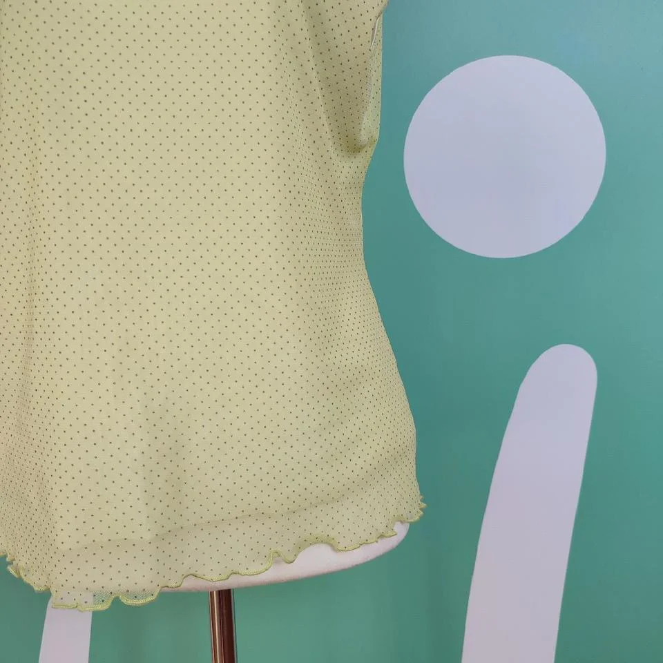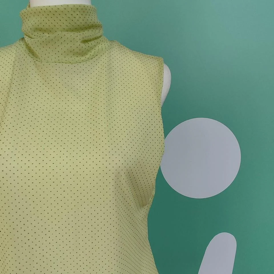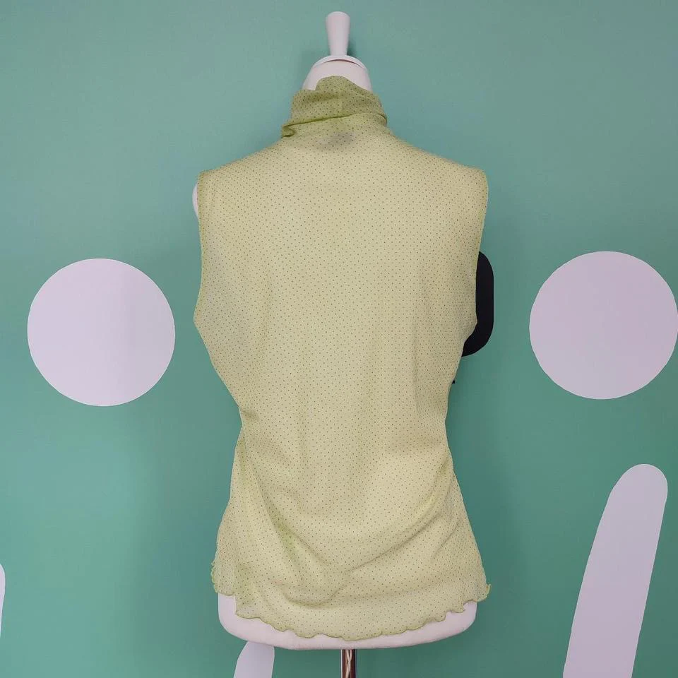 Blusa smanicata Oviesse, color verde lime a pois neri, taglia L. Tessuto leggero e morbito, collo alto e e taglio ondulato sul fondo, l’etichetta è stata tagliata quindi non si legge la composizione del materiale, a tatto presumibilmente poliestere. Condizioni buone.