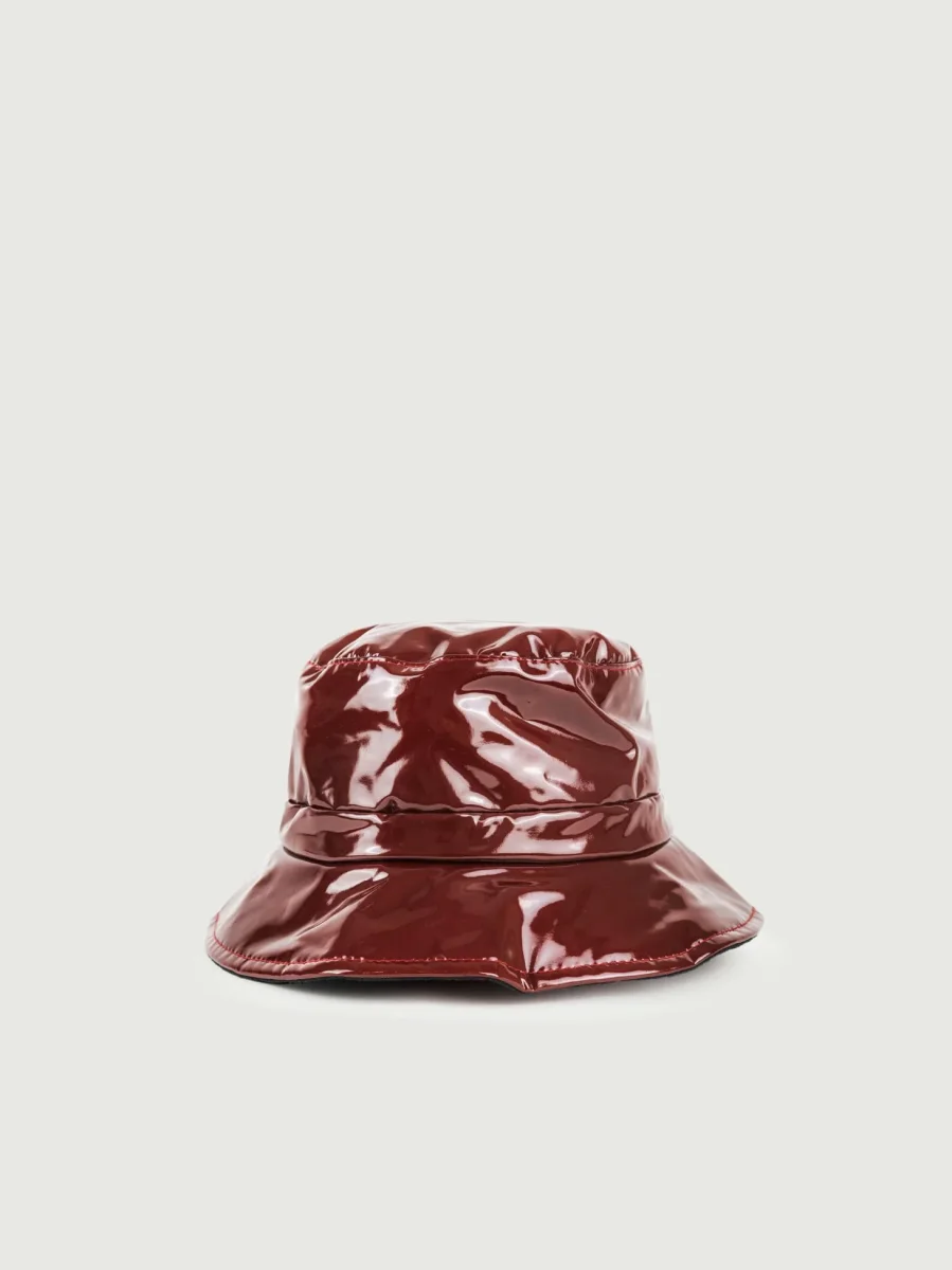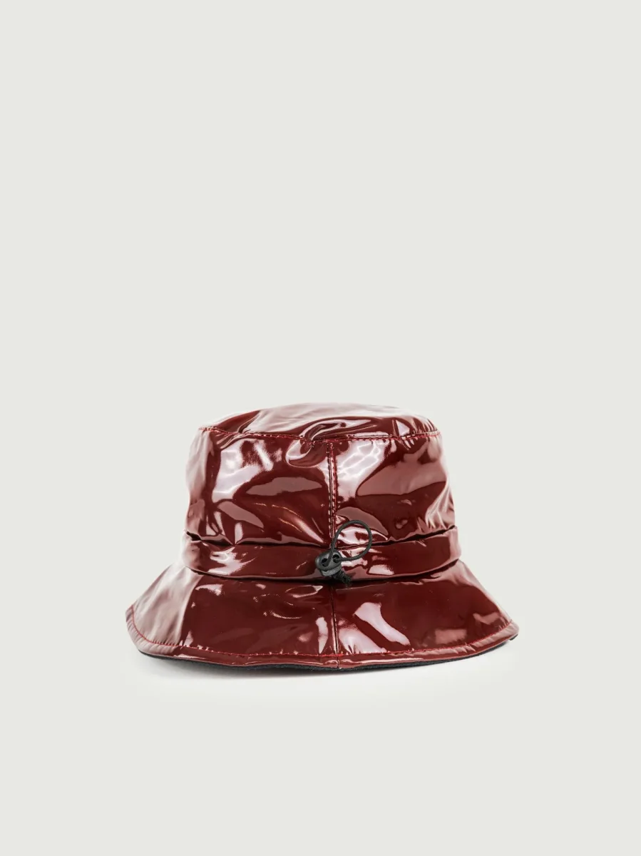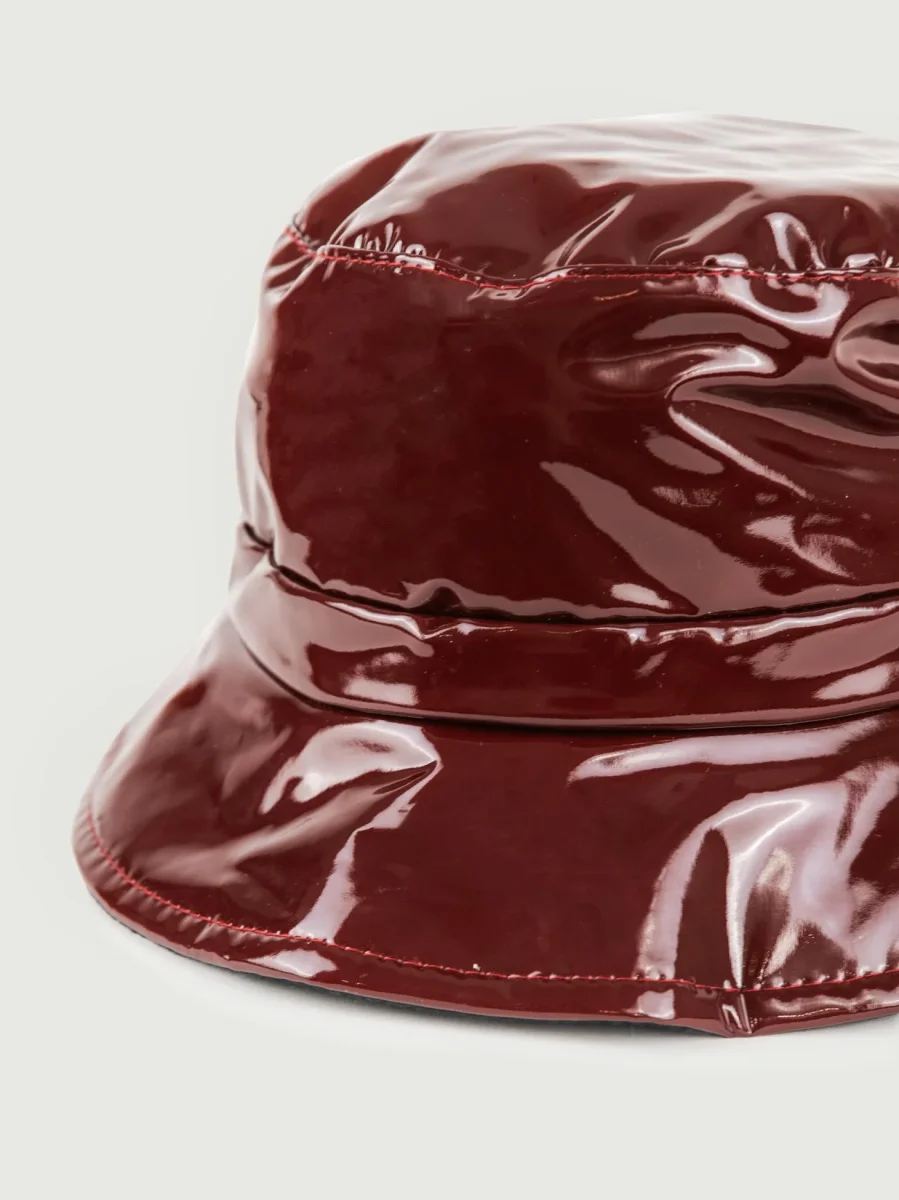 Cappello buket da pioggia in vernice bordeaux con elastico regolabile.