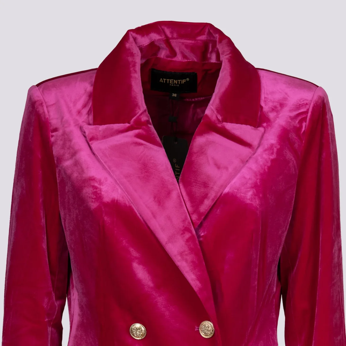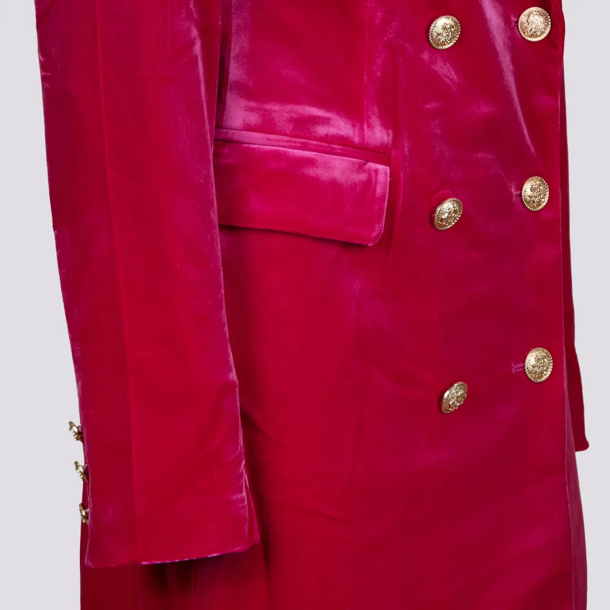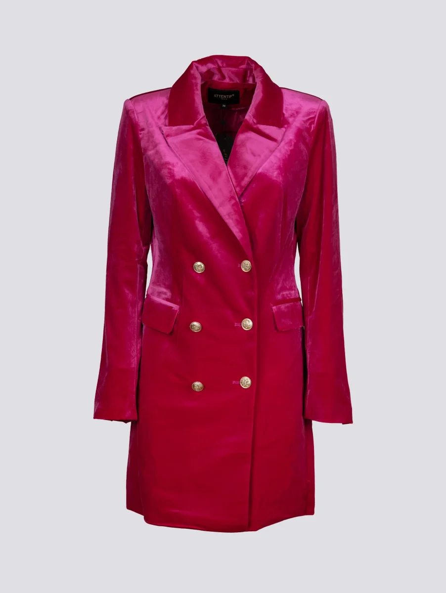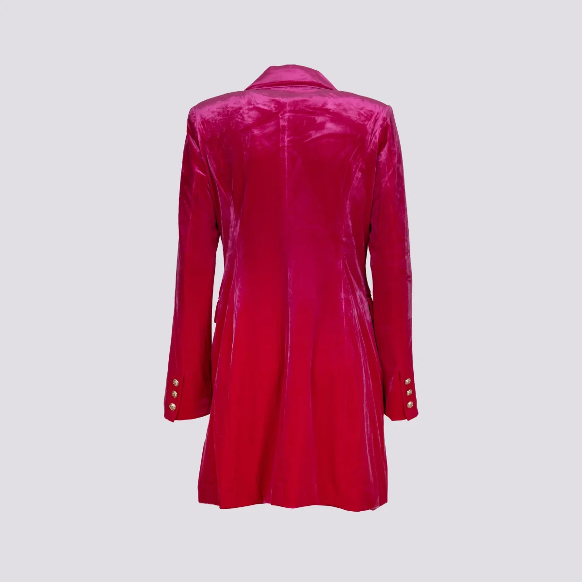 Cappottino doppiopetto in velluto fucsia. Dettaglio bottoni oro. Le spalle leggermente imbottite rendono la struttura del capo più importante ed elegante. Interno foderato in tessuto. Finte tasche applicate su entrambi i lati. Peso medio. Vestibilità regolare con taglie francesi.
