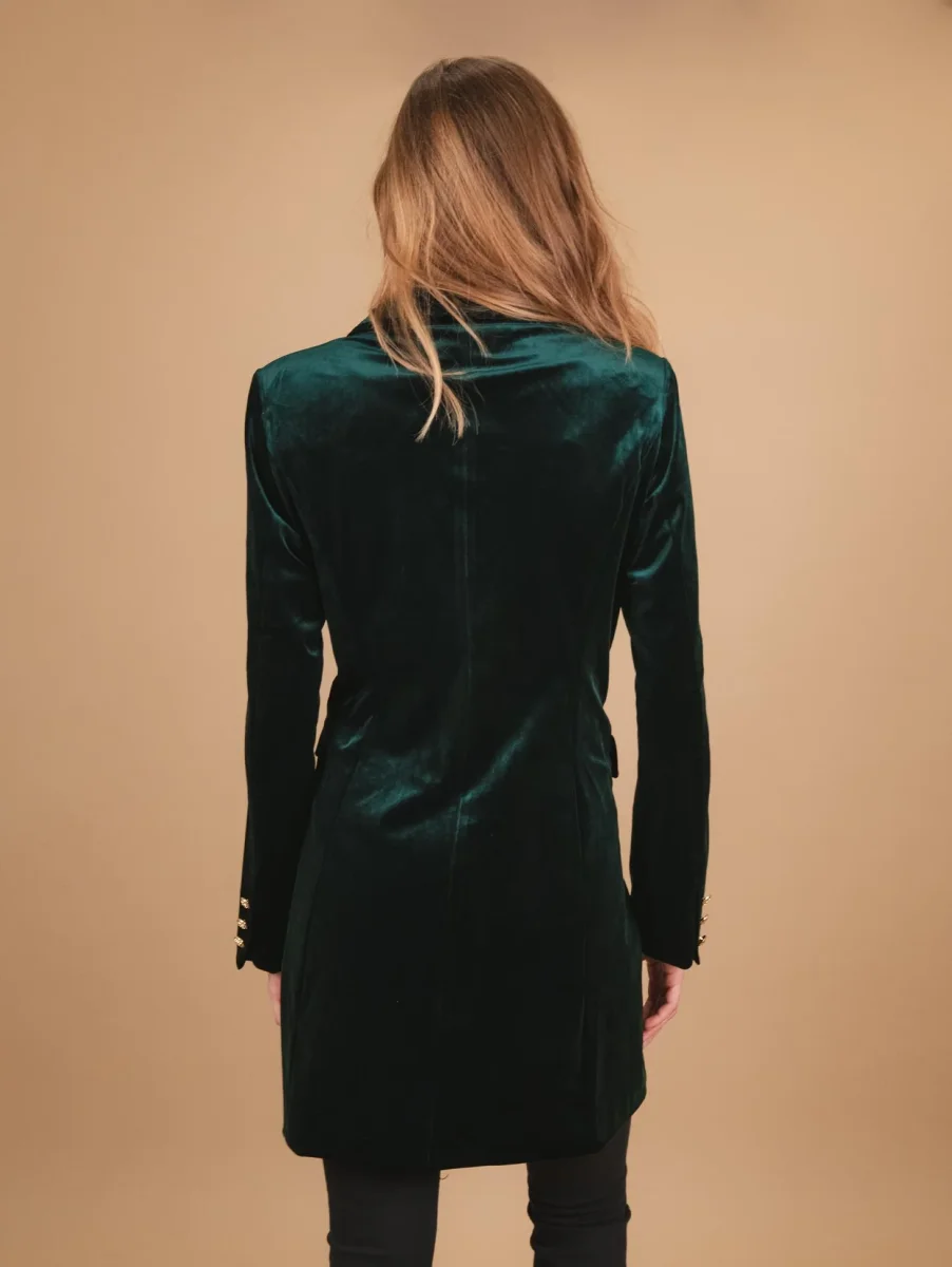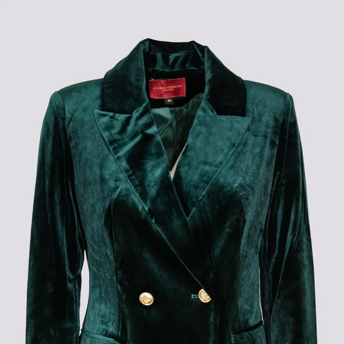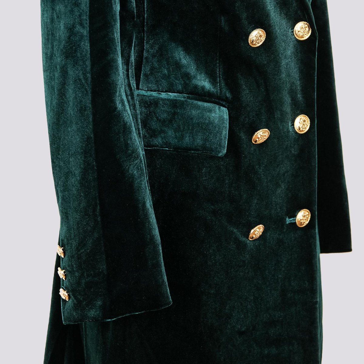 Cappottino doppiopetto in velluto verde smeraldo. Dettaglio bottoni oro. Le spalle leggermente imbottite rendono la struttura del capo più importante ed elegante. Interno foderato in tessuto. Finte tasche applicate su entrambi i lati. Peso medio. Vestibilità regolare con taglie francesi.