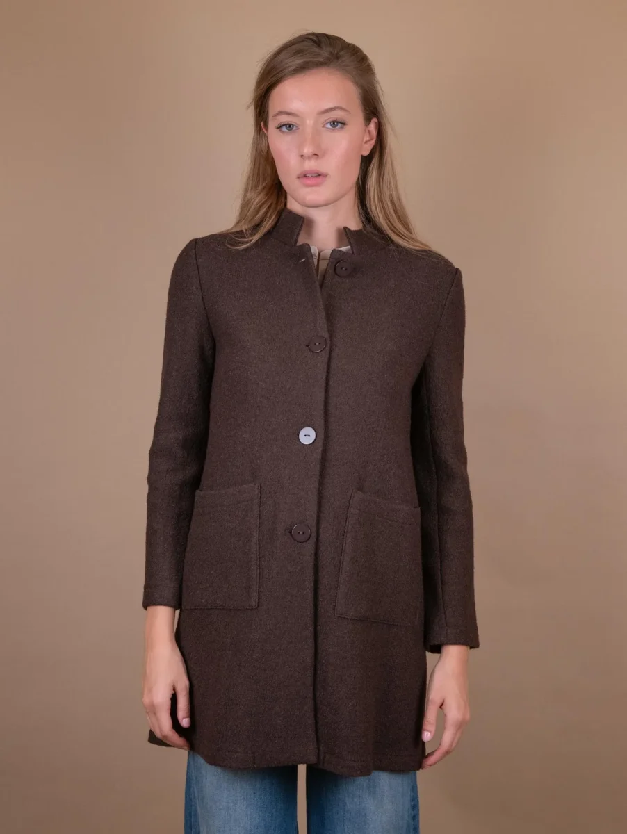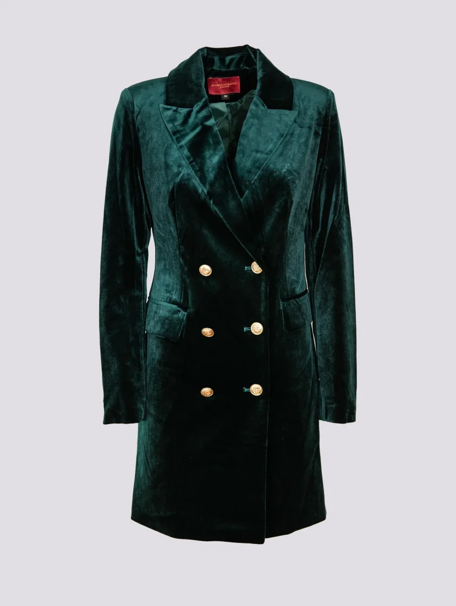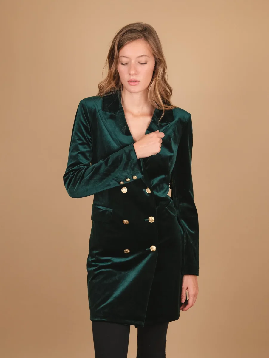 Cappottino doppiopetto in velluto verde smeraldo. Dettaglio bottoni oro. Le spalle leggermente imbottite rendono la struttura del capo più importante ed elegante. Interno foderato in tessuto. Finte tasche applicate su entrambi i lati. Peso medio. Vestibilità regolare con taglie francesi.