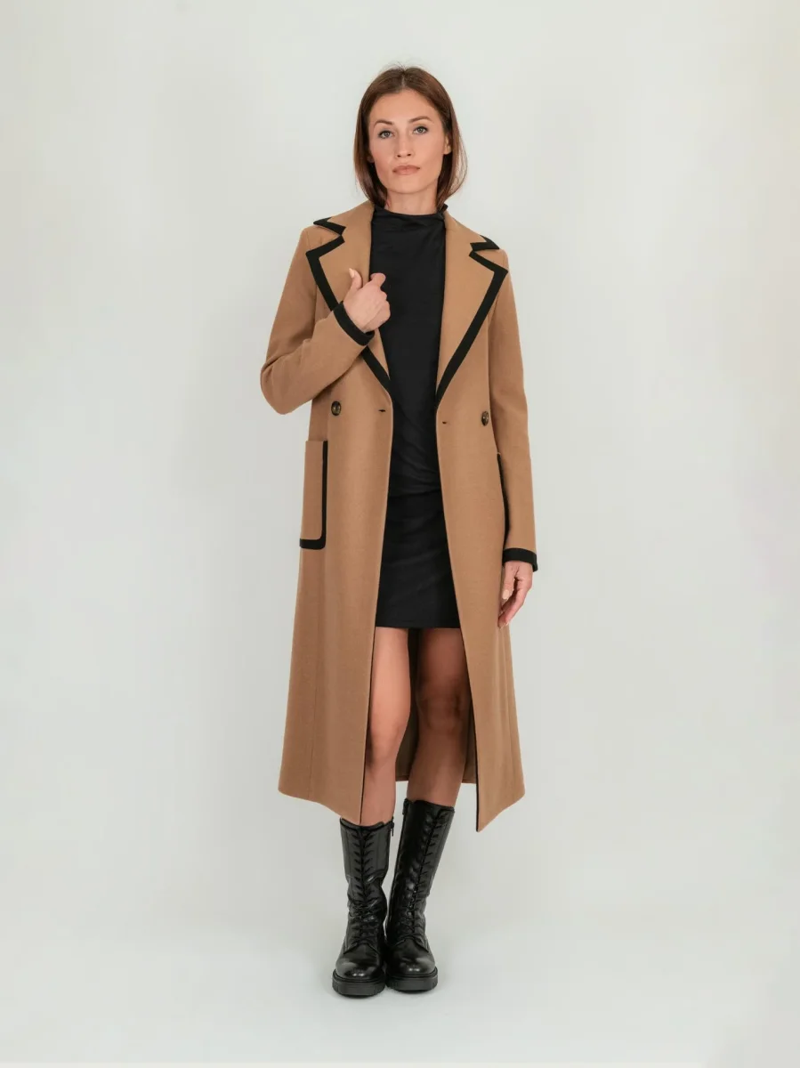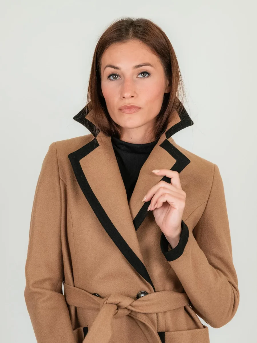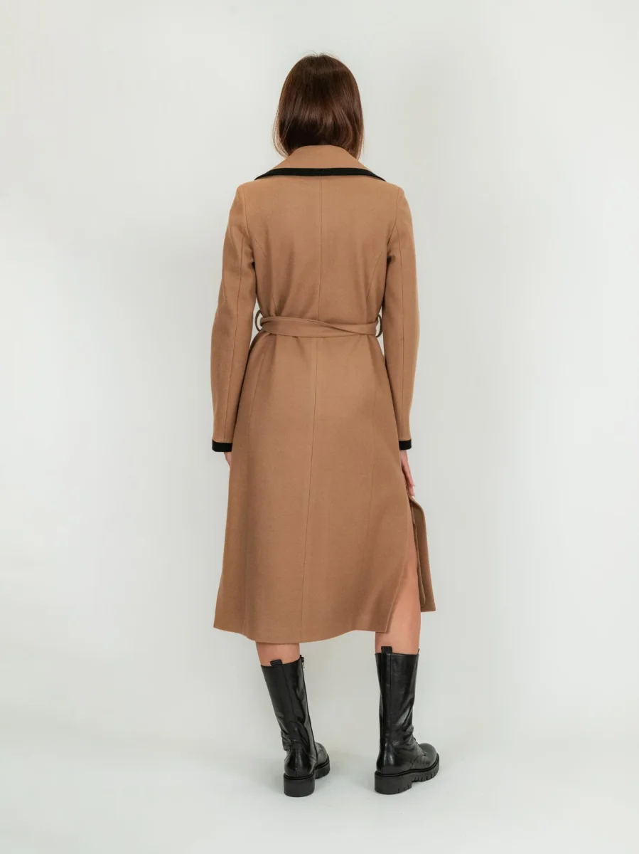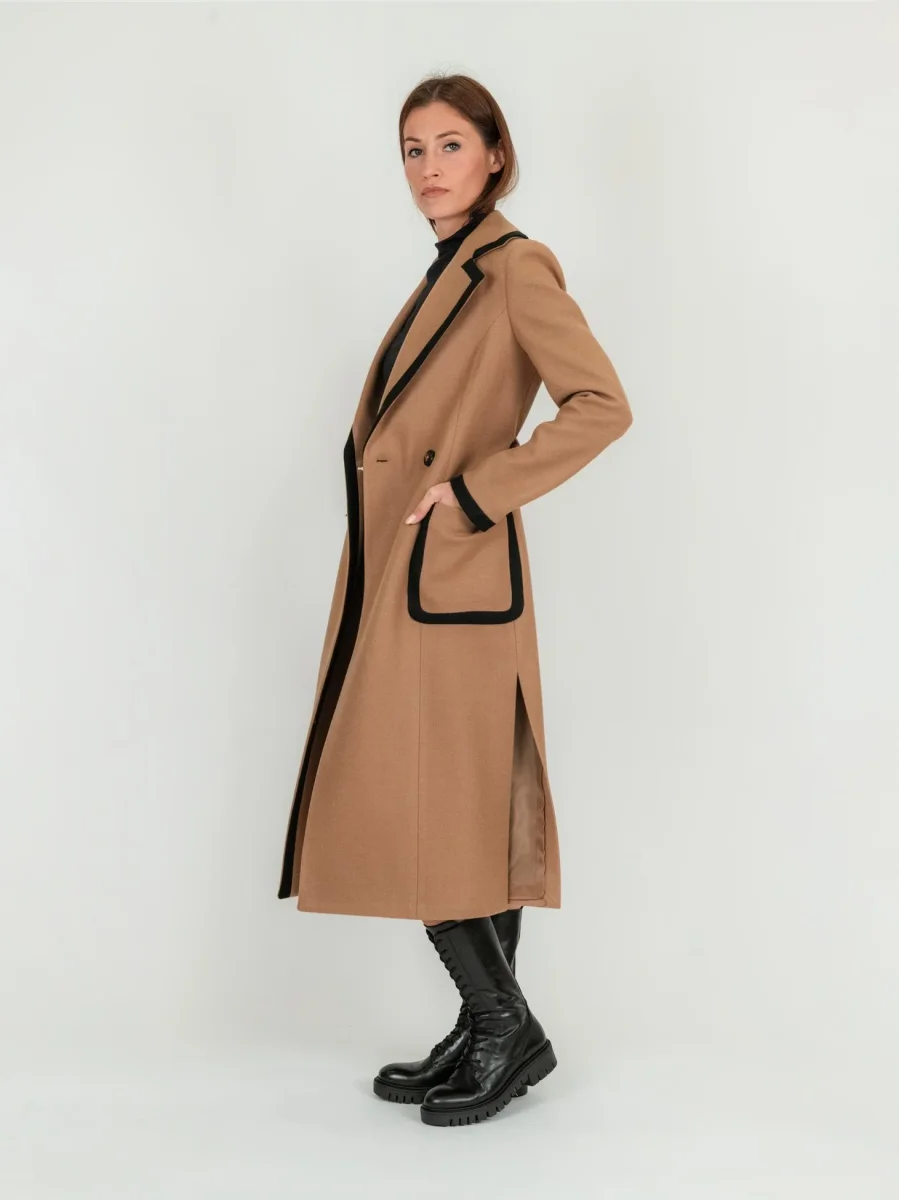 Cappotto doppiopetto lungo cammello con profili a contrasto neri, spacchi laterali e cintura.