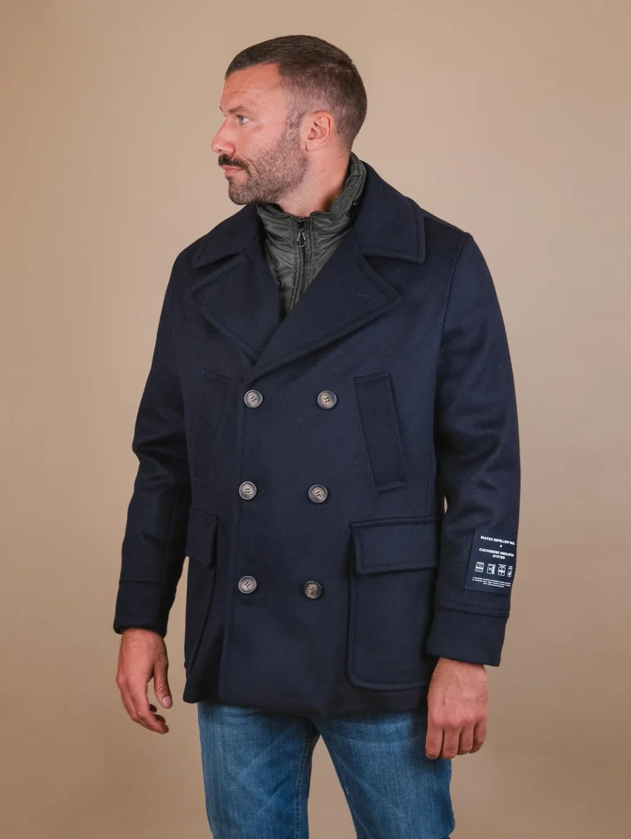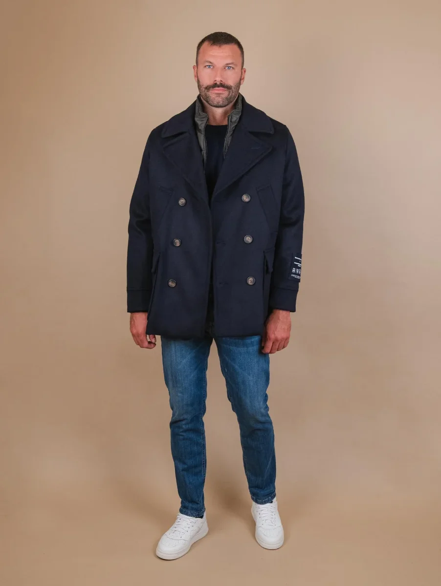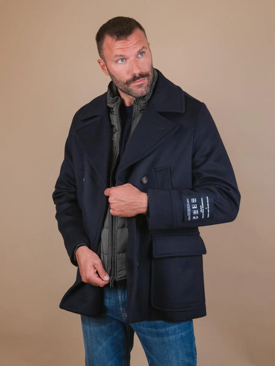 Cappotto doppiopetto in lana misto cashmere blu. Imbottitura interna in poliestere riciclato. Possibilità di rimuovere il gilet imbottito a seconda delle preferenze. Doppia chiusura frontale: con zip per la parte in nylon e a bottoni per la parte in lana e cashmere. Cappuccio rimovibile nascosto nel collo e regolato a chiusura zip. La parte in lana presenta una doppia tasca a filo sulla parte soperiore e due tasche applicate sulla parte inferiore. Dettaglio bottoni automatici sul retro per aggiungere volume al design del capo. Collo rever grosso. I materiali utilizzati per la creazione di questo capo sono stati studiati per essere idrorepellenti e proteggere il corpo dal freddo il più possibile. Composizione esterna: 10% cashmere 60% lana 30% poliestere. Composizione interna: 100% poliestere riciclato. Vestibilità regolare. Peso abbondante. Il modello è alto 1.87 e indossa una 50.