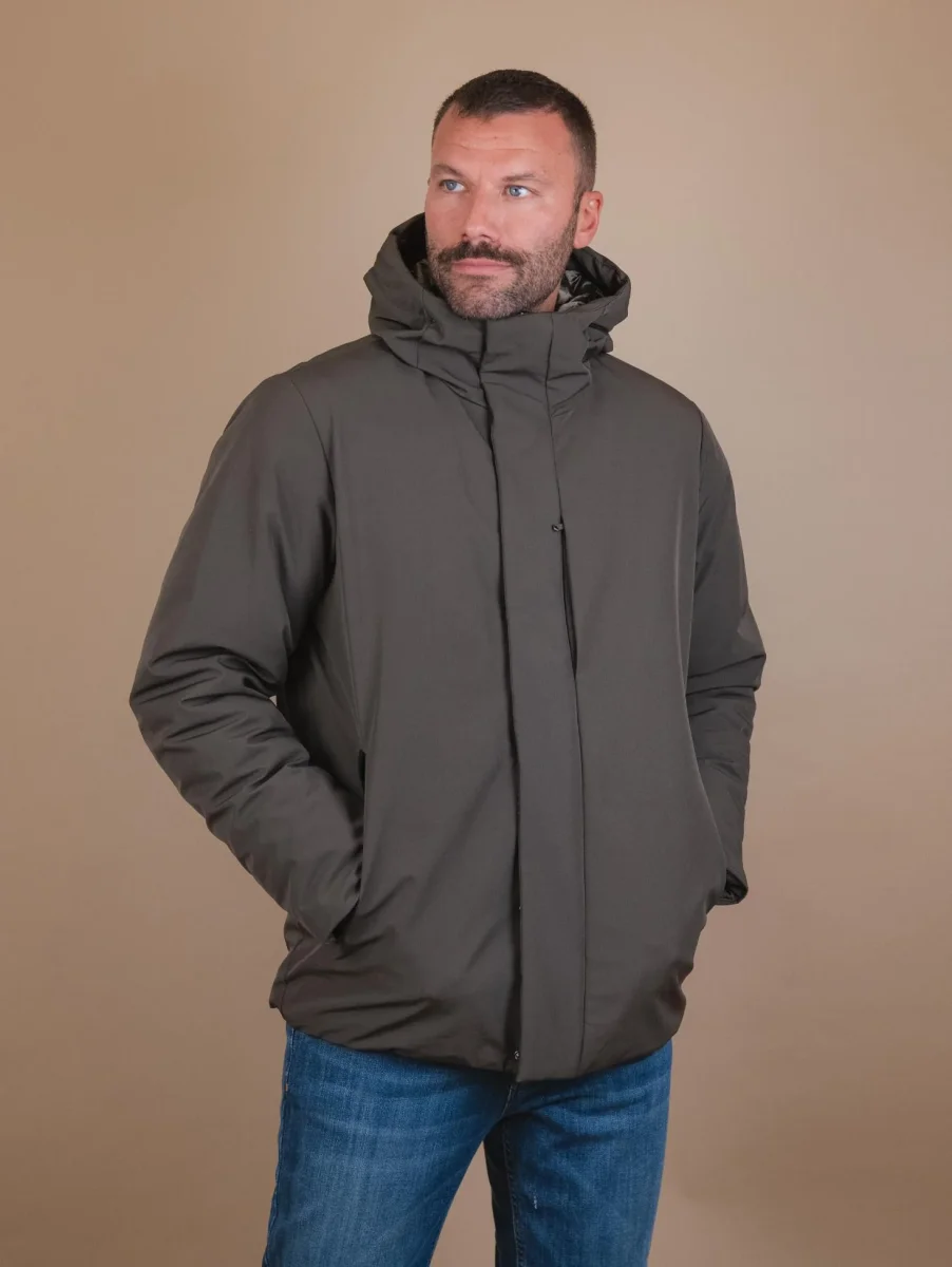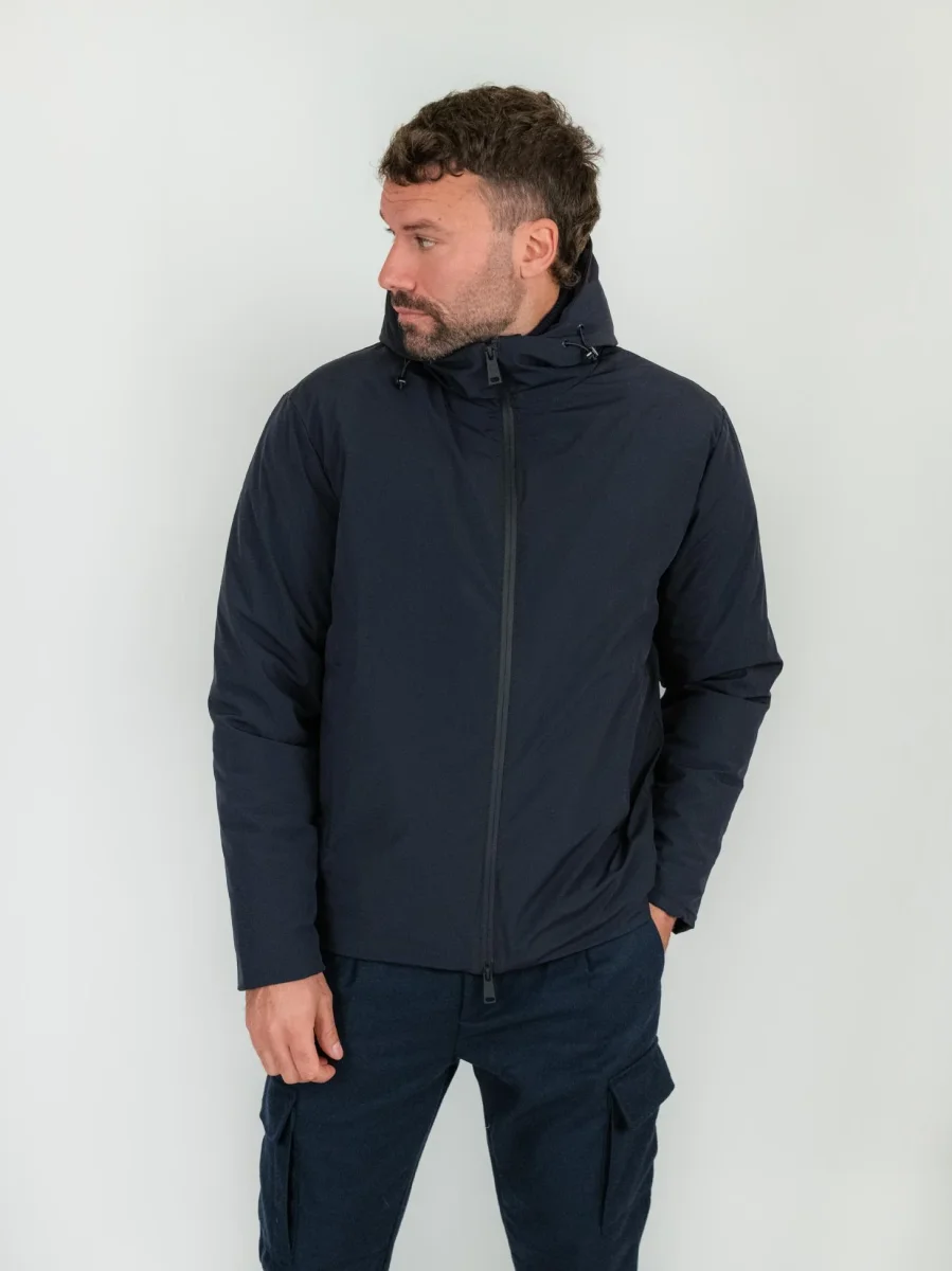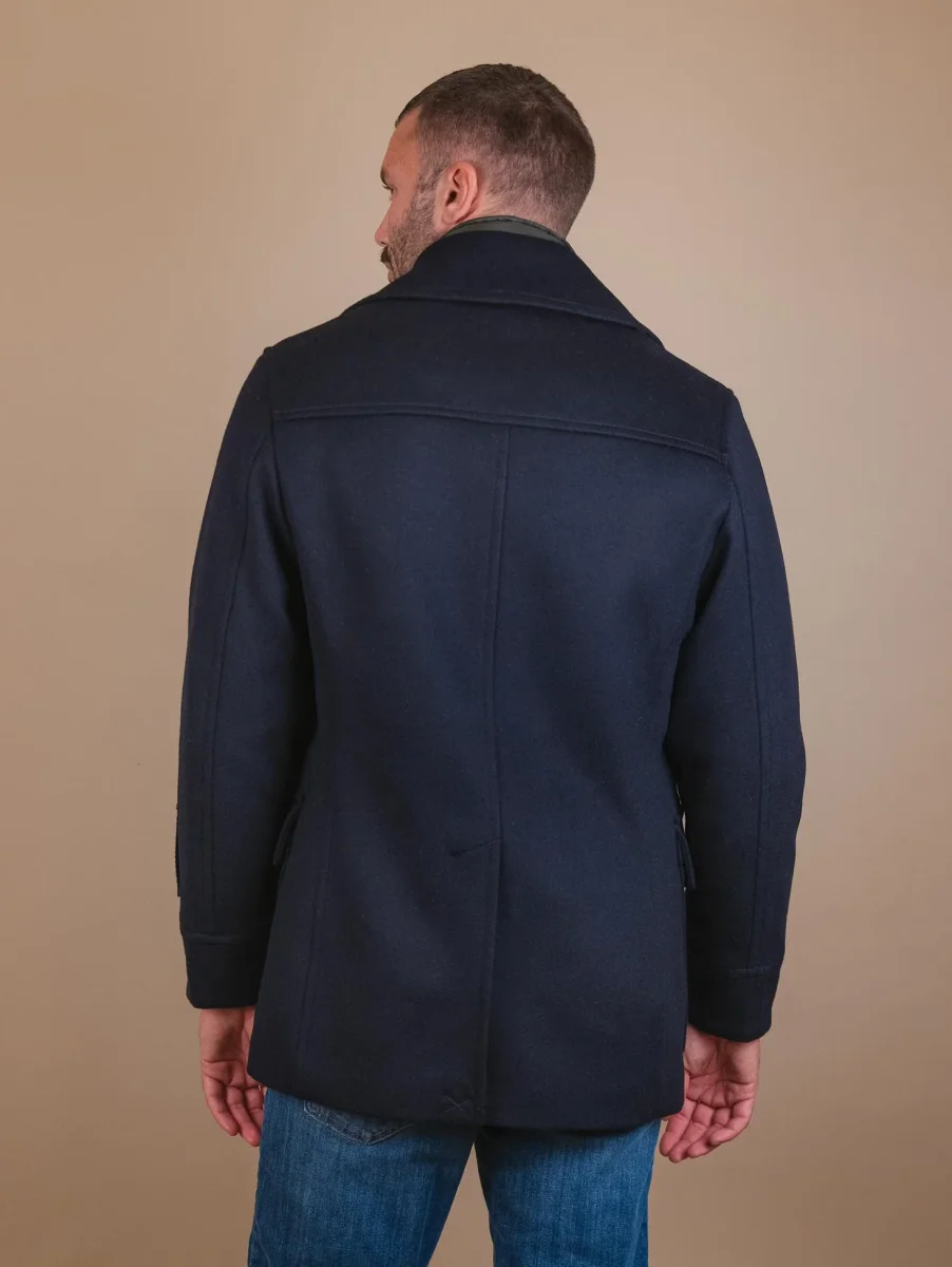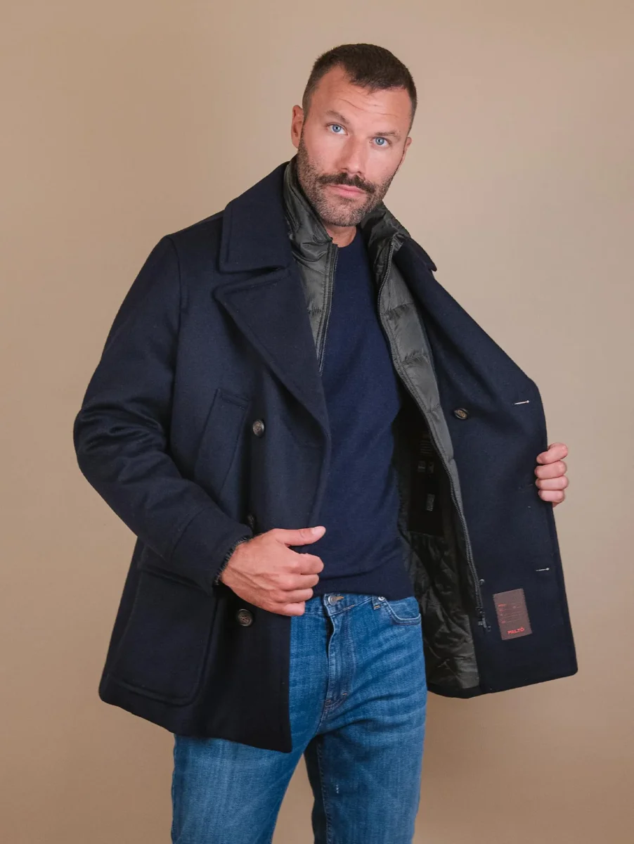 Cappotto doppiopetto in lana misto cashmere blu. Imbottitura interna in poliestere riciclato. Possibilità di rimuovere il gilet imbottito a seconda delle preferenze. Doppia chiusura frontale: con zip per la parte in nylon e a bottoni per la parte in lana e cashmere. Cappuccio rimovibile nascosto nel collo e regolato a chiusura zip. La parte in lana presenta una doppia tasca a filo sulla parte soperiore e due tasche applicate sulla parte inferiore. Dettaglio bottoni automatici sul retro per aggiungere volume al design del capo. Collo rever grosso. I materiali utilizzati per la creazione di questo capo sono stati studiati per essere idrorepellenti e proteggere il corpo dal freddo il più possibile. Composizione esterna: 10% cashmere 60% lana 30% poliestere. Composizione interna: 100% poliestere riciclato. Vestibilità regolare. Peso abbondante. Il modello è alto 1.87 e indossa una 50.
