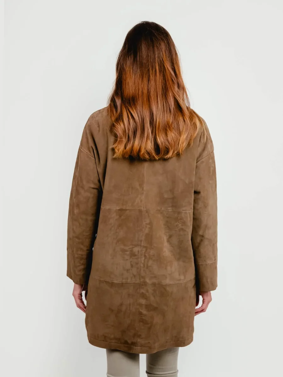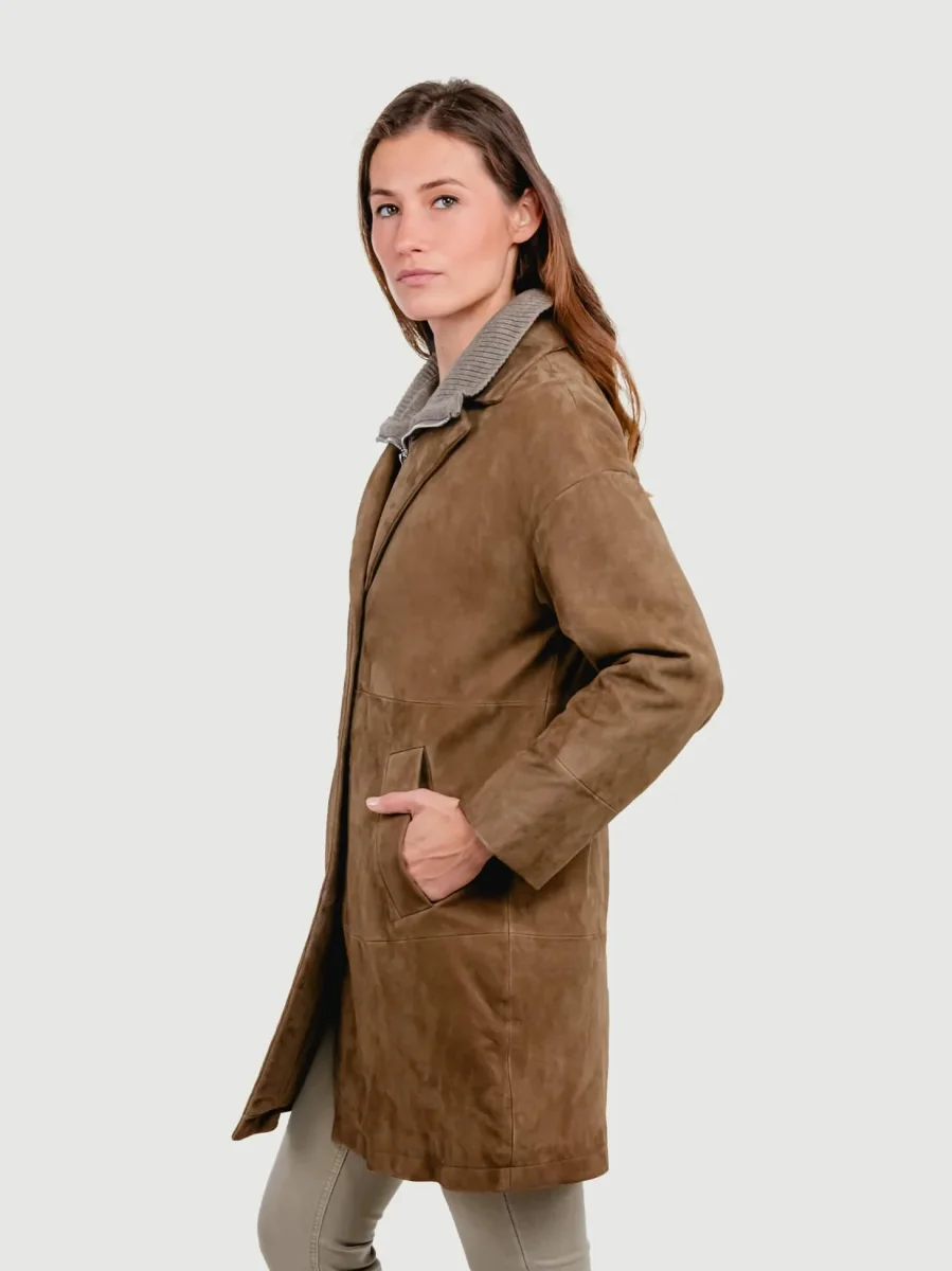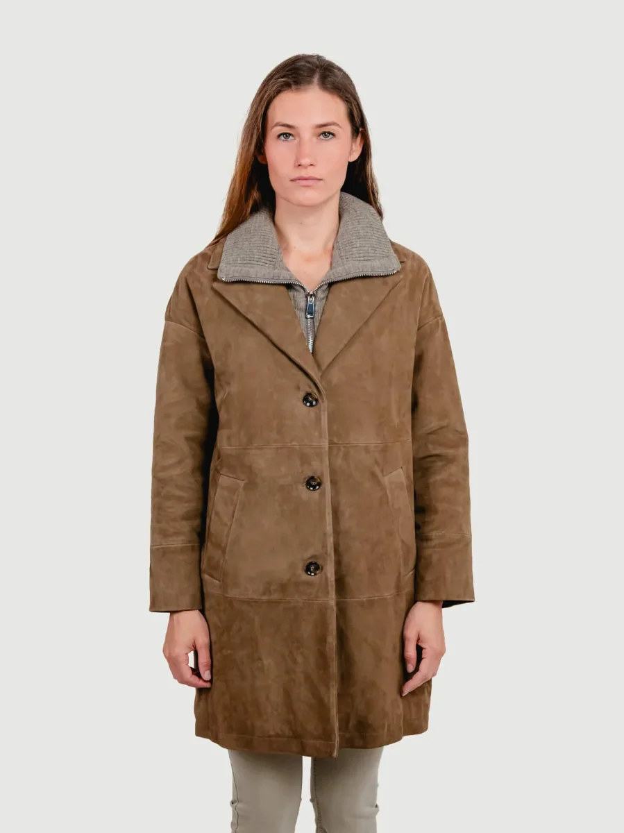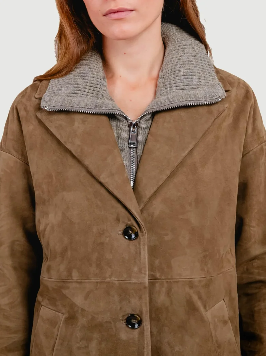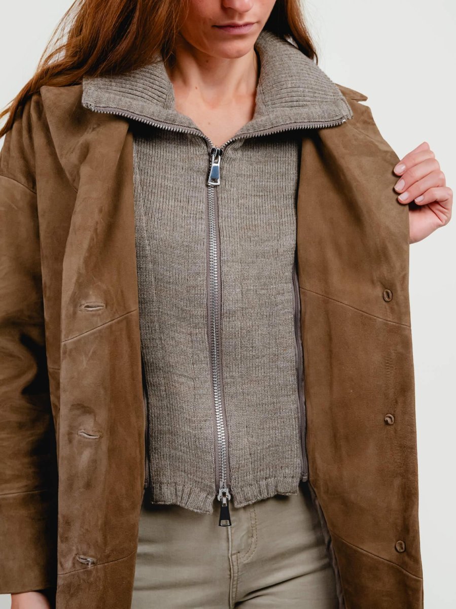 Parte separabile centrale in lana taupe con maxi collo con chiusura zip.