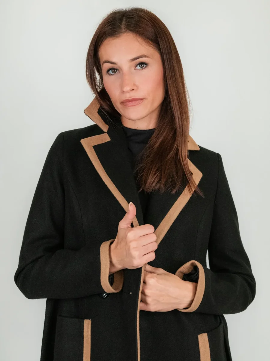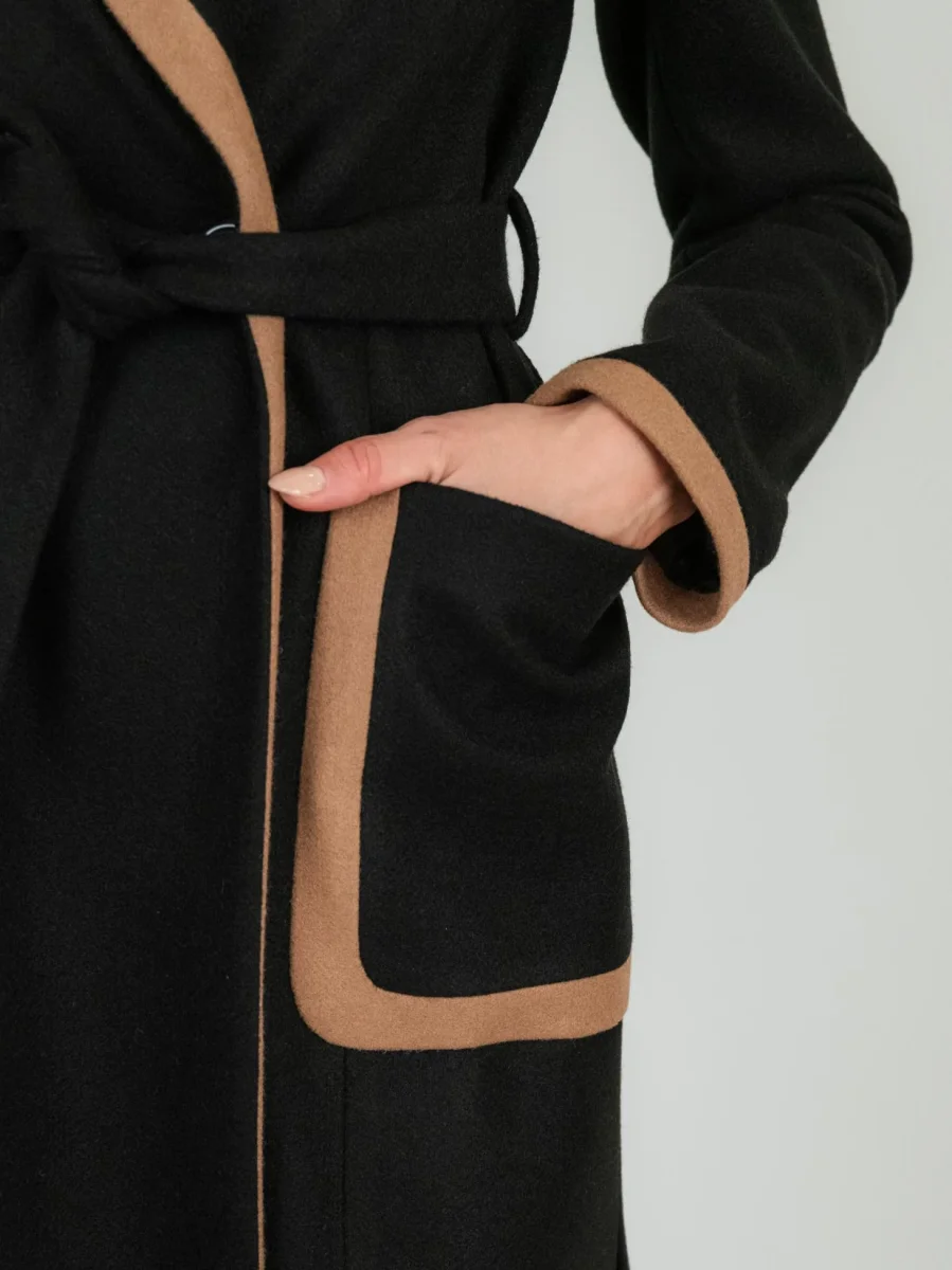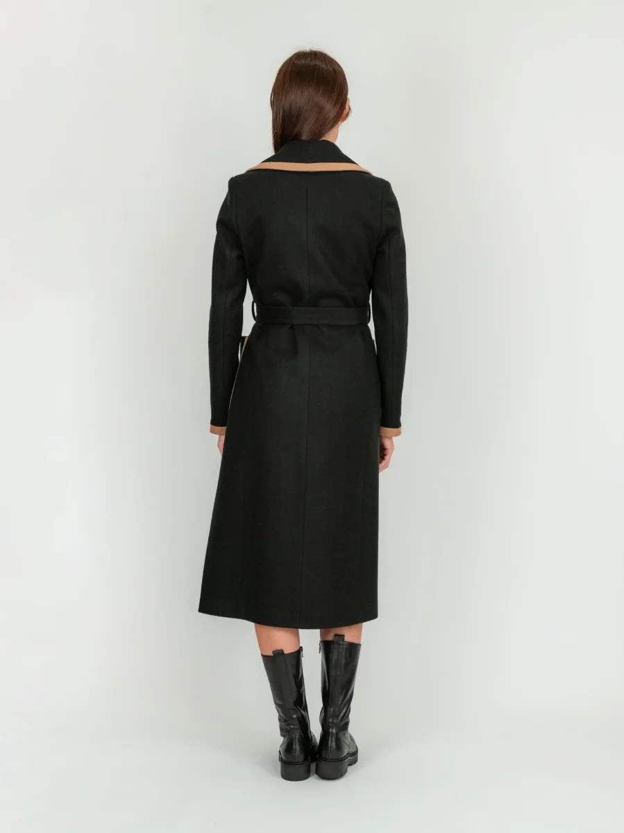 Cappotto doppiopetto lungo, nero con profili a contrasto cammello, spacchi laterali e cintura.