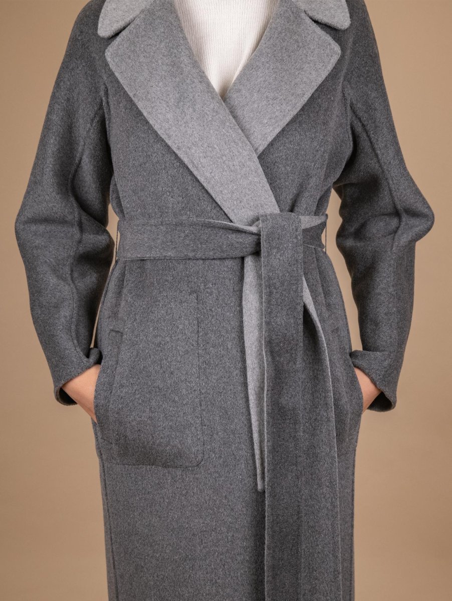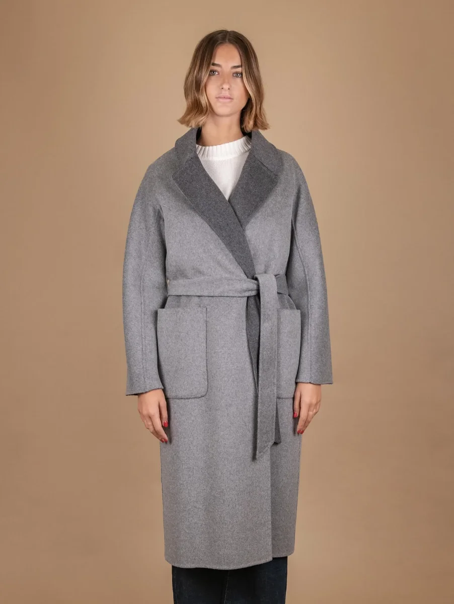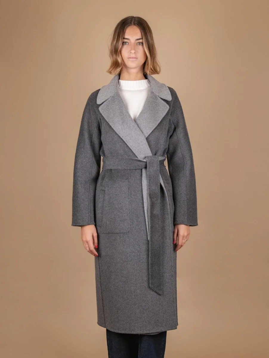 Cappotto reversibile in misto lana antracite e grigio perla con cintura e maxi tasche. Un capospalla caldo ed elegante da sfruttare tutto l’inverno portato sopra a un piumino cento grammi nei giorni più freddi, La parte antracite del capo presenta una doppia maxi tasca applicata mentre quella grigio perla doppia tasca a filo. Possibilità di scelta a seconda delle preferenze. Dettaglio collo rever semplice. Composizione: 70% lana 30% poliestere. Vestibilità regolare tendenzialmente morbida. Peso abbondante. La modella è alta 1.81 e indossa una S.