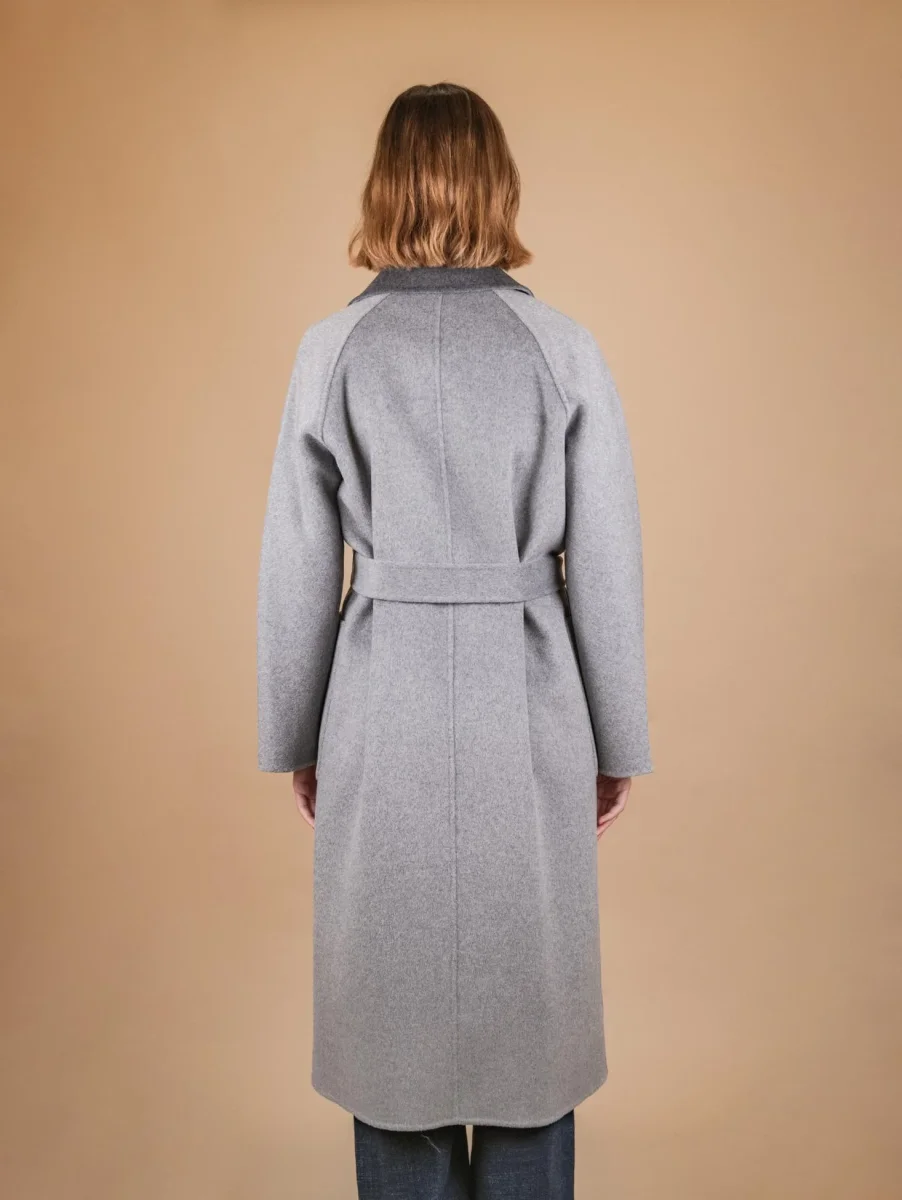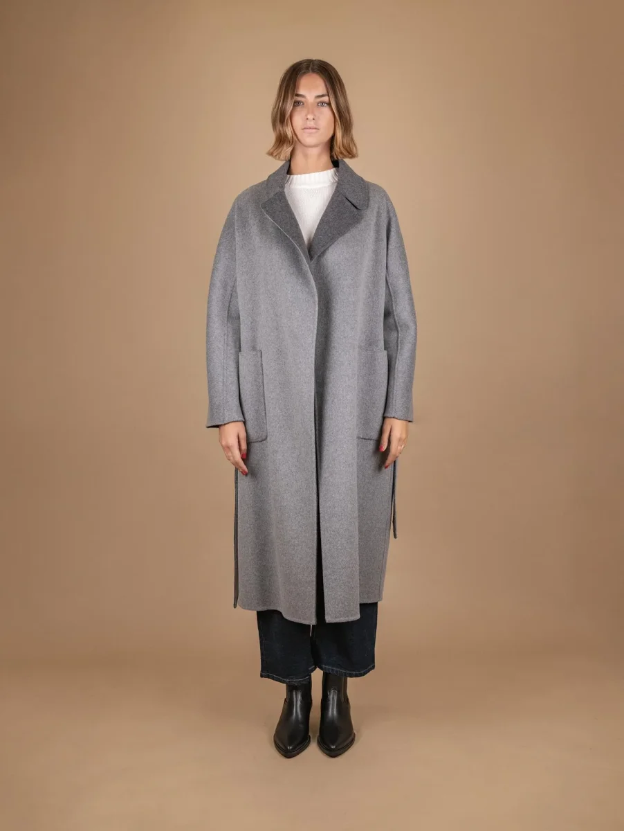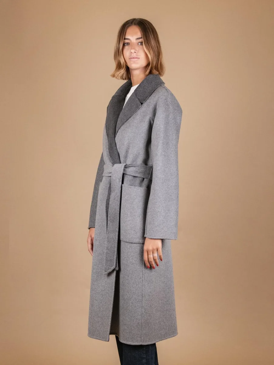Cappotto reversibile in misto lana antracite e grigio perla con cintura e maxi tasche. Un capospalla caldo ed elegante da sfruttare tutto l’inverno portato sopra a un piumino cento grammi nei giorni più freddi, La parte antracite del capo presenta una doppia maxi tasca applicata mentre quella grigio perla doppia tasca a filo. Possibilità di scelta a seconda delle preferenze. Dettaglio collo rever semplice. Composizione: 70% lana 30% poliestere. Vestibilità regolare tendenzialmente morbida. Peso abbondante. La modella è alta 1.81 e indossa una S.