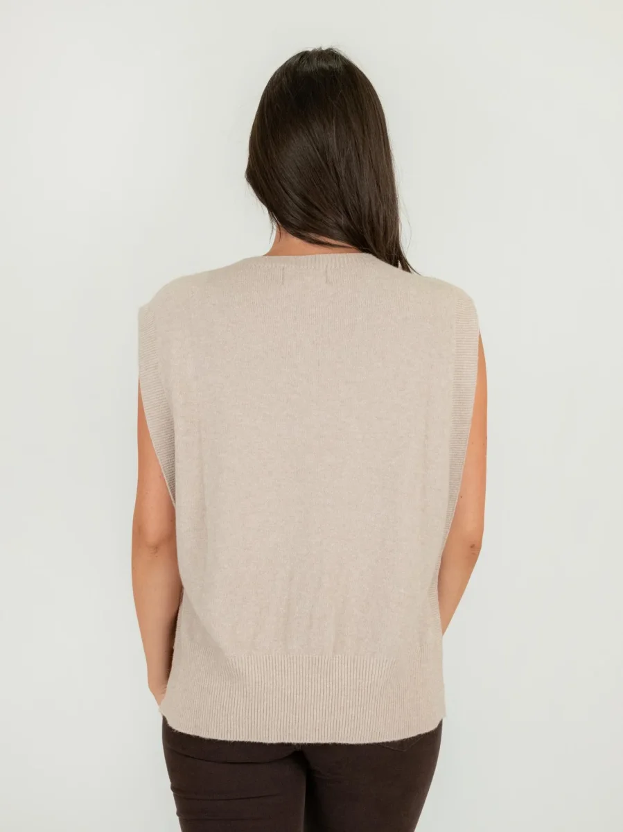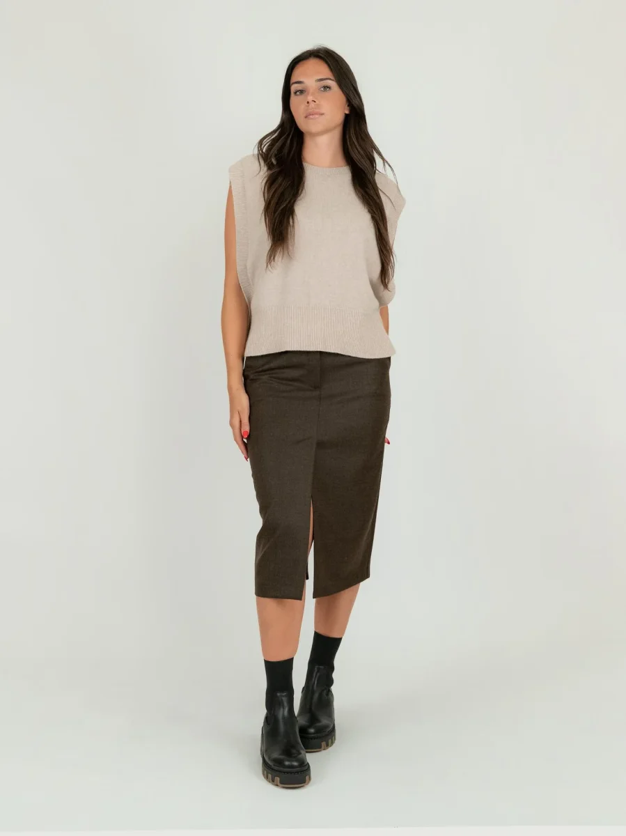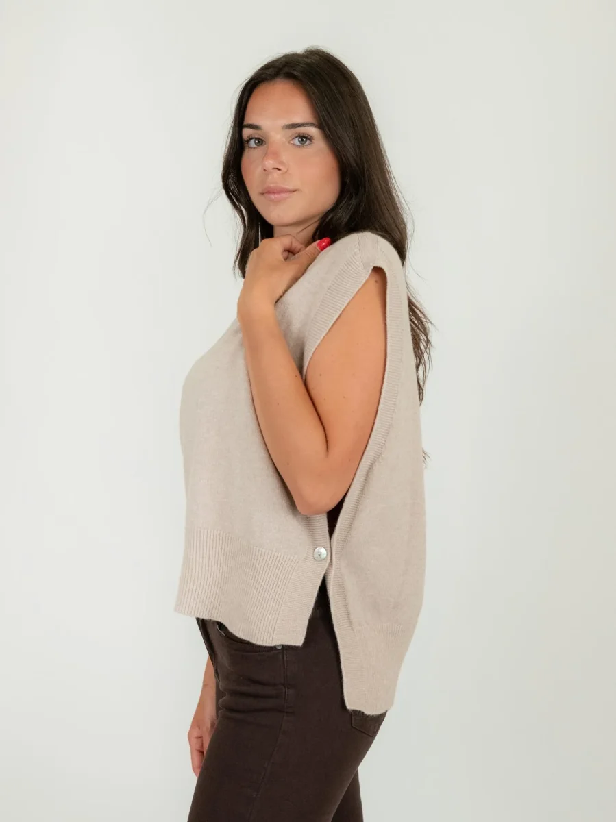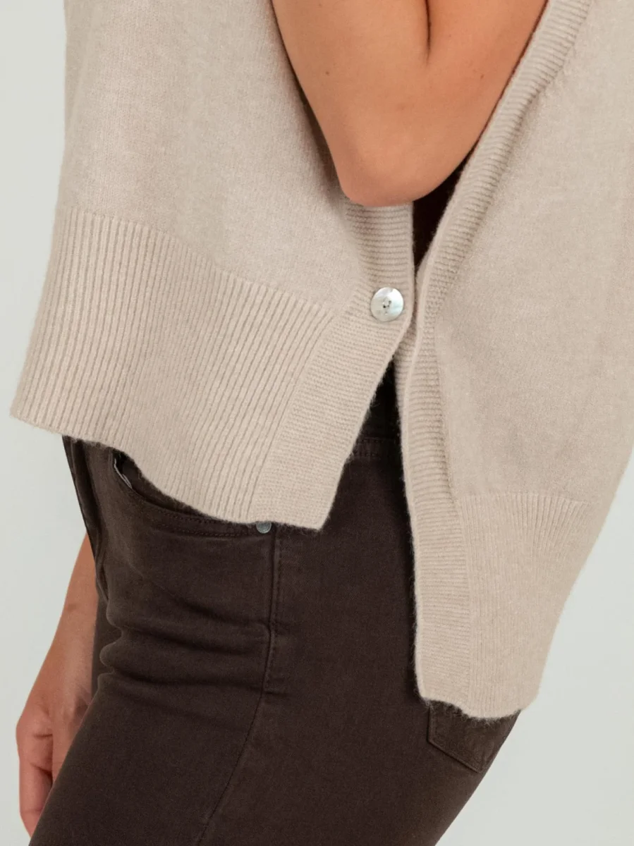 Gilet girocollo in maglia beige con apertura laterale e retro asimmetrico.