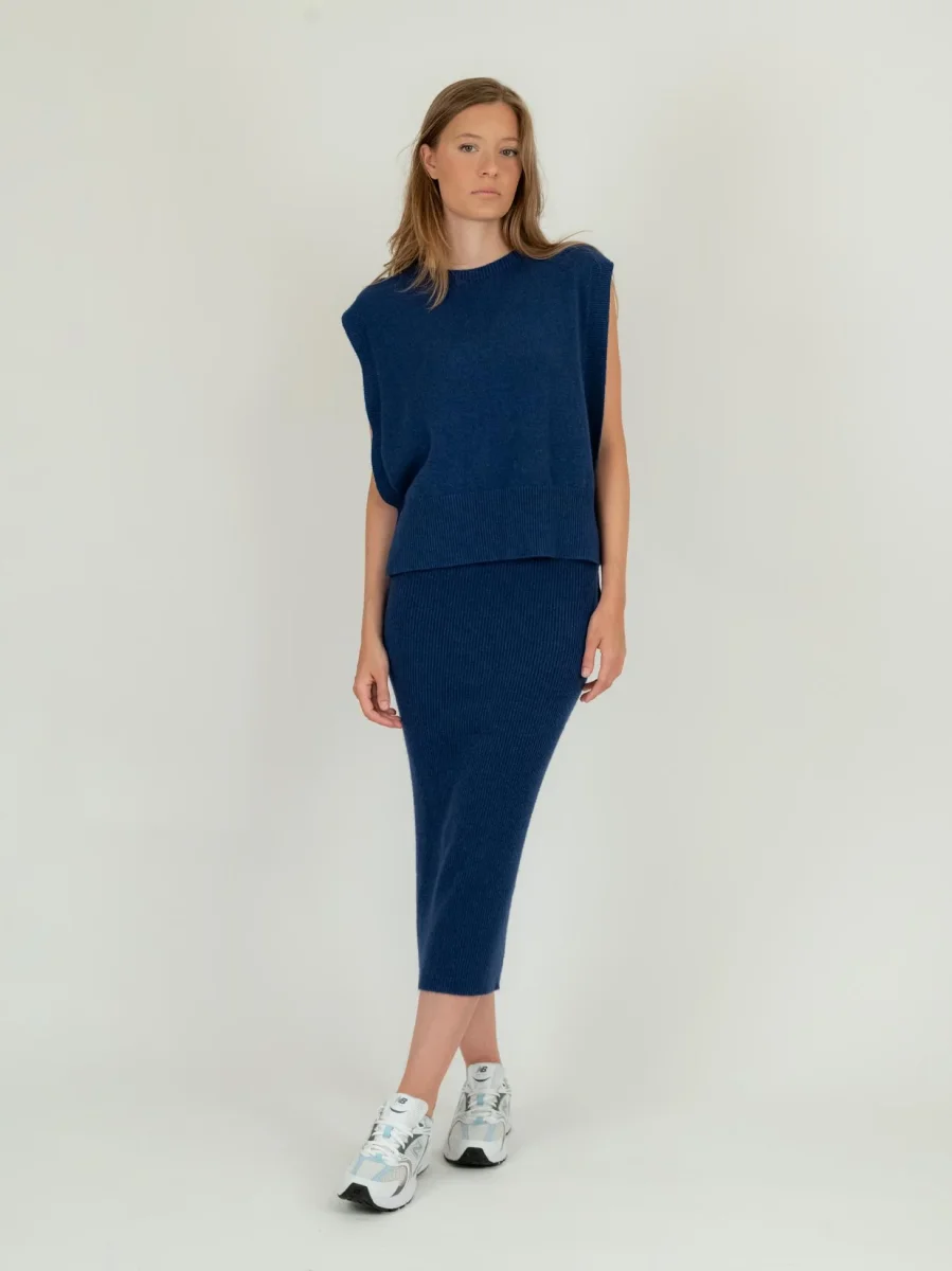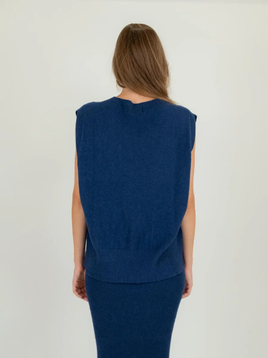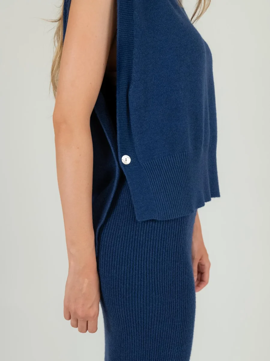 Gilet girocollo in maglia blu aperto lateralmente con retro asimmetrico.