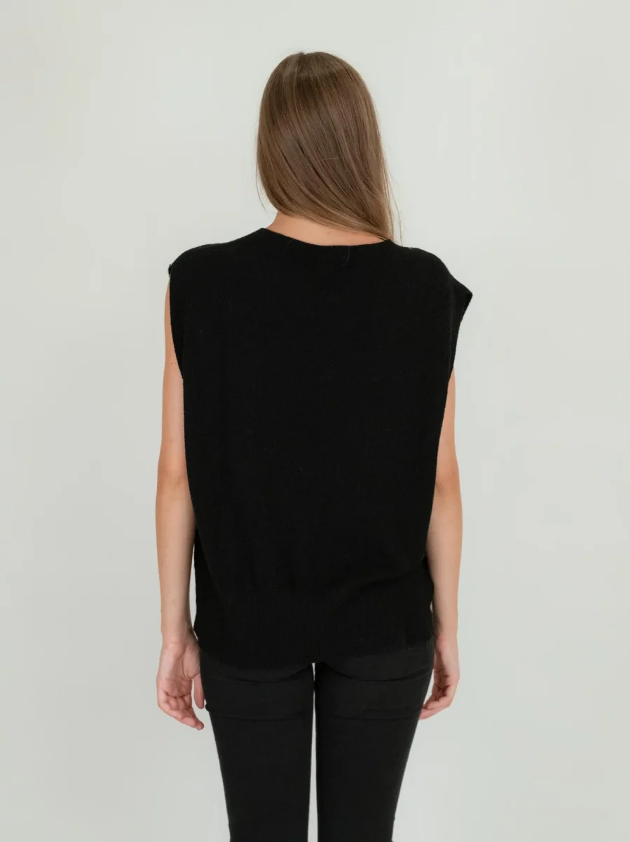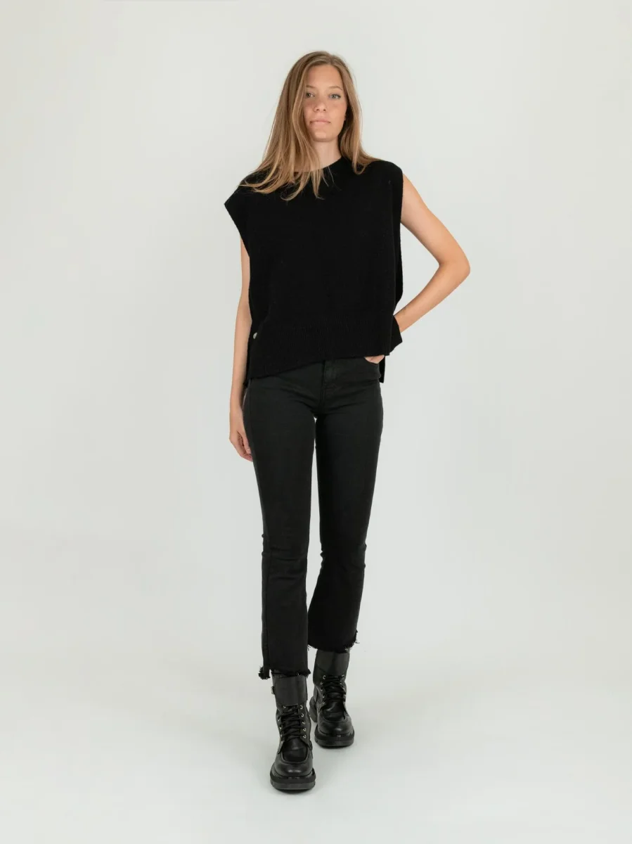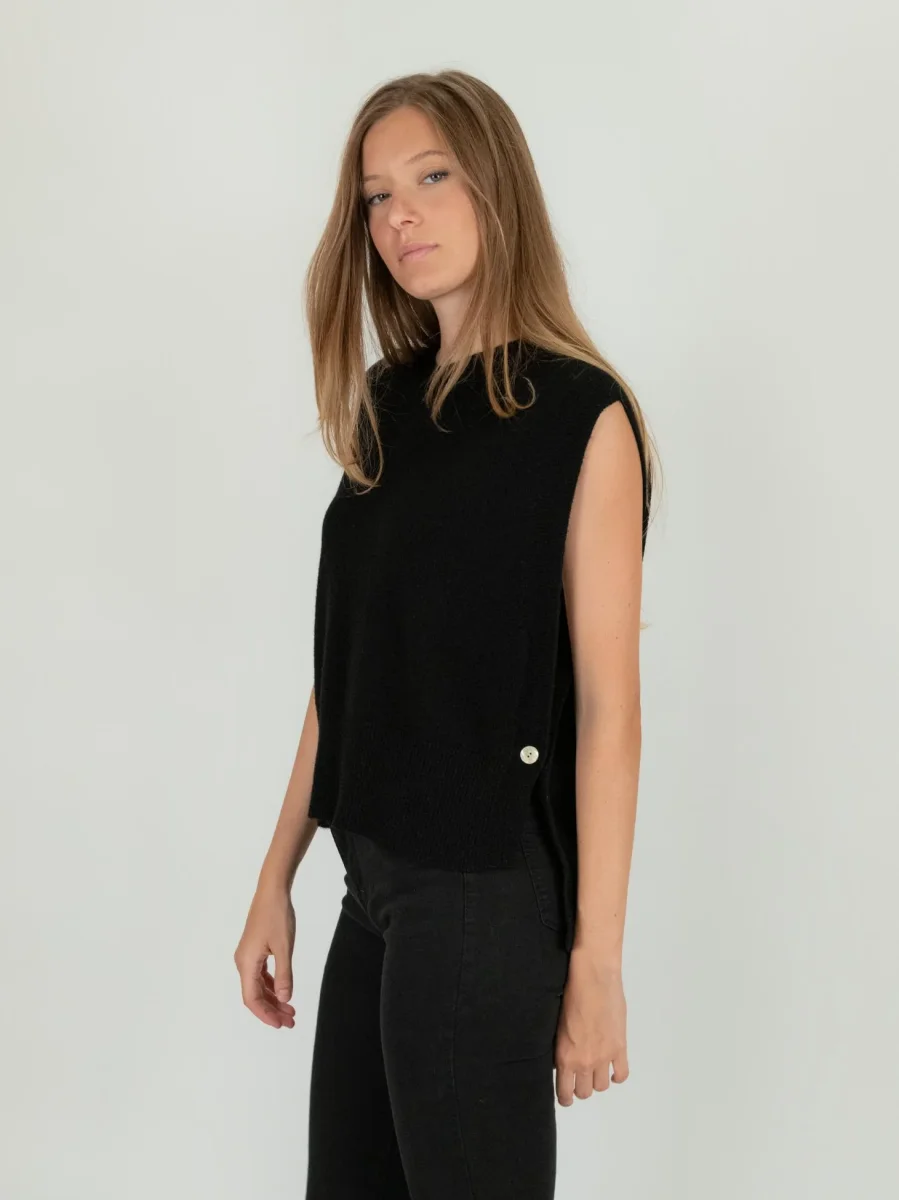 Casacca girocollo in maglia nera con apertura laterale e fondo sul retro asimmetrico.