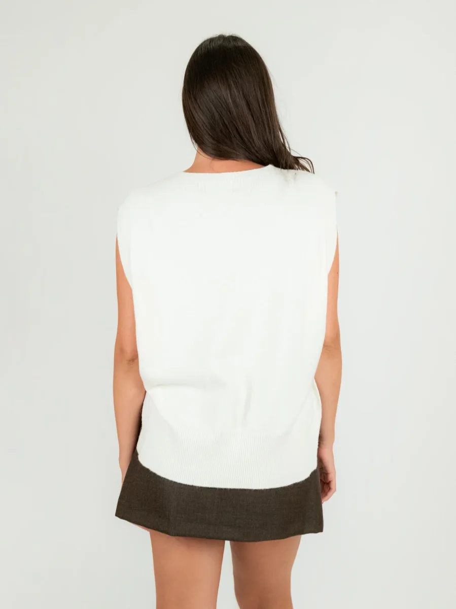 Gilet girocollo in maglia color panna aperto lateralmente con retro asimmetrico.