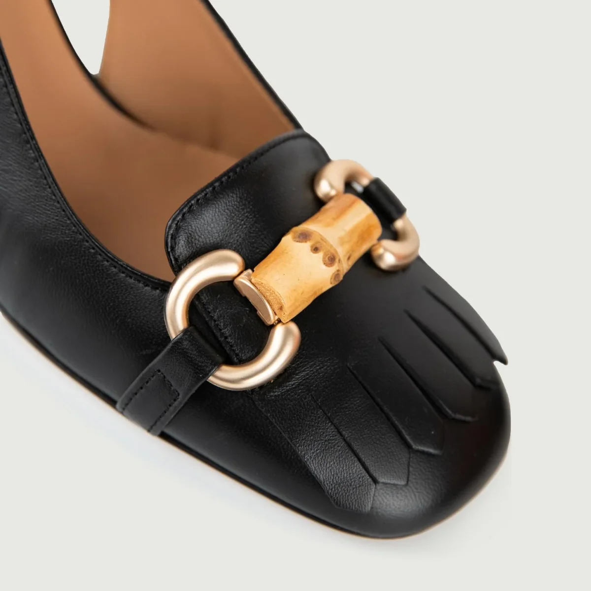 Dettaglio frontale in ottone e bamboo.