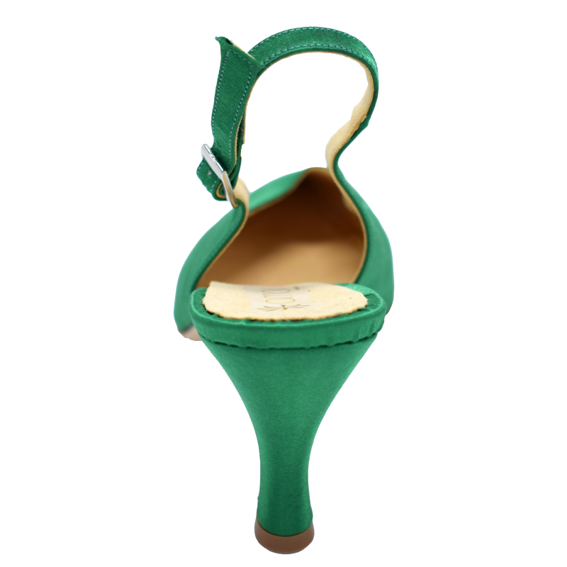 L’interno della tomaia e la soletta sono rivestite in pelle camoscino, la suola è in Vero Cuoio Italiano e il tacco è alto 8 cm.