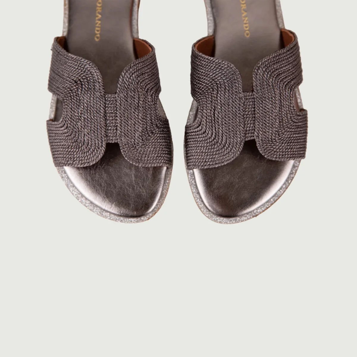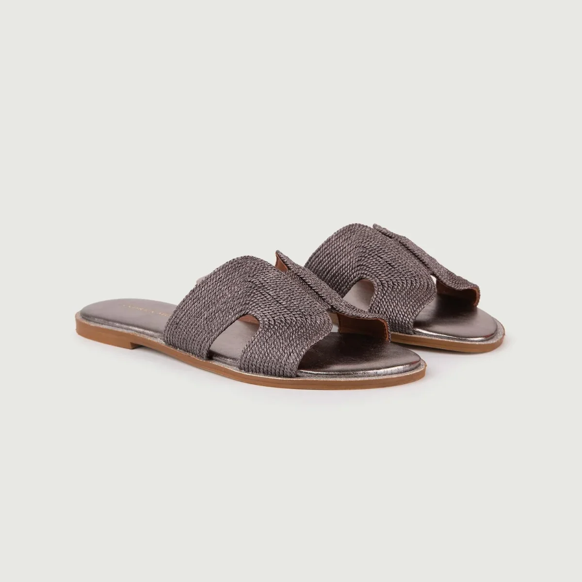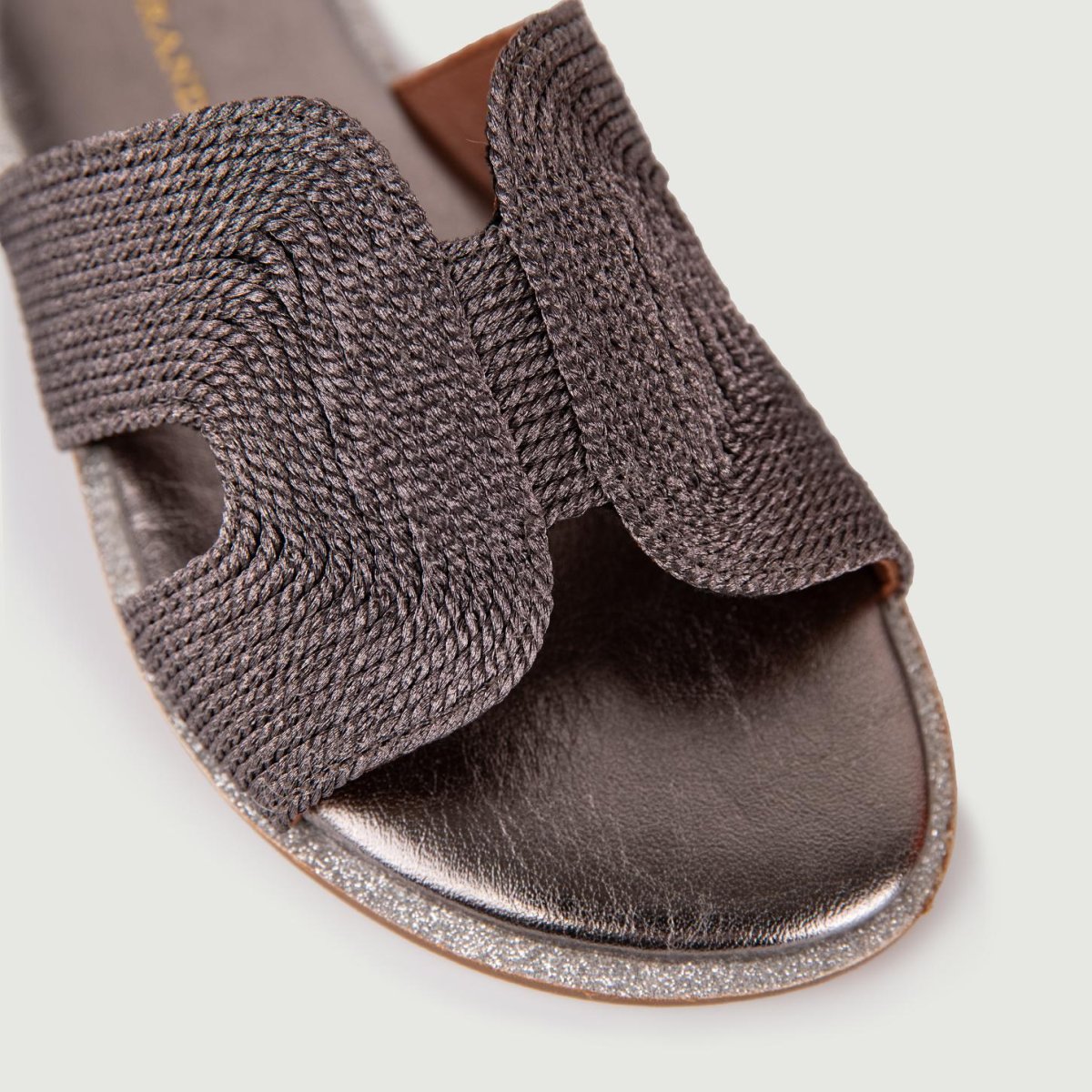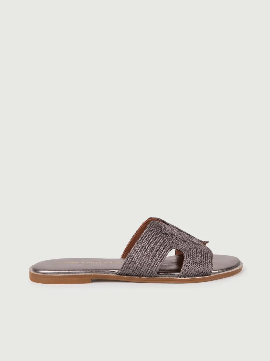 Ciabattina con fascia in tessuto intrecciato satinato e profili glitter canna di fucile.