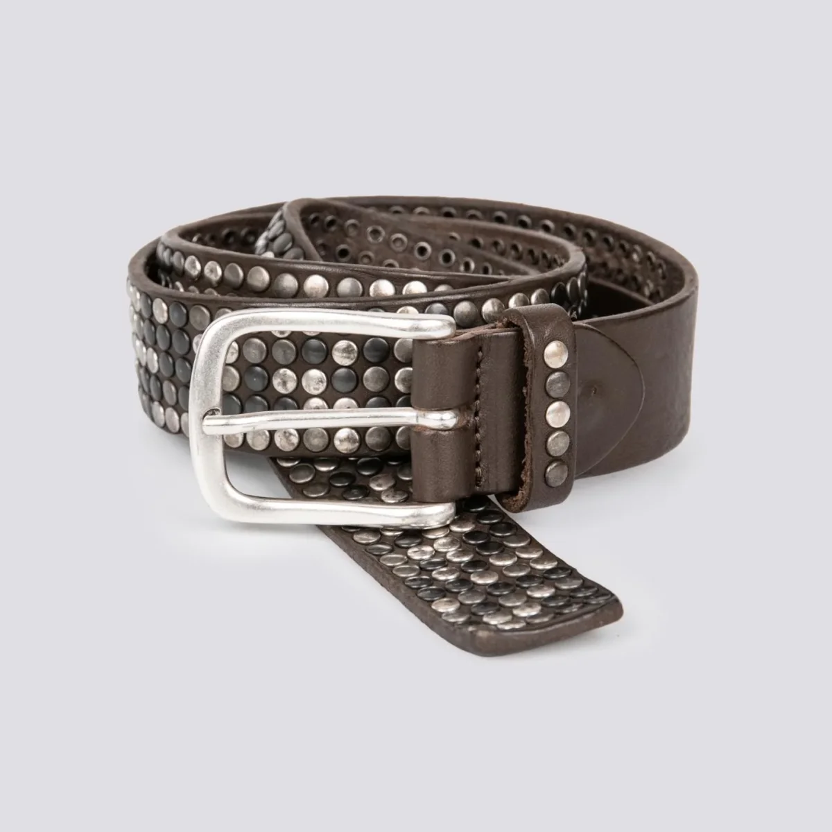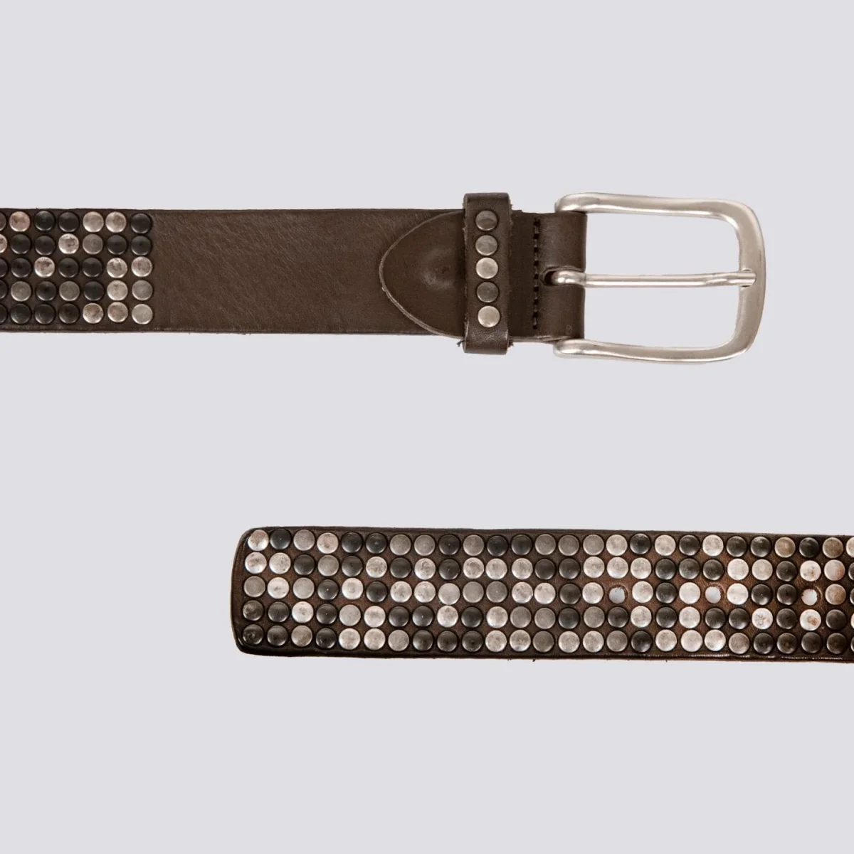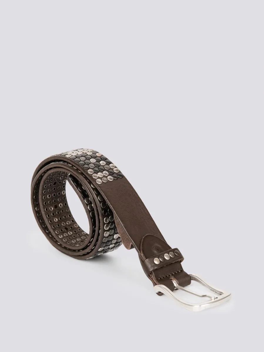 Cintura artigianale in pelle marrone con borchie applicate su tutta la lunghezza. Un accessorio che non può passare inosservato e che ti aiuterà ad aggiungere un tocco di grinta al tuo look. Disponibile in più misure a seconda del punto vita. Accessori in metallo.