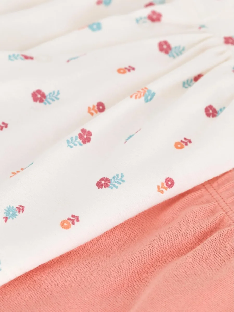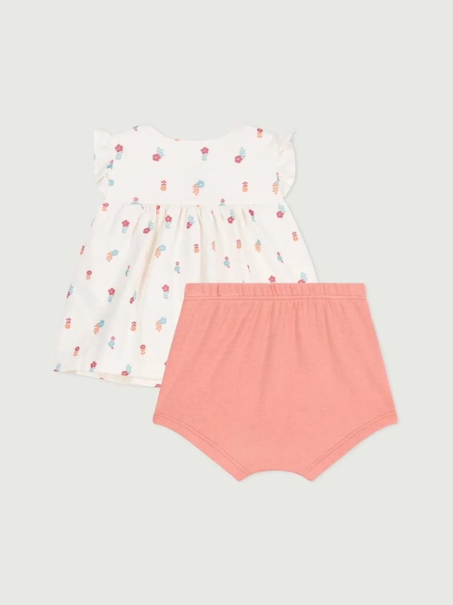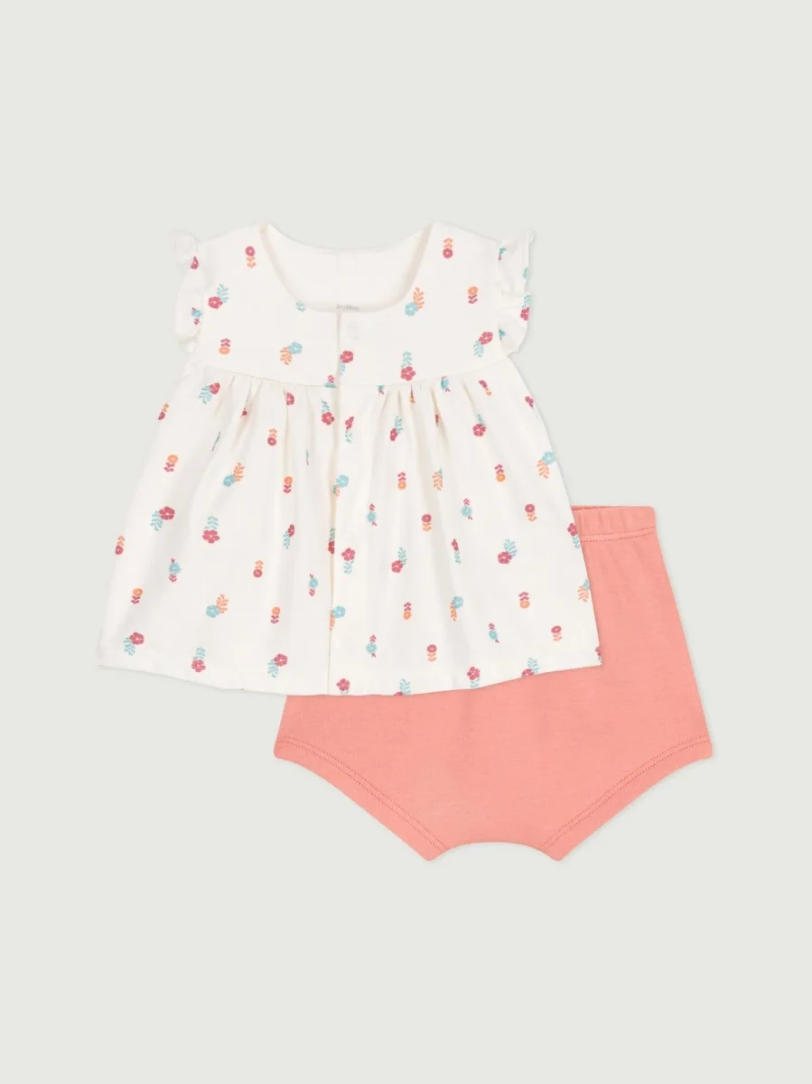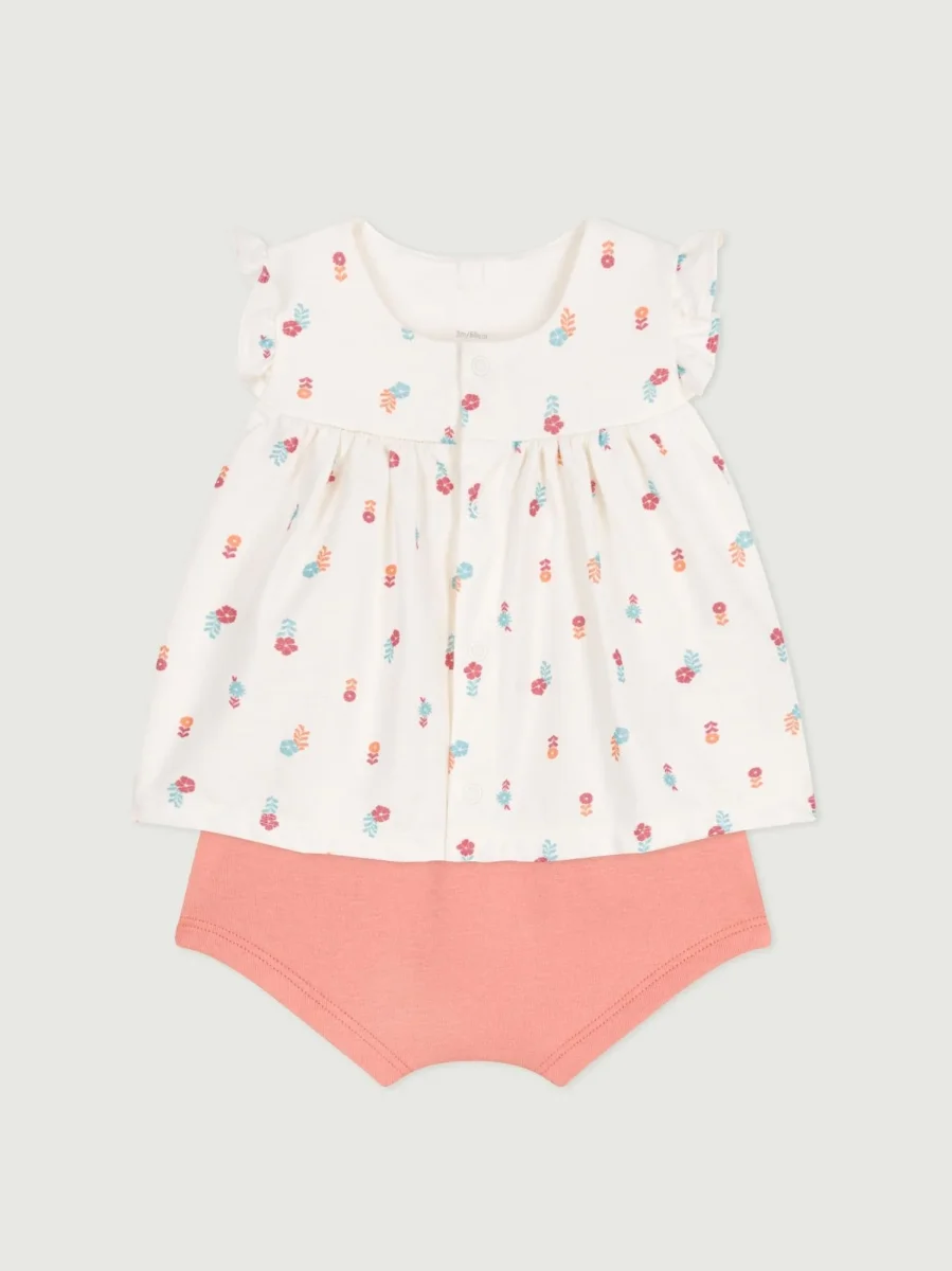 Completino due pezzi per bebè in cotone composto da una blusa a maniche corte con stampa foreale e pantaloncino.